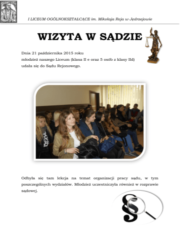 I LICEUM OGÓLNOKSZTAŁCĄCE im. Mikołaja Reja w Jędrzejowie WIZYTA W SĄDZIE Dnia 21 października 2015 roku młodzież naszego Liceum (klasa II e oraz 5 osób z klasy IId) udała się do Sądu Rejonowego. Odbyła się tam lekcja na temat organizacji pracy sądu, w tym poszczególnych wydziałów. Młodzież uczestniczyła również w rozprawie sądowej.
