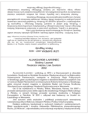 Pamięć kanclerza Lwa Sapiehy cieszy się wielkim uznaniem również mieszkańców współczesnej Białorusi, szczególniej wszakże tych, którzy dzieje swego kraju wywodzą od tradycji Wielkiego Księstwa Litewskiego i Rzeczypospolitej Obojga Narodów. L EW S APIEHA – k anclerz wielki litewski, wojewoda wileñski, hetman wielki litewski , u rodz ony na WitebszczyŸnie 4 kwietnia 1557 roku. Studiował w Lipsku, następnie pracował w kancelarii królewskiej Stefana Batorego u boku Jana Zamoyskiego. Popierał plany unii politycznej i kościelnej z Moskwą. Brał udział w wojnach Stefana Batorego i Zygmunta III, współinicjator i uczestnik wypraw na Moskwę. Prowadził kluczowe rokowania przed pokojem w Dywilinie (1618). Pełniąc obowiązki kanclerza uporządkował statuty i zreorganizował sądownictwo Wielkiego Księstwa. (Lew Sapieha, Statuty Wielkiego Ksiêstwa Litewskiego, 1588) Postrzegali to wszystkich wieków ludzie m¹drzy, ¿e w ka¿dej Rzeczypospolitej cz³owiekowi poczciwemu nic nie ma byæ dro¿szego nad wolnoœæ. A niewol¹ tak siê ma brzydziæ, ¿e nie tylko skarbami, ale i œmierci¹ onê od siebie odganiaæ powinien.... LEW SAPIEHA (1557 – 1633) Patron Nagrody ALIAKSANDR ŁAHVINIEC Siódmy Laureat NAGRODY IMIENIA LWA SAPIEHY 2012 ALIAKSANDR ŁAHVINIEC – politolog, ur. 1972 r. w Dworyszczach w obwodzie homelskim. Studiował na Wydziale Stosunków Międzynarodowych na Białoruskim Uniwersytecie Państwowym, następnie w Instytucie Nauk Politycznych w Strasburgu, gdzie uzyskał dyplom magistra w dziedzinie Badań Europejskich oraz w Centrum Badań Niemieckich na Uniwersytecie Roberta Schumana w Strasburgu, gdzie otrzymał stopień magistra w dziedzinie Badań nad Europą Środkową. Absolwent kursu specjalnego Akademii Dyplomatycznej w Warszawie. Od 13 lat wykładowca w Mińsku, Wilnie, Warszawie, Kansas. Od 2007 r. prowadzi zainicjowane przez siebie zajęcia dla niezależnego Kolegium Białoruskiego w Mińsku, w ramach którego prowadzi wymianę studencką z Kolegium Europejskim w Natolinie. W 2011 r. odbywał staż badawczy na Uczelni im. Łazarskiego w Warszawie. Jest autorem wielu artykułów i publikacji poświęconych wewnętrznej i zewnętrznej polityce Białorusi, relacjach Mińska z Polską i Unią Europejską. Działacz publiczny, kandydował w wyborach lokalnych i parlamentarnych. Bliski współpracownik i doradca Aleksandra Milinkiewicza, przewodniczącego Ruchu „Za Wolność”, odpowiedzialny za koordynację współpracy międzynarodowej.