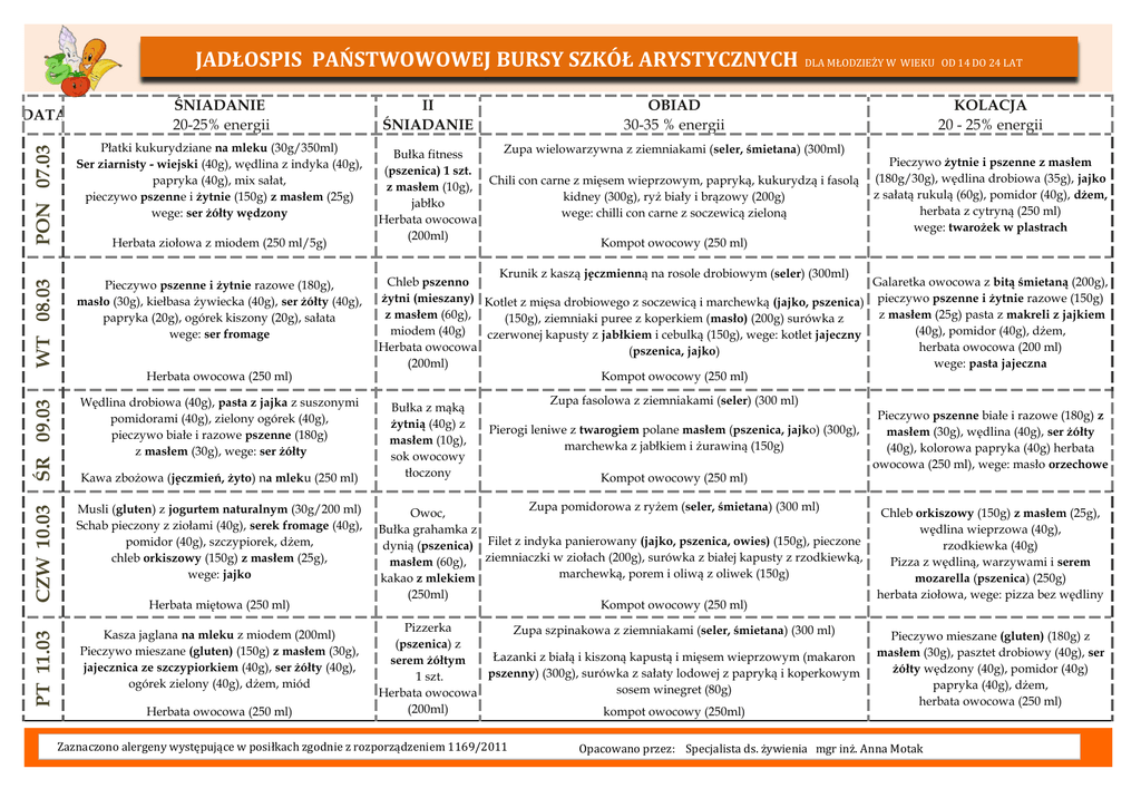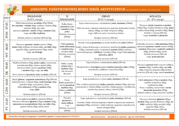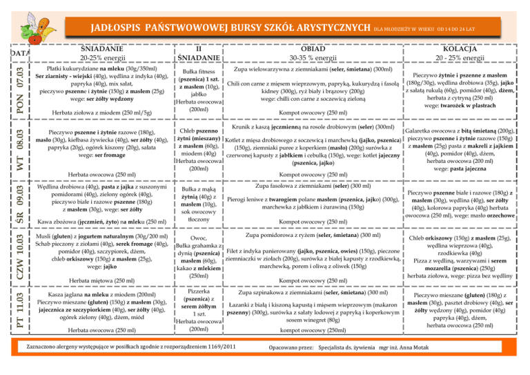 JADŁOSPIS PAŃSTWOWOWEJ BURSY SZKÓŁ ARYSTYCZNYCH PON 07.03 ŚNIADANIE 20-25% energii Płatki kukurydziane na mleku (30g/350ml) Ser ziarnisty - wiejski (40g), wędlina z indyka (40g), papryka (40g), mix sałat, pieczywo pszenne i żytnie (150g) z masłem (25g) wege: ser żółty wędzony WT 08.03 DATA Pieczywo pszenne i żytnie razowe (180g), masło (30g), kiełbasa żywiecka (40g), ser żółty (40g), papryka (20g), ogórek kiszony (20g), sałata wege: ser fromage Herbata ziołowa z miodem (250 ml/5g) ŚR 09.03 Wędlina drobiowa (40g), pasta z jajka z suszonymi pomidorami (40g), zielony ogórek (40g), pieczywo białe i razowe pszenne (180g) z masłem (30g), wege: ser żółty CZW 10.03 Musli (gluten) z jogurtem naturalnym (30g/200 ml) Schab pieczony z ziołami (40g), serek fromage (40g), pomidor (40g), szczypiorek, dżem, chleb orkiszowy (150g) z masłem (25g), wege: jajko PT 11.03 Herbata owocowa (250 ml) Kasza jaglana na mleku z miodem (200ml) Pieczywo mieszane (gluten) (150g) z masłem (30g), jajecznica ze szczypiorkiem (40g), ser żółty (40g), ogórek zielony (40g), dżem, miód Kawa zbożowa (jęczmień, żyto) na mleku (250 ml) Herbata miętowa (250 ml) Herbata owocowa (250 ml) II ŚNIADANIE DLA MŁODZIEŻY W WIEKU OD 14 DO 24 LAT OBIAD 30-35 % energii Zupa wielowarzywna z ziemniakami (seler, śmietana) (300ml) Bułka fitness (pszenica) 1 szt. Chili con carne z mięsem wieprzowym, papryką, kukurydzą i fasolą z masłem (10g), kidney (300g), ryż biały i brązowy (200g) jabłko wege: chilli con carne z soczewicą zieloną Herbata owocowa (200ml) Kompot owocowy (250 ml) KOLACJA 20 - 25% energii Pieczywo żytnie i pszenne z masłem (180g/30g), wędlina drobiowa (35g), jajko z sałatą rukulą (60g), pomidor (40g), dżem, herbata z cytryną (250 ml) wege: twarożek w plastrach Krunik z kaszą jęczmienną na rosole drobiowym (seler) (300ml) Galaretka owocowa z bitą śmietaną (200g), Chleb pszenno żytni (mieszany) Kotlet z mięsa drobiowego z soczewicą i marchewką (jajko, pszenica) pieczywo pszenne i żytnie razowe (150g) z masłem (60g), z masłem (25g) pasta z makreli z jajkiem (150g), ziemniaki puree z koperkiem (masło) (200g) surówka z miodem (40g) (40g), pomidor (40g), dżem, czerwonej kapusty z jabłkiem i cebulką (150g), wege: kotlet jajeczny Herbata owocowa herbata owocowa (200 ml) (pszenica, jajko) (200ml) wege: pasta jajeczna Kompot owocowy (250 ml) Bułka z mąką żytnią (40g) z masłem (10g), sok owocowy tłoczony Zupa fasolowa z ziemniakami (seler) (300 ml) Pierogi leniwe z twarogiem polane masłem (pszenica, jajko) (300g), marchewka z jabłkiem i żurawiną (150g) Kompot owocowy (250 ml) Pieczywo pszenne białe i razowe (180g) z masłem (30g), wędlina (40g), ser żółty (40g), kolorowa papryka (40g) herbata owocowa (250 ml), wege: masło orzechowe Zupa pomidorowa z ryżem (seler, śmietana) (300 ml) Owoc, Bułka grahamka z dynią (pszenica) Filet z indyka panierowany (jajko, pszenica, owies) (150g), pieczone ziemniaczki w ziołach (200g), surówka z białej kapusty z rzodkiewką, masłem (60g), marchewką, porem i oliwą z oliwek (150g) kakao z mlekiem (250ml) Kompot owocowy (250 ml) Chleb orkiszowy (150g) z masłem (25g), wędlina wieprzowa (40g), rzodkiewka (40g) Pizza z wędliną, warzywami i serem mozarella (pszenica) (250g) herbata ziołowa, wege: pizza bez wędliny Pizzerka Zupa szpinakowa z ziemniakami (seler, śmietana) (300 ml) (pszenica) z Łazanki z białą i kiszoną kapustą i mięsem wieprzowym (makaron serem żółtym pszenny) (300g), surówka z sałaty lodowej z papryką i koperkowym 1 szt. sosem winegret (80g) Herbata owocowa (200ml) kompot owocowy (250ml) Pieczywo mieszane (gluten) (180g) z masłem (30g), pasztet drobiowy (40g), ser żółty wędzony (40g), pomidor (40g) papryka (40g), dżem, herbata owocowa (250 ml) Zaznaczono alergeny występujące w posiłkach zgodnie z rozporządzeniem 1169/2011 Opacowano przez: Specjalista ds. żywienia mgr inż. Anna Motak