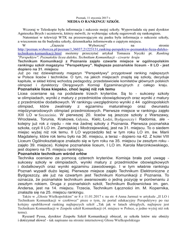Poznań, 11 stycznia 2017 r. MEDIA O RANKINGU SZKÓŁ Wczoraj w Teleskopie była informacja i sukcesie mojej szkoły. Wypowiadała się pani dyrektor Agnieszka Brych i uczniowie, którzy mówili, że wybierając szkołę sugerowali się rankongiem. Natomiast w telewizji WTK na przesuwającym się pasku była informacja o sukcesie szkoły, a wieczorem na tle budynku szkoły, dziennikarka informowała o zajętym miejscu. W „Gazecie Wyborczej” na stronie http://poznan.wyborcza.pl/poznan/1,36037,21223131,ranking-perspektyw-poznanskie-licea-dalekotechnikum-komunikacji.html możemy przeczytać artykuł Tomasza Nyczki pt. Ranking "Perspektyw". Poznańskie licea daleko, Technikum Komunikacji - czwarte kraju Technikum Komunikacji z Poznania zajęło czwarte miejsce w ogólnopolskim rankingu szkół magazynu "Perspektywy". Najlepsze poznańskie liceum - II LO - jest dopiero na 31. miejscu Już po raz dziewiętnasty magazyn "Perspektywy" przygotował ranking najlepszych w Polsce liceów i techników. O tym, na jakich miejscach znajdą się szkoły, decyduje kapituła, w skład której wchodzą pedagodzy, przedstawiciele komitetów głównych polskich olimpiad i dyrektorzy Okręgowych Komisji Egzaminacyjnych z całego kraju. Poznańskie licea kiepsko, choć lepiej niż rok temu Licea oceniane są na podstawie trzech kryteriów. Są to - sukcesy szkoły w olimpiadach, wyniki z matury z przedmiotów obowiązkowych oraz wyniki z matury z przedmiotów dodatkowych. W rankingu uwzględniono wyniki z 44 ogólnopolskich olimpiad, które zwalniały z egzaminu maturalnego oraz dwunastu międzynarodowych olimpiad przedmiotowych. Pierwsze miejsce w rankingu zajęło XIII LO w Szczecinie. W pierwszej 20. liceów są jeszcze szkoły z Warszawy, Wrocławia, Torunia, Krakowa, Gdynia, Kielc, Łodzi, Bydgoszczy i Radomia, ale kolejny już rok z rzędu - nie ma żadnej szkoły z Poznania. Pierwsza poznańska szkoła, czyli II LO im. Zamojskiej i Modrzejewskiej, jest na 31. miejscu. To o siedem miejsc wyżej niż rok temu. II LO wyprzedziło też w tym roku LO im. św. Marii Magdaleny, które rok temu było na 36. miejscu, a teraz - dopiero na 42. Z kolei VIII Liceum Ogólnokształcące znalazło się w tym roku na 35. miejscu (w zeszłym roku zajęło 39. miejsce). Kolejne poznańskie liceum, I LO im. Karola Marcinkowskiego, jest dopiero na 75. miejscu rankingu. Poznańskie technikum wśród orłów Technika oceniano za pomocą czterech kryteriów. Komisja brała pod uwagę sukcesy szkoły w olimpiadach, wyniki matury z przedmiotów obowiązkowych i dodatkowych oraz wyniki egzaminu zawodowego. I w tym właśnie rankingu Poznań wypadł dużo lepiej. Pierwsze miejsce zajęło Technikum Elektroniczne z Bydgoszczy, ale już na czwartym jest Technikum Komunikacji z Poznania. To oznacza, że poznańskie technikum awansowało o jedną pozycję w porównaniu z zeszłym rokiem. Druga z poznańskich szkół, Technikum Budownictwa im. gen. Andersa, jest na 14. miejscu. Trzecia, Technikum Łączności im. M. Kopernika, znalazła się na 25. miejscu rankingu. Także w „Głosie Wielkopolskim” nr 8 z 11.01.2017 r. na str. 4 Anna Jarmuż w artykule „II LO i Technikum Komunikacji w czołówce” pisze o tym, że portal edukacyjny Perspektywy po raz kolejny opublikował ranking najlepszych szkół „Tak jak w latach ubiegłych, najlepsze jest Technikum Komunikacji w Zespole szkół Komunikacji (4. miejsce w Polsce, o jedno wyżej niż rok temu). Ryszard Pyssa, dyrektor Zespołu Szkół Komunikacji obiecał, ze szkoła lotów nie obniży i dotrzymał słowa! - tak napisano na stronie internetowej Głosu Wielkopolskiego