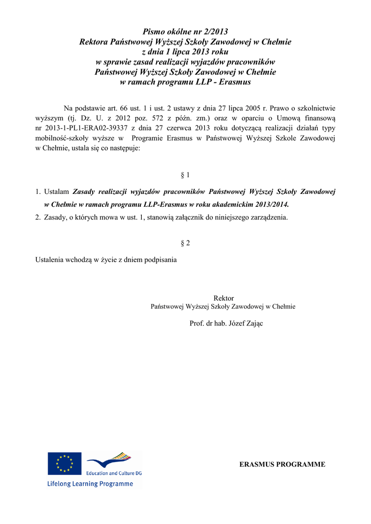 Pismo okólne nr 2/2013 Rektora Państwowej Wyższej Szkoły Zawodowej w Chełmie z dnia 1 lipca 2013 roku w sprawie zasad realizacji wyjazdów pracowników Państwowej Wyższej Szkoły Zawodowej w Chełmie w ramach programu LLP - Erasmus Na podstawie art. 66 ust. 1 i ust. 2 ustawy z dnia 27 lipca 2005 r. Prawo o szkolnictwie wyższym (tj. Dz. U. z 2012 poz. 572 z późn. zm.) oraz w oparciu o Umową finansową nr 2013-1-PL1-ERA02-39337 z dnia 27 czerwca 2013 roku dotyczącą realizacji działań typy mobilność-szkoły wyższe w Programie Erasmus w Państwowej Wyższej Szkole Zawodowej w Chełmie, ustala się co następuje: §1 1. Ustalam Zasady realizacji wyjazdów pracowników Państwowej Wyższej Szkoły Zawodowej w Chełmie w ramach programu LLP-Erasmus w roku akademickim 2013/2014. 2. Zasady, o których mowa w ust. 1, stanowią załącznik do niniejszego zarządzenia. §2 Ustalenia wchodzą w życie z dniem podpisania Rektor Państwowej Wyższej Szkoły Zawodowej w Chełmie Prof. dr hab. Józef Zając ERASMUS PROGRAMME Załącznik do Pisma okólnego nr 2/2013 Rektora PWSZ w Chełmie Zasady realizacji wyjazdów pracowników Państwowej Wyższej Szkoły Zawodowej w Chełmie w ramach programu LLP ERASMUS w roku akademickim 2013/2014 A) ZASADY REALIZACJI WYJAZDÓW NAUCZYCIELI AKADEMICKICH W CELU PROWADZENIA ZAJĘĆ DYDAKTYCZNYCH (STA) W RAMACH PROGRAMU LLP-ERASMUS W ROKU AKADEMICKIM 2013/2014 I. Ogólne warunki wyjazdów 1. Wymiana nauczycieli akademickich może być realizowana wyłącznie z uczelnią posiadającą Kartę Uczelni Erasmusa ważną w roku akademickim 2013/2014, z którą PWSZ w Chełmie posiada podpisaną umowę bilateralną w ramach programu LLPErasmus, przewidującą wymianę nauczycieli akademickich na danym kierunku (załącznik nr 1). 2. Pobyt nauczyciela akademickiego w uczelni partnerskiej w ramach programu LLPErasmus musi być zrealizowany w roku akademickim 2013/2014. Wymagana długość wyjazdu to minimum 5 dni roboczych pobytu z wyłączeniem sobót (rozumianych jako 5 pełnych dób, finansowanych) oraz 2 dni podróży przeznaczone na dojazd i powrót (niefinansowanych). W wyjątkowych przypadkach dopuszcza się krótszy wyjazd. Nauczyciel akademicki jest zobowiązany do przeprowadzenia co najmniej 5 godzin zajęć dydaktycznych dla studentów uczelni przyjmującej. 3. Celem wyjazdu nauczyciela akademickiego jest przeprowadzenie zajęć dydaktycznych dla studentów uczelni partnerskiej. Przed wyjazdem nauczyciela akademickiego do uczelni partnerskiej pomiędzy stronami powinien zostać uzgodniony program zajęć prowadzonych przez nauczyciela akademickiego w uczelni partnerskiej – „Indywidualny program nauczania” (Individual Teaching Programme). „Indywidualny program nauczania” określa m.in: zakładane cele nauczania, zawartość programu zajęć oraz oczekiwane rezultaty. 4. Z każdym nauczycielem akademickim zakwalifikowanym na wyjazd w programie LLPErasmus zostanie zawarta umowa finansowa. 5.Przekazanie stypendium nauczycielowi akademickiemu może nastąpić tylko pod warunkiem zaakceptowania przez nauczyciela wszystkich warunków umowy. 6.Stypendium otrzymane przez nauczyciela akademickiego jest przeznaczone na dofinansowanie kosztów związanych z pobytem w uczelni partnerskiej. Stypendium ma charakter uzupełniający i nie musi pokrywać pełnych kosztów pobytu. 7.Wysokość stypendium określona jest w formie ryczałtowej stawki dziennej na dany kraj uczestniczący w programie (załącznik nr 2). 8.Nauczyciel akademicki nie może ubiegać się o inne stypendium/grant na pokrycie tych samych kosztów związanych z wyjazdem z innych programów wspólnotowych lub z innych inicjatyw Komisji Europejskiej. ERASMUS PROGRAMME 9.Osoby niepełnosprawne z orzeczonym stopniem niepełnosprawności mogą ubiegać się o dodatkowe środki ze specjalnego funduszu przeznaczonego dla osób niepełnosprawnych. II. Akcja informacyjna i procedura naboru 1. Nabór kandydatów na wyjazdy w roku akademickim 2013/2014 będzie prowadzony w dwóch etapach: pierwszym, trwającym od 01.09.2013 do 13.09.2013 (wyjazdy w semestrze zimowym) oraz drugim, trwającym od 05.11.2013 do 28.11.2013 – (wyjazdy w semestrze letnim). Szczegółowe informacje będą dostępne w Internecie na stronie programu LLP-Erasmus http://www.pwsz.chelm.pl/Erasmus oraz rozesłane pocztą e-mail do pracowników dydaktycznych Uczelni. 2. Zasady kwalifikacji nauczycieli akademickich zostały zharmonizowane z polityką uczelni w zakresie rozwoju kadry dydaktycznej. W procedurze kwalifikacyjnej zapewniona będzie równość szans kobiet i mężczyzn oraz osób niepełnosprawnych. III. Kryteria uprawniające do ubiegania się o stypendium: O stypendium mogą ubiegać się nauczyciele akademiccy, którzy: 1) są pracownikami dydaktycznymi PWSZ w Chełmie, 2) ubiegają się o wyjazd do uczelni i na kierunek studiów, z którym PWSZ w Chełmie podpisała umowę LLP-Erasmus (załącznik nr 1). IV. Wymagane dokumenty: 1. Nauczyciel akademicki zobowiązany jest przedłożyć za pośrednictwem koordynatora programu Erasmus następujące dokumenty: 1) list motywacyjny skierowany do Prorektora ds. studiów i nauczania, zaparafowany przez kierownika właściwej katedry; 2) formularz zgłoszeniowy, podpisany przez wskazane osoby (załącznik nr 3); 3) indywidualny program nauczania, podpisany przez wskazane osoby (załącznik nr 4). 2. Nauczyciel akademicki ponosi odpowiedzialność za wiarygodność i rzetelność informacji zawartych w formularzu zgłoszeniowym oraz w innych dokumentach przedkładanych w toku postępowania kwalifikacyjnego. V. Kryteria kwalifikacji oraz procedura wyboru kandydatów: 1.Ocena indywidualnego programu nauczania: program będzie pozytywnie oceniony, jeśli będzie kompletny oraz zaakceptowany w formie podpisów przez osoby wskazane w załączniku nr 4. 2.Pierwszeństwo podczas kwalifikacji do przyznania stypendium będą mieli nauczyciele akademiccy, którzy po raz pierwszy ubieg