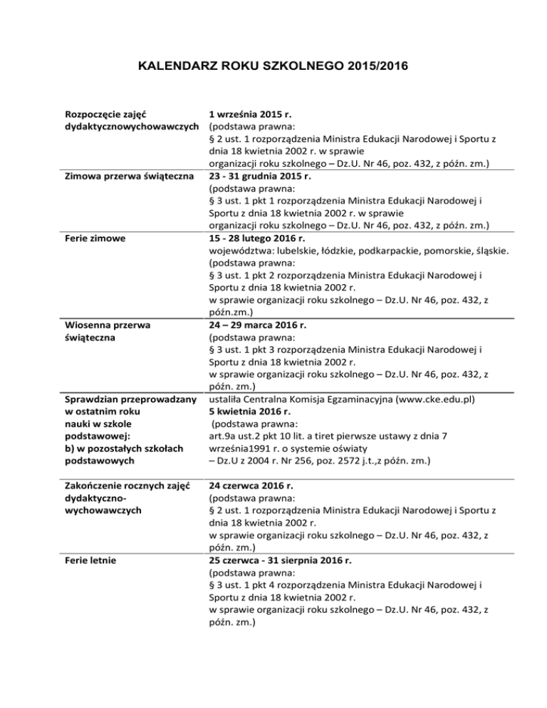 KALENDARZ ROKU SZKOLNEGO 2015/2016 Rozpoczęcie zajęć 1 września 2015 r. dydaktycznowychowawczych (podstawa prawna: § 2 ust. 1 rozporządzenia Ministra Edukacji Narodowej i Sportu z dnia 18 kwietnia 2002 r. w sprawie organizacji roku szkolnego – Dz.U. Nr 46, poz. 432, z późn. zm.) Zimowa przerwa świąteczna 23 - 31 grudnia 2015 r. (podstawa prawna: § 3 ust. 1 pkt 1 rozporządzenia Ministra Edukacji Narodowej i Sportu z dnia 18 kwietnia 2002 r. w sprawie organizacji roku szkolnego – Dz.U. Nr 46, poz. 432, z późn. zm.) Ferie zimowe 15 - 28 lutego 2016 r. województwa: lubelskie, łódzkie, podkarpackie, pomorskie, śląskie. (podstawa prawna: § 3 ust. 1 pkt 2 rozporządzenia Ministra Edukacji Narodowej i Sportu z dnia 18 kwietnia 2002 r. w sprawie organizacji roku szkolnego – Dz.U. Nr 46, poz. 432, z późn.zm.) Wiosenna przerwa 24 – 29 marca 2016 r. świąteczna (podstawa prawna: § 3 ust. 1 pkt 3 rozporządzenia Ministra Edukacji Narodowej i Sportu z dnia 18 kwietnia 2002 r. w sprawie organizacji roku szkolnego – Dz.U. Nr 46, poz. 432, z późn. zm.) Sprawdzian przeprowadzany ustaliła Centralna Komisja Egzaminacyjna (www.cke.edu.pl) 5 kwietnia 2016 r. w ostatnim roku (podstawa prawna: nauki w szkole art.9a ust.2 pkt 10 lit. a tiret pierwsze ustawy z dnia 7 podstawowej: września1991 r. o systemie oświaty b) w pozostałych szkołach – Dz.U z 2004 r. Nr 256, poz. 2572 j.t.,z późn. zm.) podstawowych Zakończenie rocznych zajęć dydaktycznowychowawczych Ferie letnie 24 czerwca 2016 r. (podstawa prawna: § 2 ust. 1 rozporządzenia Ministra Edukacji Narodowej i Sportu z dnia 18 kwietnia 2002 r. w sprawie organizacji roku szkolnego – Dz.U. Nr 46, poz. 432, z późn. zm.) 25 czerwca - 31 sierpnia 2016 r. (podstawa prawna: § 3 ust. 1 pkt 4 rozporządzenia Ministra Edukacji Narodowej i Sportu z dnia 18 kwietnia 2002 r. w sprawie organizacji roku szkolnego – Dz.U. Nr 46, poz. 432, z późn. zm.)