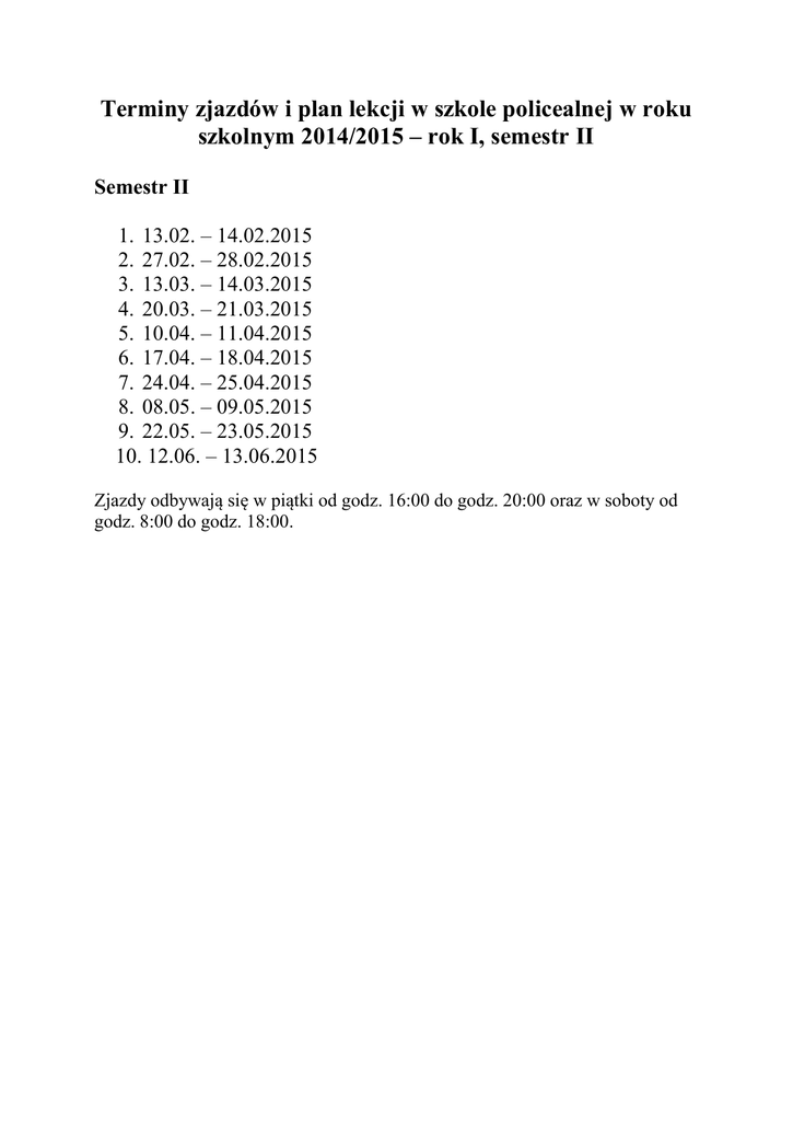 Terminy zjazdów i plan lekcji w szkole policealnej w roku szkolnym 2014/2015 – rok I, semestr II Semestr II 1. 13.02. – 14.02.2015 2. 27.02. – 28.02.2015 3. 13.03. – 14.03.2015 4. 20.03. – 21.03.2015 5. 10.04. – 11.04.2015 6. 17.04. – 18.04.2015 7. 24.04. – 25.04.2015 8. 08.05. – 09.05.2015 9. 22.05. – 23.05.2015 10. 12.06. – 13.06.2015 Zjazdy odbywają się w piątki od godz. 16:00 do godz. 20:00 oraz w soboty od godz. 8:00 do godz. 18:00. Zjazd I 13.02.2015 piątek Godzina 16:00-16:45 16:45-17:30 17:35-18:20 18:25-19:10 19:15-20:00 Przedmiot Postępowanie w administracji Postępowanie w administracji Postępowanie w administracji Podstawy prawa administracyjnego Podstawy prawa administracyjnego Wykładowca A. Szczepaniak A. Szczepaniak A. Szczepaniak A. Jaćkowska A. Jaćkowska 14.02.2015 sobota Godzina 8:00-8:45 8:45-9:30 9:40-10:25 10:25:11:10 11:20-12:05 12:05-12:50 13:00-13:45 13:45-14:30 14:40-15:25 15:25-16:10 16:20-17:05 17:05-17:50 Przedmiot Postępowanie w administracji Postępowanie w administracji Postępowanie w administracji Postępowanie w administracji Podstawy prawa administracyjnego Podstawy prawa administracyjnego Podstawy prawa administracyjnego Podstawy prawa administracyjnego Język angielski zawodowy Język angielski zawodowy Podstawy prawa cywilnego Podstawy prawa cywilnego Wykładowca A. Szczepaniak A. Szczepaniak A. Szczepaniak A. Szczepaniak A. Jaćkowska A. Jaćkowska A. Jaćkowska A. Jaćkowska I. Dudaczyk - Mareczek I. Dudaczyk - Mareczek V. Wysocka V. Wysocka Zjazd II 27.02.2015 piątek Godzina 16:00-16:45 16:45-17:30 17:35-18:20 18:25-19:10 19:15-20:00 Przedmiot Postępowanie w administracji. Postępowanie w administracji Działalność gospodarcza w jed.org. Działalność gospodarcza w jed.org. Działalność gospodarcza w jed.org. Wykładowca A. Szczepaniak A. Szczepaniak V. Wysocka V. Wysocka V. Wysocka 28.02.2015 sobota Godzina 8:00-8:45 8:45-9:30 9:40-10:25 10:25:11:10 11:20-12:05 12:05-12:50 13:00-13:45 13:45-14:30 14:40-15:25 15:25-16:10 16:20-17:05 17:05-17:50 Przedmiot Postępowanie w administracji Postępowanie w administracji Postępowanie w administracji Postępowanie w administracji Podstawy prawa cywilnego Podstawy prawa cywilnego Podstawy prawa cywilnego Podstawy prawa cywilnego Podstawy prawa pracy Podstawy prawa pracy Język angielski zawodowy Język angielski zawodowy Wykładowca A. Szczepaniak A. Szczepaniak A. Szczepaniak A. Szczepaniak V. Wysocka V. Wysocka V. Wysocka V. Wysocka A. Jaćkowska A. Jaćkowska I. Dudaczyk - Mareczek I. Dudaczyk - Mareczek Zjazd III 13.03.2015 piątek Godzina 16:00-16:45 16:45-17:30 17:35-18:20 18:25-19:10 19:15-20:00 Przedmiot Postępowanie w administracji Postępowanie w administracji Postępowanie w administracji Podstawy prawa pracy Podstawy prawa pracy Wykładowca A. Szczepaniak A. Szczepaniak A. Szczepaniak A. Jaćkowska A. Jaćkowska 14.03.2015 sobota Godzina 8:00-8:45 8:45-9:30 9:40-10:25 10:25:11:10 11:20-12:05 12:05-12:50 13:00-13:45 13:45-14:30 14:40-15:25 15:25-16:10 16:20-17:05 17:05-17:50 Przedmiot Postępowanie w administracji Postępowanie w administracji Postępowanie w administracji Postępowanie w administracji Podstawy prawa administracyjnego Podstawy prawa administracyjnego Podstawy prawa administracyjnego Podstawy prawa administracyjnego Wykonywanie prac biurowych Wykonywanie prac biurowych Postępowanie w administracji Postępowanie w administracji Wykładowca A. Szczepaniak A. Szczepaniak A. Szczepaniak A. Szczepaniak A. Jaćkowska A. Jaćkowska A. Jaćkowska A. Jaćkowska S. Moroza S. Moroza A. Szczepaniak A. Szczepaniak Zjazd IV 20.03.2015 piątek Godzina 16:00-16:45 16:45-17:30 17:35-18:20 18:25-19:10 19:15-20:00 Przedmiot Działalność gospodarcza w jed.org. Działalność gospodarcza w jed.org. Działalność gospodarcza w jed.org. Postępowanie w administracji Postępowanie w administracji Wykładowca V. Wysocka V. Wysocka V. Wysocka A. Szczepaniak A. Szczepaniak 21.03.2015 sobota Godzina 8:00-8:45 8:45-9:30 9:40-10:25 10:25:11:10 11:20-12:05 12:05-12:50 13:00-13:45 13:45-14:30 14:40-15:25 15:25-16:10 16:20-17:05 17:05-17:50 Przedmiot Wykonywanie pracy biurowej Wykonywanie pracy biurowej Wykonywanie pracy biurowej Wykonywanie pracy biurowej Podstawy prawa cywilnego Podstawy prawa cywilnego Podstawy prawa cywilnego Podstawy prawa cywilnego Podstawy finansów publicznych Podstawy finansów publicznych Wykonywanie pracy biurowej Wykonywanie pracy biurowej Wykładowca S. Moroza S. Moroza S. Moroza S. Moroza V. Wysocka V. Wysocka V. Wysocka V. Wysocka V. Wysocka V. Wysocka S. Moroza S. Moroza Zjazd V 10.04.2015 piątek Godzina 16:00-16:45 16:45-17:30 17:35-18:20 18:25-19:10 19:15-20:00 Przedmiot Postępowanie w administracji Postępowanie w administracji Postępowanie w administracji Podstawy prawa pracy Podstawy prawa pracy Wykładowca A. Szczepaniak A. Szczepaniak A. Szczepaniak A. Jaćkowska A. Jaćkowska 11.04.2015 sobota Godzina 8:00-8:45 8:45-9:30 9:40-10:25 10:25:11:10 11:20-12:05 12:05-12:50 13:00-13:45 13:45-14:30 14:40-15:25 15:25-16:10 16:20-17:05 17:05-17:50 Przedmiot Postępowanie w administracji Postępowanie w administracji Postępowanie w administracji Postępowanie w administracji Postępowanie w administracji Podstawy prawa administracyjnego Podstawy prawa administracyjnego Podstawy prawa administracyjnego Podstawy prawa administracyjnego Podstawy prawa administracyjnego Wykładowca A. Szczepaniak A. Szczepaniak A. Szczepaniak A. Szczepaniak A. Szczepaniak A. Jaćkowska A. Jaćkowska A. Jaćkowska A. Jaćkowska A. Jaćkowska Zjazd VI 17.04.2015 piątek Godzina 16:00-16:45 16:45-17:30 17:35-18:20 18:25-19:10 19:15-20:00 Przedmiot Wykonywanie pracy biurowej Wykonywanie pracy biurowej Wykonywanie pracy biurowej Postępowanie w administracji Postępowanie w administracji Wykładowca S. Moroza S. Moroza S. Moroza A. Szczepaniak a. Szczepaniak 18.04.2015 sobota Godzina 8:00-8:45 8:45-9:30 9:40-10:25 10:25:11:10 11:20-12:05 12:05-12:50 13:00-13:4