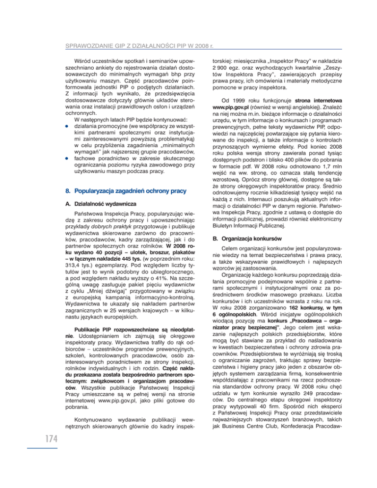 SPRAWOZDANIE GIP Z DZIAŁALNOŚCI PIP W 2008 r. Wśród uczestników spotkań i seminariów upowszechniano ankiety do rejestrowania działań dostosowawczych do minimalnych wymagań bhp przy użytkowaniu maszyn. Część pracodawców poinformowała jednostki PIP o podjętych działaniach. Z informacji tych wynikało, że przedsięwzięcia dostosowawcze dotyczyły głównie układów sterowania oraz instalacji prawidłowych osłon i urządzeń ochronnych. W następnych latach PIP będzie kontynuować: działania promocyjne (we współpracy ze wszystkimi partnerami społecznymi oraz instytucjami zainteresowanymi powyższą problematyką) w celu przybliżenia zagadnienia „minimalnych wymagań” jak najszerszej grupie pracodawców, fachowe poradnictwo w zakresie skutecznego ograniczania poziomu ryzyka zawodowego przy użytkowaniu maszyn podczas pracy. 8. Popularyzacja zagadnień ochrony pracy A. Działalność wydawnicza Państwowa Inspekcja Pracy, popularyzując wiedzę z zakresu ochrony pracy i upowszechniając przykłady dobrych praktyk przygotowuje i publikuje wydawnictwa skierowane zarówno do pracowników, pracodawców, kadry zarządzającej, jak i do partnerów społecznych oraz rolników. W 2008 roku wydano 40 pozycji – ulotek, broszur, plakatów – w łącznym nakładzie 445 tys. (w poprzednim roku: 313,4 tys.) egzemplarzy. Pod względem liczby tytułów jest to wynik podobny do ubiegłorocznego, a pod względem nakładu wyższy o 41%. Na szczególną uwagę zasługuje pakiet pięciu wydawnictw z cyklu „Mniej dźwigaj” przygotowany w związku z europejską kampanią informacyjno-kontrolną. Wydawnictwa te ukazały się nakładem partnerów zagranicznych w 25 wersjach krajowych – w kilkunastu językach europejskich. Publikacje PIP rozpowszechniane są nieodpłatnie. Udostępnianiem ich zajmują się okręgowe inspektoraty pracy. Wydawnictwa trafiły do rąk odbiorców – uczestników programów prewencyjnych, szkoleń, kontrolowanych pracodawców, osób zainteresowanych poradnictwem ze strony inspekcji, rolników indywidualnych i ich rodzin. Część nakładu przekazana została bezpośrednio partnerom społecznym: związkowcom i organizacjom pracodawców. Wszystkie publikacje Państwowej Inspekcji Pracy umieszczane są w pełnej wersji na stronie internetowej www.pip.gov.pl, jako pliki gotowe do pobrania. Kontynuowano wydawanie publikacji wewnętrznych skierowanych głównie do kadry inspek- 174 torskiej: miesięcznika „Inspektor Pracy” w nakładzie 2 900 egz. oraz wychodzących kwartalnie „Zeszytów Inspektora Pracy”, zawierających przepisy prawa pracy, ich omówienia i materiały metodyczne pomocne w pracy inspektora. Od 1999 roku funkcjonuje strona internetowa www.pip.gov.pl (również w wersji angielskiej). Znaleźć na niej można m.in. bieżące informacje o działalności urzędu, w tym informacje o konkursach i programach prewencyjnych, pełne teksty wydawnictw PIP, odpowiedzi na najczęściej powtarzające się pytania kierowane do inspekcji, a także informacje o kontrolach przynoszących wymierne efekty. Pod koniec 2008 roku polska wersja strony zawierała ponad tysiąc dostępnych podstron i blisko 400 plików do pobrania w formacie pdf. W 2008 roku odnotowano 1,7 mln wejść na ww. stronę, co oznacza stałą tendencję wzrostową. Oprócz strony głównej, dostępne są także strony okręgowych inspektoratów pracy. Średnio odnotowujemy rocznie kilkadziesiąt tysięcy wejść na każdą z nich. Internauci poszukują aktualnych informacji o działalności PIP w danym regionie. Państwowa Inspekcja Pracy, zgodnie z ustawą o dostępie do informacji publicznej, prowadzi również elektroniczny Biuletyn Informacji Publicznej. B. Organizacja konkursów Celem organizacji konkursów jest popularyzowanie wiedzy na temat bezpieczeństwa i prawa pracy, a także wskazywanie prawidłowych i najlepszych wzorców jej zastosowania. Organizację każdego konkursu poprzedzają działania promocyjne podejmowane wspólnie z partnerami społecznymi i instytucjonalnymi oraz za pośrednictwem środków masowego przekazu. Liczba konkursów i ich uczestników wzrasta z roku na rok. W roku 2008 zorganizowano 162 konkursy, w tym 6 ogólnopolskich. Wśród inicjatyw ogólnopolskich wiodącą pozycję ma konkurs „Pracodawca – organizator pracy bezpiecznej”. Jego celem jest wskazanie najlepszych polskich przedsiębiorstw, które mogą być stawiane za przykład do naśladowania w kwestiach bezpieczeństwa i ochrony zdrowia pracowników. Przedsiębiorstwa te wyróżniają się troską o ograniczanie zagrożeń, traktując sprawy bezpieczeństwa i higieny pracy jako jeden z obszarów objętych systemem zarządzania firmą, konsekwentnie współdziałając z pracownikami na rzecz podnoszenia standardów ochrony pracy. W 2008 roku chęć udziału w tym konkursie wyraziło 249 pracodawców. Do centralnego etapu okręgowi inspektorzy pracy wytypowali 40 firm. Spośród nich eksperci z Państwowej Inspekcji Pracy oraz przedstawiciele najważniejszych stowarzyszeń branżowych, takich jak Business Centre Club, Konfederacja Pracodaw- VII. DZIAŁALNOŚĆ PREWENCYJNA ORAZ PROMOCJA OCHRONY PRACY ców Polskich, Polska Konfederacja Pracodawców Prywatnych „Lewiatan” i Związek Rzemiosła Polskiego wybrali najlepsze. Dnia 25 listopada na uroczystej gali w Muzeum Kolekcji im. Jana Pawła II w Warszawie, dziewięciu pracodawców uhonorowanych zostało statuetką MECUM TUTISSIMUS IBIS, a trzech pracodawców otrzymało wyróżnienia. Laureaci konkursu wpisani zostali na Złotą Listę Pracodawców. Pozostałe konkursy ogólnopolskie to „Konkurs wiedzy o zasadach bhp dla młodzieży z zakładów rzemieślniczych’’ – współorganizowany ze Związkiem Rzemiosła Polskiego oraz Ministerstwem Edukacji Narodowej; „Bezpieczna Budowa”; konkurs o tytuł „Najaktywniejszego zakładowego społecznego inspektora pracy”; „Bezpieczna Piekarnia” – współorganizowany w ramach 