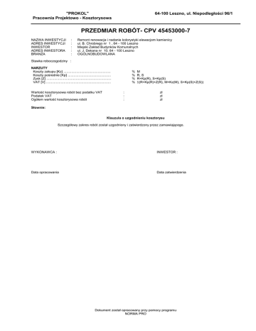"PROKOL" Pracownia Projektowo - Kosztorysowa 64-100 Leszno, ul. Niepodległości 96/1 PRZEDMIAR ROBÓT- CPV 45453000-7 NAZWA INWESTYCJI ADRES INWESTYCJI INWESTOR ADRES INWESTORA BRANŻA : : : : : Remont renowacja i nadanie kolorystyki elewacjom kamienicy ul. B. Chrobrego nr 1 , 64 - 100 Leszno Miejski Zakład Budynków Komunalnych ul. J. Dekana nr 10, 64 - 100 Leszno OGÓLNOBUDOWLANA Stawka roboczogodziny : NARZUTY Koszty zakupu [Kz] ................................................ Koszty pośrednie [Kp] ............................................ Zysk [Z] .................................................................. VAT [V] .................................................................. Wartość kosztorysowa robót bez podatku VAT Podatek VAT Ogółem wartość kosztorysowa robót % % % % : : : M R, S R+Kp(R), S+Kp(S) Σ(R+Kp(R)+Z(R), M+Kz(M), S+Kp(S)+Z(S)) zł zł zł Słownie: Klauzula o uzgodnieniu kosztorysu Szczegółowy zakres robót został uzgodniony i zatwierdzony przez zamawiającego. WYKONAWCA : INWESTOR : Data opracowania Data zatwierdzenia Dokument został opracowany przy pomocy programu NORMA PRO REMONT BUDYNKU - ul. Chrobrego 1 - 11.05.2015 TABELA ELEMENTÓW SCALONYCH Lp. Nazwa 1 PRACE PRZYGOTOWAWCZE 2 COKÓŁ do wys 1,5m 3 ŚCIANY POWYŻEJ COKOŁU ponad 1,5 m 4 OŚCIEŻA OPASKI OKIENNE I GZYMSY 5 OPIERZENIA PARAPETY RURY SPUSTOWE 6 STOLARKA OKIENNA I DRZWIOWA , PARAPETY WEWNĘTRZNE - (WYMIANA, RENOWACJA,UJEDNOLICENIE) 7 KRATY OKIENNE 8 STOPNIE I PODESTY ZEWNĘTRZNE 9 GRUZ RAZEM netto VAT Razem brutto Robocizna Materiały Sprzęt Słownie: -2- Norma PRO Wersja 4.23 Kz Kp Z RAZEM REMONT BUDYNKU - ul. Chrobrego 1 - 11.05.2015 SZCZEGÓŁOWY KOSZTORYS INWESTORSKI Lp. Podstawa 1 1 d.1 cena zakładowa 2 KNR 2-02 d.1 0925-01 Opis jm PRACE PRZYGOTOWAWCZE Zajęcie chodnika kpl -- Materiały -Zajęcie chodnika kpl Razem pozycja 1 Osłony okien i drzwi folia polietylenowa Nakład jedn. Cena jedn. Koszt jedn. Ilość 1 1.0000 1.000 2.5*2.6+ 1.55*1.15* 15+0.15* 1.9*9+0.6* 0.6*8+1.07* 1.5*3+1.4* 2.6+1.15* 1.65*5+ 1.15*1.9*5+ 0.75*1.08+ 1.02*1.5+ 1.0*1.65*2+ 1.0*1.2*2+ 0.6*1.1+ 0.6*1.5*4+ 0.85*1.45+ 0.75*0.95+ 1.55*1.0*2+ 1.0*1.2*2+ 0.98*1.45+ 0.7*1.1+ 0.95*1.65+ 1.0*1.65*4+ 1.0*1.55*4+ 0.85*1.55* 2+0.85* 1.65*2+ 1.22*2.4+ 0.97*2.05+ 2.6*2.55+ 1.55*2.55+ 0.98*2.22+ 1.0*1.65*2+ 1.0*1.55*2+ 0.85*2.1*2+ 1.15*2.5*3+ 1.0*1.2*2+ 0.85*0.85+ 0.6*1.16 = 149.382 m2 -- Robocizna -999 2600619 1560499 1330699 0000000 35111 3 KNR 2-02 d.1 1604-02 -- Materiały -deski iglaste obrzynane gr.25 mm kl.III folia kalandrowana z PCW uplastycznionego Gwoździe budowlane papowe gołe materiały pomocnicze(od M) r-g 0.2127 m3 0.00033 m2 0.3833 kg % 0.0072 1.5000 -- Sprzęt -żuraw okienny przenośny m-g Razem pozycja 2 Rusztowania zewnętrzne rurowe o m2 wysokości do 15 m 0.0135 149.382 1012.640 -- Robocizna -999 2791399 2791299 2791299 2600105 2600618 -- Materiały -płyty pomostowe robocze płyty komunikacyjne długie płyty komunikacyjne krótkie bale iglaste obrzynane gr. 50 mm kl.II deski iglaste obrzynane gr. 25 mm kl.II r-g 0.5787 m2 m2 m2 m3 m3 0.0150 0.0004 0.0002 0.00002 0.00018 -3- Norma PRO Wersja 4.23 Wartość REMONT BUDYNKU - ul. Chrobrego 1 - 11.05.2015 SZCZEGÓŁOWY KOSZTORYS INWESTORSKI Lp. Podstawa 2600619 Opis 1340399 1120604 2791099 0000000 deski iglaste obrzynane gr.25 mm kl.III haki do muru drut stalowy okrągły 3 mm maty (płyty) trzcinowe gr. 3.5 cm materiały pomocnicze(od M) 48100 -- Sprzęt -rusztowanie rurowe 4 d.1 analiza indywidualna Razem pozycja 3 Rusztowania na dachu jm Nakład jedn. m3 0.00002 kg kg m2 % 0.0120 0.0090 0.0060 1.5000 m-g 0.1640 Cena jedn. Koszt jedn. Ilość 1012.640 1.5*(3.0+ 3.0+5.0+ 5.0) = 24.000 m2 rzutu -- Robocizna -999 2600910 2640611 2650510 1330699 1560412 0000000 39000 5 NNRNKB 202 d.1 1622a-01 -- Materiały -Krawędziaki iglaste kl.III Deski iglaste obrzyn.nas.gr.1925mm,kl.III 0.001+0.005=0.006= Płyta pilśn. porowata gr.9,5 mm Gwoździe budowlane papowe gołe 0.05+0.25=0.3= folia polietylenowa szeroka (6 m) grub. 0.2 mm materiały pomocnicze(od M) r-g 1.3600 m3 m3 0.0080 0.0060 m2 kg 1.0300 0.3000 m2 1.3000 % 1.5000 -- Sprzęt -Środek transportowy m-g Razem pozycja 4 (z.VIII) Osłony z siatki na rusztowam2 niach zewnętrznych 0.0100 24.000 1036.640 -- Robocizna -999 202x088 0000000 6 NNRNKB 202 d.1 1621-03 r-g 0.0319 -- Materiały -siatka m2 materiały pomocnicze(od M) % Razem pozycja 5 (z.VI) Daszki ochronne wolno stojące m2 o konstrukcji drewnianej (bez podłogi rzutu z desek) pokryte płytami pilśniowymi i folią polietylenową nad wejściami do budynków 0.1405 1.5000 1036.640 1.2*(2.6+ 1.4+1.2+ 1.0) = 7.440 -- Robocizna -999 2600910 2640611 2650510 1411300 1330699 1560412 0000000 39000 7 d.1 cena zakładowa 00001 -- Materiały -Krawędziaki iglaste kl.III Deski iglaste obrzyn.nas.gr.1925mm,kl.III 0.001+0.005=0.006= Płyta pilśn. porowata gr.9,5 mm Kwas solny techniczny 33-29 % Gwoździe budowlane papowe gołe 0.05+0.25=0.3= folia polietylenowa szeroka (6 m) grub. 0.2 mm materiały pomocnicze(od M) r-g 1.3600 m3 m3 0.0080 0.0060 m2 kg kg 1.0300 0.1000 0.3000 m2 1.3000 % 1.5000 -- Sprzęt -Środek transportowy m-g Razem pozycja 6 Czas pracy rusztowań m-g 0.0100 7.440 poz.5 = 1036.640 -- Sprzęt -czas pracy rusztowań m-g Razem pozycja 7 1.0000 1036.640 -4- Norma PRO Wersja 4.23 Wartość REMONT BUDYNKU - ul. Chrobrego 1 - 11.05.2015 SZCZEGÓŁOWY KOSZTORYS INWESTORSKI Lp. Podstawa 8 KNR 4-01 d.1 0354-15 Opis Wykucie z muru elementów stalowych jm Nakład jedn. szt. Cena jedn. Koszt jedn. Ilość 25 -- Robocizna -999 2 9 KNR 4-01 d.2 0701-06 r-g Razem pozycja 8 COKÓŁ do wys 1,5m Odbicie tynków z zaprawy cementowej na ścianach, filarach, pilastrach o powierzchni odbicia ponad 5 m2 przyjeto 40%skucia tynku 0.1900 25.000 m2 67.349 -- Robocizna -999 10 KNR 4-01 d.2 0308-02 r-g Razem pozycja 9 Naprawienie uszkodzonych w murze szt. cegieł w ilości do 3 szt. 0.4100 67.349 5 -- Robocizna -999 1800199 1700301 1602003 3930000 0000000 
