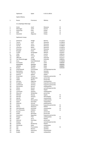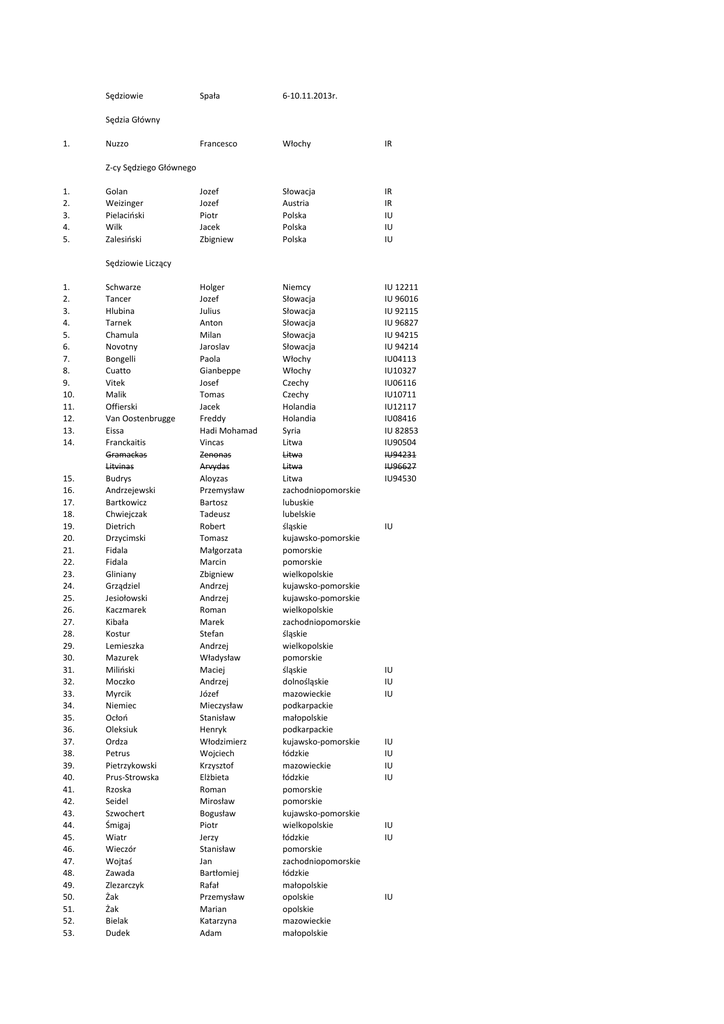 Sędziowie Spała 6-10.11.2013r. Francesco Włochy IR Jozef Jozef Piotr Jacek Zbigniew Słowacja Austria Polska Polska Polska IR IR IU IU IU Holger Jozef Julius Anton Milan Jaroslav Paola Gianbeppe Josef Tomas Jacek Freddy Hadi Mohamad Vincas Zenonas Arvydas Aloyzas Przemysław Bartosz Tadeusz Robert Tomasz Małgorzata Marcin Zbigniew Andrzej Andrzej Roman Marek Stefan Andrzej Władysław Maciej Andrzej Józef Mieczysław Stanisław Henryk Włodzimierz Wojciech Krzysztof Elżbieta Roman Mirosław Bogusław Piotr Jerzy Stanisław Jan Bartłomiej Rafał Przemysław Marian Katarzyna Adam Niemcy Słowacja Słowacja Słowacja Słowacja Słowacja Włochy Włochy Czechy Czechy Holandia Holandia Syria Litwa Litwa Litwa Litwa zachodniopomorskie lubuskie lubelskie śląskie kujawsko-pomorskie pomorskie pomorskie wielkopolskie kujawsko-pomorskie kujawsko-pomorskie wielkopolskie zachodniopomorskie śląskie wielkopolskie pomorskie śląskie dolnośląskie mazowieckie podkarpackie małopolskie podkarpackie kujawsko-pomorskie łódzkie mazowieckie łódzkie pomorskie pomorskie kujawsko-pomorskie wielkopolskie łódzkie pomorskie zachodniopomorskie łódzkie małopolskie opolskie opolskie mazowieckie małopolskie IU 12211 IU 96016 IU 92115 IU 96827 IU 94215 IU 94214 IU04113 IU10327 IU06116 IU10711 IU12117 IU08416 IU 82853 IU90504 IU94231 IU96627 IU94530 Sędzia Główny 1. Nuzzo Z-cy Sędziego Głównego 1. 2. 3. 4. 5. Golan Weizinger Pielaciński Wilk Zalesiński Sędziowie Liczący 1. 2. 3. 4. 5. 6. 7. 8. 9. 10. 11. 12. 13. 14. 15. 16. 17. 18. 19. 20. 21. 22. 23. 24. 25. 26. 27. 28. 29. 30. 31. 32. 33. 34. 35. 36. 37. 38. 39. 40. 41. 42. 43. 44. 45. 46. 47. 48. 49. 50. 51. 52. 53. Schwarze Tancer Hlubina Tarnek Chamula Novotny Bongelli Cuatto Vitek Malik Offierski Van Oostenbrugge Eissa Franckaitis Gramackas Litvinas Budrys Andrzejewski Bartkowicz Chwiejczak Dietrich Drzycimski Fidala Fidala Gliniany Grządziel Jesiołowski Kaczmarek Kibała Kostur Lemieszka Mazurek Miliński Moczko Myrcik Niemiec Ocłoń Oleksiuk Ordza Petrus Pietrzykowski Prus-Strowska Rzoska Seidel Szwochert Śmigaj Wiatr Wieczór Wojtaś Zawada Zlezarczyk Żak Żak Bielak Dudek IU IU IU IU IU IU IU IU IU IU IU