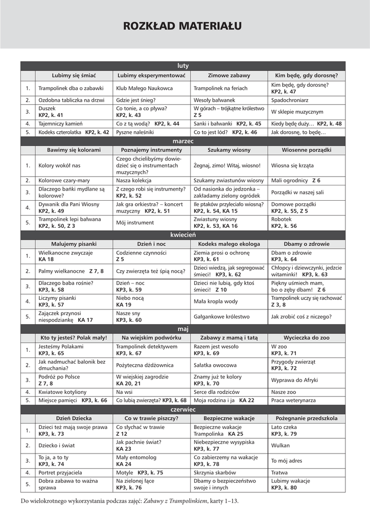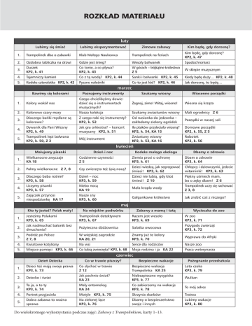 ROZKAD MATERIAU luty Lubimy siÚ ĂmiaÊ 1. Trampolinek dba o zabawki Lubimy eksperymentowaÊ Zimowe zabawy Kim bÚdÚ, gdy dorosnÚ? Klub Maïego Naukowca Trampolinek na feriach Kim bÚdÚ, gdy dorosnÚ? KP2, k. 47 2. Ozdobna tabliczka na drzwi Gdzie jest Ănieg? Wesoïy baïwanek Spadochroniarz 3. Duszek KP2, k. 41 Co tonie, a co pïywa? KP2, k. 43 W górach – trójkÈtne królestwo Z5 W sklepie muzycznym 4. Tajemniczy kamieñ Co z tÈ wodÈ? KP2, k. 44 Sanki i baïwanki KP2, k. 45 Kiedy bÚdÚ duĝy… KP2, k. 48 5. Kodeks czterolatka KP2, k. 42 Pyszne naleĂniki Co to jest lód? KP2, k. 46 Jak dorosnÚ, to bÚdÚ… marzec Bawimy siÚ kolorami Poznajemy instrumenty Szukamy wiosny Wiosenne porzÈdki 1. Kolory wokóï nas Czego chcielibyĂmy dowiedzieÊ siÚ o instrumentach muzycznych? ¿egnaj, zimo! Witaj, wiosno! Wiosna siÚ krzÈta 2. Kolorowe czary-mary Nasza kolekcja Szukamy zwiastunów wiosny Mali ogrodnicy Z 6 3. Dlaczego bañki mydlane sÈ kolorowe? Z czego robi siÚ instrumenty? KP2, k. 52 Od nasionka do jedzonka – zakïadamy zielony ogródek PorzÈdki w naszej sali 4. Dywanik dla Pani Wiosny KP2, k. 49 Jak gra orkiestra? – koncert muzyczny KP2, k. 51 Ile ptaków przyleciaïo wiosnÈ? KP2, k. 54, KA 15 Domowe porzÈdki KP2, k. 55, Z 5 5. Trampolinek lepi baïwana KP2, k. 50, Z 3 Mój instrument Zwiastuny wiosny KP2, k. 53, KA 16 Robotek KP2, k. 56 kwiecieñ Malujemy pisanki Dzieñ i noc Kodeks maïego ekologa Dbamy o zdrowie 1. Wielkanocne zwyczaje KA 18 Codzienne czynnoĂci Z5 Ziemia prosi o ochronÚ KP3, k. 61 Dbam o zdrowie KP3, k. 64 2. Palmy wielkanocne Z 7, 8 Czy zwierzÚta teĝ ĂpiÈ nocÈ? Dzieci wiedzÈ, jak segregowaÊ Ămieci! KP3, k. 62 Chïopcy i dziewczynki, jedzcie witaminki! KP3, k. 63 3. Dlaczego baba roĂnie? KP3, k. 58 Dzieñ – noc KP3, k. 59 Dzieci nie lubiÈ, gdy ktoĂ Ămieci! Z 10 PiÚkny uĂmiech mam, bo o zÚby dbam! Z 6 4. Liczymy pisanki KP3, k. 57 Niebo nocÈ KA 19 Maïa kropla wody Trampolinek uczy siÚ rachowaÊ Z 3, 8 5. ZajÈczek przynosi niespodziankÚ KA 17 Nasze sny KP3, k. 60 Gaïgankowe królestwo Jak zrobiÊ coĂ z niczego? maj Kto ty jesteĂ? Polak maïy! Na wiejskim podwórku Zabawy z mamÈ i tatÈ Wycieczka do zoo 1. JesteĂmy Polakami KP3, k. 65 Trampolinek detektywem KP3, k. 67 Razem jest wesoïo KP3, k. 69 W zoo KP3, k. 71 2. Jak nadmuchaÊ balonik bez dmuchania? Poĝyteczna dĝdĝownica Saïatka owocowa Przygody zwierzÈt KP3, k. 72 3. Podróĝ po Polsce Z 7, 8 W wiejskiej zagrodzie KA 20, 21 Znamy juĝ te kolory KP3, k. 70 Wyprawa do Afryki 4. Kwiatowe kotyliony Na wsi Serce dla rodziców Nasze zoo 5. Miejsce pamiÚci KP3, k. 66 Co lubiÈ zwierzÚta? KP3, k. 68 Moja rodzina i ja KA 22 Praca weterynarza czerwiec Dzieñ Dziecka Co w trawie piszczy? Bezpieczne wakacje Poĝegnanie przedszkola 1. Dzieci teĝ majÈ swoje prawa KP3, k. 73 Co sïychaÊ w trawie Z 12 Bezpieczne wakacje Trampolinka KA 25 Lato czeka KP3, k. 79 2. Dziecko i Ăwiat Jak pachnie Ăwiat? KA 23 Niebezpieczne wysypiska KP3, k. 77 Wulkan 3. To ja, a to ty KP3, k. 74 Maïy entomolog KA 24 Co zabierzemy na wakacje KP3, k. 78 To mój adres 4. Portret przyjaciela Motyle KP3, k. 75 Skrzynia skarbów Tratwa 5. Dobra zabawa to waĝna sprawa Na zielonej ïÈce KP3, k. 76 Dbamy o bezpieczeñstwo swoje i innych Lubimy wakacje KP3, k. 80 Do wielokrotnego wykorzystania podczas zajęć: Zabawy z Trampolinkiem, karty 1–13.