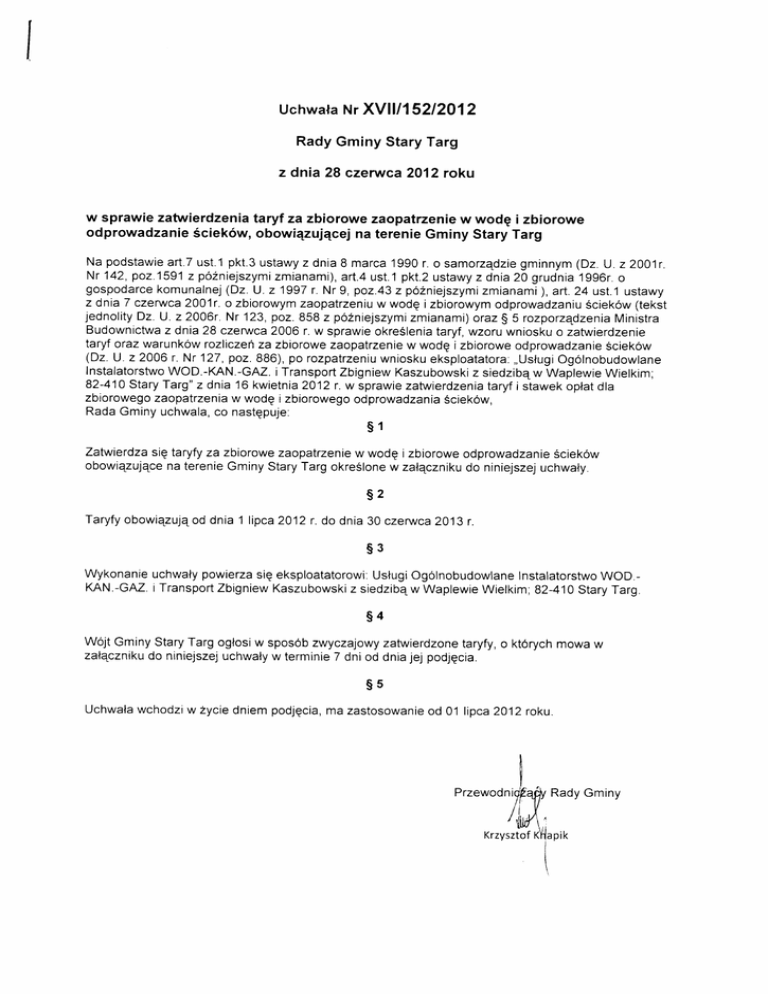 WÓjt Gminy Stary Targ ogłosiw sposob zwyczajowyzatwierdzonetaryfy,o ktÓrychmowa W