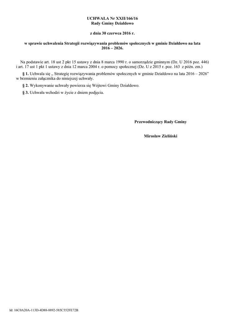 UCHWAŁA Nr XXII/166/16 Rady Gminy Działdowo z dnia 30 czerwca 2016 r. w sprawie uchwalenia Strategii rozwiązywania problemów społecznych w gminie Działdowo na lata 2016 – 2026. Na podstawie art. 18 ust 2 pkt 15 ustawy z dnia 8 marca 1990 r. o samorządzie gminnym (Dz. U 2016 poz. 446) i art. 17 ust 1 pkt 1 ustawy z dnia 12 marca 2004 r. o pomocy społecznej (Dz. U z 2015 r. poz. 163 z późn. zm.) § 1. Uchwala się „ Strategię rozwiązywania problemów społecznych w gminie Działdowo na lata 2016 – 2026” w brzmieniu załącznika do niniejszej uchwały. § 2. Wykonywanie uchwały powierza się Wójtowi Gminy Działdowo. § 3. Uchwała wchodzi w życie z dniem podjęcia. Przewodniczący Rady Gminy Mirosław Zieliński Id: 16C0A20A-113D-4D88-8892-585C552FE72B Załącznik do Uchwały Nr XXII/166/16 Rady Gminy Działdowo z dnia 30 czerwca 2016 r. Strategia rozwiązywa ia pro le ów społe z y h w g i ie Działdowo na lata 2016-2026 Działdowo 2016 Id: 16C0A20A-113D-4D88-8892-585C552FE72B Spis treści Wstęp ............................................................................................................................................... 3 1. Uwarunkowania prawne i programowe Strategii ..................................................................... 4 2. Charakterystyka gminy ............................................................................................................... 8 . . Ogól e i for a je ............................................................................................................... 8 . . Lud ość ................................................................................................................................. 9 2.3. Lokalna gospodarka ........................................................................................................... 11 3. Waru ki ży ia ieszkań ów ..................................................................................................... 13 3.1. Zasoby mieszkaniowe ........................................................................................................ 13 . . Aktyw ość społe z a ieszkań ów ................................................................................. 14 . . Dostęp ość usług społe z y h ......................................................................................... 15 . . . Oświata i wy howa ie ............................................................................................... 16 3.3.2. Opieka zdrowotna ...................................................................................................... 16 3.3.3. Kultura i sport ............................................................................................................. 17 3.3.4. System pomocy i wsparcia......................................................................................... 18 . . . Bezpie zeństwo pu li z e ......................................................................................... 19 . Głów e wyzwa ia lokal ej polityki społe z ej ....................................................................... 20 . . “kala i for y udziela ia po o y społe z ej.................................................................... 20 . . Głów e pro le y społe z e w uję iu po o y społe z ej ............................................ 22 4.3. Dysfunkcje rodzin............................................................................................................... 24 . . Uzależ ie ia ....................................................................................................................... 25 . )ałoże ia g i ej polityki społe z ej a lata -2026...................................................... 27 . . Cele i kieru ki iez ęd y h działań.................................................................................. 27 Priorytet I. “ty ulowa ie aktyw oś i zawodowej i zarad oś i ży iowej ........................ 27 Priorytet II. Wsparcie rodzi w ależytej opie e i wy howa iu dzie i ............................. 29 Priorytet III. Włą ze ie społe z e osó starszy h, hory h i iepeł ospraw y h .......... 31 Priorytet IV. Kreowa ie rozwoju świado ej i wol ej od dysfu k ji społe z oś i ........... 33 . . Waru ki skute z ej realiza ji elów ................................................................................. 35 . . )arządza ie pro ese wdraża ia .................................................................................... 37 . . . Pod ioty zaa gażowa e ........................................................................................... 37 5.3.2. Zadania koordynatora strategii ................................................................................. 38 5.3.3. Monitoring i ewaluacja strategii................................................................................ 39 5.4. Ramy finansowe strategii .................................................................................................. 41 Id: 16C0A20A-113D-4D88-8892-585C552FE72B Wstęp Opra owa ie i realiza ja strategii rozwiązywa ia pro le ów społe z y h jest jed y z o owiązków g i y, który wy ika wprost z ustawy z dnia 12 marca 2004 roku o pomocy społe z ej. Ustawa określa jedynie ra y for al e ogól y zakres strategii, jednak wielolet ia praktyka jed ostek sa orządu terytorial ego w ty zakresie skła ia do wyjś ia poza wąsko rozu ia ą sferę zadań pod iotów wspierają y h oso y i rodziny z ajdują e się w trud ej sytua ji ży iowej. Przezwy ięża ie pro le ów społe z y h to nie tylko podej owa ie działań terapeutycznych oraz kompensacyjnych z iejszają y h powstałe deficyty w zakresie zaspokojenia potrzeb ludzki h, ale rów ież – a oże przede wszystki – działa ia uprzedzają e wystąpie ie sytua ji pro le owy h w ży iu osó , rodzi i szerszy h z iorowoś i. Tak rozumiany obszar aktyw oś i wpisuje się w ele i zada ia g i ej polityki społe z ej, 