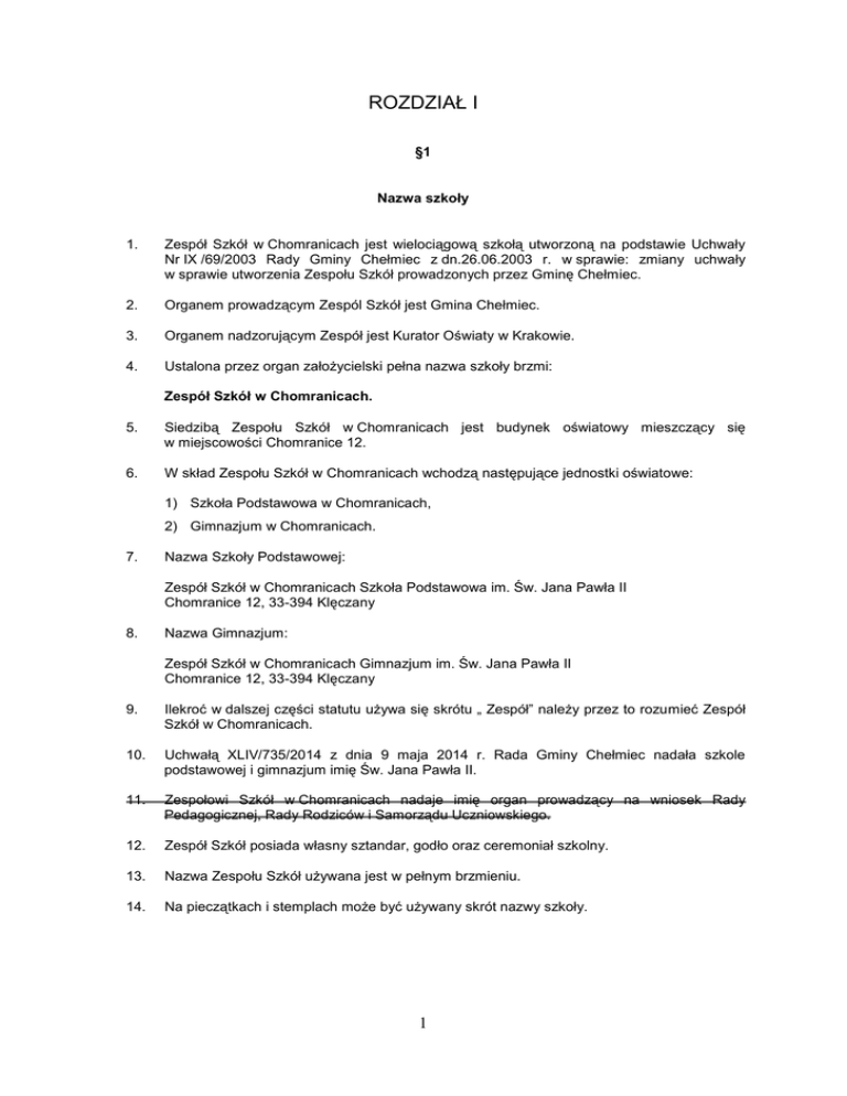 ROZDZIAŁ I §1 Nazwa szkoły 1. Zespół Szkół w Chomranicach jest wielociągową szkołą utworzoną na podstawie Uchwały Nr IX /69/2003 Rady Gminy Chełmiec z dn.26.06.2003 r. w sprawie: zmiany uchwały w sprawie utworzenia Zespołu Szkół prowadzonych przez Gminę Chełmiec. 2. Organem prowadzącym Zespól Szkół jest Gmina Chełmiec. 3. Organem nadzorującym Zespół jest Kurator Oświaty w Krakowie. 4. Ustalona przez organ założycielski pełna nazwa szkoły brzmi: Zespół Szkół w Chomranicach. 5. Siedzibą Zespołu Szkół w Chomranicach jest budynek oświatowy mieszczący się w miejscowości Chomranice 12. 6. W skład Zespołu Szkół w Chomranicach wchodzą następujące jednostki oświatowe: 1) Szkoła Podstawowa w Chomranicach, 2) Gimnazjum w Chomranicach. 7. Nazwa Szkoły Podstawowej: Zespół Szkół w Chomranicach Szkoła Podstawowa im. Św. Jana Pawła II Chomranice 12, 33-394 Klęczany 8. Nazwa Gimnazjum: Zespół Szkół w Chomranicach Gimnazjum im. Św. Jana Pawła II Chomranice 12, 33-394 Klęczany 9. Ilekroć w dalszej części statutu używa się skrótu „ Zespół” należy przez to rozumieć Zespół Szkół w Chomranicach. 10. Uchwałą XLIV/735/2014 z dnia 9 maja 2014 r. Rada Gminy Chełmiec nadała szkole podstawowej i gimnazjum imię Św. Jana Pawła II. 11. Zespołowi Szkół w Chomranicach nadaje imię organ prowadzący na wniosek Rady Pedagogicznej, Rady Rodziców i Samorządu Uczniowskiego. 12. Zespół Szkół posiada własny sztandar, godło oraz ceremoniał szkolny. 13. Nazwa Zespołu Szkół używana jest w pełnym brzmieniu. 14. Na pieczątkach i stemplach może być używany skrót nazwy szkoły. 1 ROZDZIAŁ II §2 Cele i zadania szkoły 1. Zespół Szkół – Szkoła Podstawowa i Gimnazjum realizuje cele i zadania określone w ustawie o systemie oświaty i przepisach wydanych na jej podstawie oraz uwzględniające program wychowawczy i program profilaktyki dostosowany do potrzeb rozwojowych i środowiskowych uczniów. 2. Cele i zadania Szkoły Podstawowej: 1) W zakresie nauczania szkoła zapewnia w szczególności: a) naukę poprawnego i swobodnego wypowiadania się, pisanie i czytania ze zrozumieniem, b) poznawanie wymaganych pojęć i zdobywanie rzetelnej wiedzy na poziomie umożliwiającym co najmniej kontynuację nauki na następnym etapie kształcenia, c) dochodzenie do zrozumienia, przekazywanych treści, a nie tylko pamięciowego opanowania d) rozwijanie zdolności dostrzegania różnego rodzaju związków i zależności (przyczynowo-skutkowych, funkcjonalnych, czasowych, przestrzennych itp.), e) rozwijanie zdolności myślenia analitycznego i syntetycznego, f) traktowanie wiadomości przedmiotowych, stanowiących wartość poznawczą samą w sobie, w sposób integralny, prowadzący do lepszego zrozumienia świata, ludzi i siebie, g) poznawanie zasad rozwoju osobowego i życia społecznego, h) poznawanie dziedzictwa kultury narodowej postrzeganej w perspektywie kultury europejskiej. 2) W zakresie nabywania umiejętności: a) planowania i organizowania i oceniania własnej nauki, przyjmowania za nią coraz większej odpowiedzialności, b) skutecznego porozumiewania się w różnych sytuacjach, poprawnego posługiwania się językiem ojczystym, przygotowania do publicznych wystąpień, c) efektywnego współdziałania w zespole i pracy w grupie, budowania więzi międzyludzkich, podejmowania indywidualnych i grupowych decyzji, skutecznego działania na gruncie zachowania obowiązujących norm, d) poszukiwania, porządkowania i wykorzystywania informacji z różnych źródeł oraz efektywnego posługiwania się technologią informacyjną, e) rozwijania sprawności umysłowej oraz osobistych zainteresowań, f) przyswajania sobie metod i technik negocjacyjnego rozwiązania konfliktów i problemów społecznych. 2 3) W pracy wychowawczej wspierając rodzinę nauczyciele winni zmierzać do tego, by uczniowie: a) znali i kultywowali tradycję rodziny, szkoły, regionu oraz wykształcili właściwe postawy patriotyczne, b) doceniali piękno najbliższej okolicy, własnego regionu, Polski, c) byli uwrażliwieni na piękno sztuki, d) szanowali dobro wspólne, w tym otaczająca nas przyrodę, e) rozumieli wartość domu rodzinnego, f) byli asertywni – uwrażliwieni na zło – umieli się mu przeciwstawić, g) rozumieli i rozwijali postawy tolerancji wobec ludzkich odmienności, h) rozumieli wartość uczuć wyższych takich miłość, przyjaźń, i) mieli poczucie własnej wartości, j) mogli rozwijać swoje zainteresowania, k) umieli integrować się z zespołem rówieśniczym czy grupą szkolną. 3. Cele i zadania Gimnazjum: 1) W zakresie nauczania szkoła zapewnia uczniom w szczególności: a) naukę poprawnego i swobodnego wypowiadania się, pisania i czytania ze zrozumieniem, b) poznawanie wymaganych pojęć i zdobywanie rzetelnej wiedzy na poziomie umożliwiającym co najmniej kontynuację nauki na następnym etapie kształcenia, c) dochodzenie do rozumienia, a nie tylko pamięciowego opanowania przekazanych treści, d) rozwijanie zdolności dostrzegania różnego rodzaju związków i zależności (przyczynowo-skutkowych, funkcjonalnych, czasowych, przestrzennych itp.), e) rozwijanie zdolności myślenia analitycznego i syntetycznego, f) traktowanie wiadomości przedmiotowych, stanowiących wartość poznawczą samą w sobie, w sposób integralny, prowadzący do lepszego zrozumienia świata, ludzi i siebie, g) poznawanie zasad rozwoju osobowego i życia społecznego, h) poznawanie dziedzictwa kultury narodowej postrzeganej w perspektywie europejskiej. 2) W zakresie nabywania umiejętności: a) planowania i organizowania i oceniania własnej nauki, przyjmowania za nią coraz większej odpowiedzialności, b) prezentacja własnego punktu widzenia i uwzględniania poglądów Innych ludzi, c) efektywnego współdziałania w zespole i pracy w grupie, budowania więzi międzyludzkich, podejmowania indywidualnych i grupowych decyzji, skutec