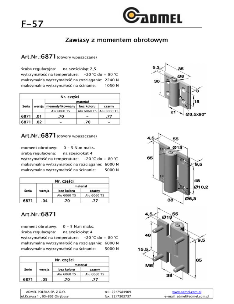 F-57 Zawiasy z momentem obrotowym Art.Nr.:6871(otwory wpuszczane) śruba regulacyjna: na sześciokąt 2,5 wytrzymałość na temperature: -20 °C do + 80 °C maksymalna wytrzymałość na rozciąganie: 2240 N maksymalna wytrzymałość na ścinanie: 1050 N Nr. części części materiał Seria Seria wersja niemodyfikownany Alu 6060 T5 bez koloru czarny Alu 6060 T5 Alu 6060 T5 6871 .01 .70 - .77 6871 .02 - .70 - Art.Nr.:6871(otwory wpuszczane) moment obrotowy: 0 - 5 N.m maks. śruba regulacyjna: na sześciokąt 4 wytrzymałość na temperature: -20 °C do + 80 °C maksymalna wytrzymałość na rozciąganie: 6000 N maksymalna wytrzymałość na ścinanie: 5000 N Nr. części materiał Seria Seria 6871 wersja bez koloru czarny Alu 6060 T5 Alu 6060 T5 .70 .77 .04 Art.Nr.: Art.Nr.:6871 moment obrotowy: 0 - 5 N.m maks. śruba regulacyjna: na sześciokąt 4 wytrzymałość na temperature: -20 °C do + 80 °C maksymalna wytrzymałość na rozciąganie: 6000 N maksymalna wytrzymałość na ścinanie: 5000 N Nr. części materiał Serie 6871 wersja .05 bez koloru czarny Alu 6060 T5 Alu 6060 T5 .70 .77 ADMEL POLSKA SP. Z O.O. ul.Krzywa 1 , 05-805 Otrębusy tel.: 22/7584909 www.admel.com.pl fax: 22/7303737 e-mail: [email protected] F-58 zawiasy ustalające Art.Nr.:6874(otwory wpuszczane) Pozycja ustalająca co 30° od 0° do 270°. Dostępne 3 różne momenty ustalające Nr. części moment obrotowy materiał Seria Seria wersja czarny Alu 6060 T5 6874 .01 .77 1,8 N.m 6874 .02 .77 2,5 N.m 6874 .03 .77 .77 3,2 N.m Art.Nr.:6875 (otwory wpuszczane) trzpień z stali nierdzewnej (1.4305) pozycja ustalająca co 90°. maksymalna waga drzwi : 1.2 kg na 2 zawiasy. Nr. części materiał Seria wersja 6875 .01 .80.80-kość słoniowa 6875 .02 .80.80-czarny ADMEL POLSKA SP. Z O.O. ul.Krzywa 1 , 05-805 Otrębusy Polyacetal tel.: 22/7584909 www.admel.com.pl fax: 22/7303737 e-mail: [email protected] ADMEL POLSKA SP. Z O.O. ul.Krzywa 1 , 05-805 Otrębusy tel.: 22/7584909 www.admel.com.pl fax: 22/7303737 e-mail: [email protected]