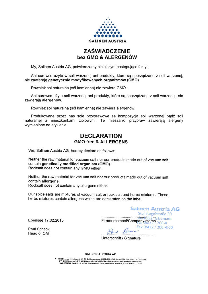 ZAŚWIADCZENIE bez GMO & ALERGENÓW My, Salinen Austria AG, potwierdzamy niniejszym następujące fakty: Ani surowce użyte w soli warzonej ani produkty, które są sporządzane z soli warzonej, nie zawierają genetycznie modyfikowanych organizmów (GMO). Również sól naturalna (sól kamienna) nie zawiera GMO. Ani surowce użyte soli warzonej ani produkty, które są sporządzane z soli warzonej, nie zawierają alergenów. Również sól naturalna (sól kamienna) nie zawiera alergenów. Produkowane przez nas sole przyprawowe są kompozycją soli warzonej bądź soli naturalnej z mieszkankami ziołowymi. Te mieszanki przypraw zawierają alergeny wymienione na etykiecie.