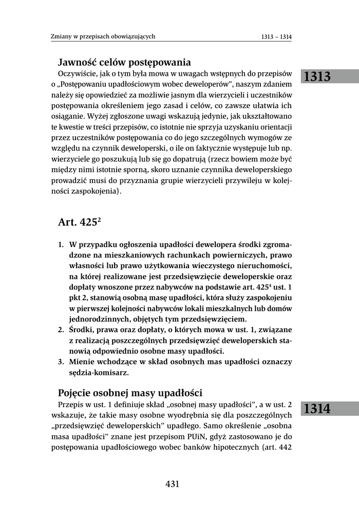 Zmiany w przepisach obowiązujących 1313 – 1314 Jawność celów postępowania Oczywiście, jak o tym była mowa w uwagach wstępnych do przepisów o „Postępowaniu upadłościowym wobec deweloperów”, naszym zdaniem należy się opowiedzieć za możliwie jasnym dla wierzycieli i uczestników postępowania określeniem jego zasad i celów, co zawsze ułatwia ich osiąganie. Wyżej zgłoszone uwagi wskazują jedynie, jak ukształtowano te kwestie w treści przepisów, co istotnie nie sprzyja uzyskaniu orientacji przez uczestników postępowania co do jego szczególnych wymogów ze względu na czynnik deweloperski, o ile on faktycznie występuje lub np. wierzyciele go poszukują lub się go dopatrują (rzecz bowiem może być między nimi istotnie sporną, skoro uznanie czynnika deweloperskiego prowadzić musi do przyznania grupie wierzycieli przywileju w kolejności zaspokojenia). 1313 Art. 4252 1. W przypadku ogłoszenia upadłości dewelopera środki zgromadzone na mieszkaniowych rachunkach powierniczych, prawo własności lub prawo użytkowania wieczystego nieruchomości, na której realizowane jest przedsięwzięcie deweloperskie oraz dopłaty wnoszone przez nabywców na podstawie art. 4254 ust. 1 pkt 2, stanowią osobną masę upadłości, która służy zaspokojeniu w pierwszej kolejności nabywców lokali mieszkalnych lub domów jednorodzinnych, objętych tym przedsięwzięciem. 2. Środki, prawa oraz dopłaty, o których mowa w ust. 1, związane z realizacją poszczególnych przedsięwzięć deweloperskich stanowią odpowiednio osobne masy upadłości. 3. Mienie wchodzące w skład osobnych mas upadłości oznaczy sędzia-komisarz. Pojęcie osobnej masy upadłości Przepis w ust. 1 definiuje skład „osobnej masy upadłości”, a w ust. 2 wskazuje, że takie masy osobne wyodrębnia się dla poszczególnych „przedsięwzięć deweloperskich” upadłego. Samo określenie „osobna masa upadłości” znane jest przepisom PUiN, gdyż zastosowano je do postępowania upadłościowego wobec banków hipotecznych (art. 442 431 1314 1314 Rozdział IX PUiN), w postępowaniu upadłościowym wobec zakładów ubezpieczeń i zakładów reasekuracji (art. 477 i 4771) oraz wobec emitentów obligacji (art. 488), gdzie, w każdym z tych przypadków w zasadzie z majątku upadłego dłużnika, stanowiącego masę upadłości (wedle trafnego i barwnego określenia Maurycego Allerhanda, „obłożonego węzłem upadłościowym”92, odpowiednikiem „węzła egzekucyjnego”) wyodrębnia się pewne składniki majątkowe do takich właśnie „mas osobnych” i udziela się przywileju zaspokojenia z nich pewnym jakościowo wyróżnionym grupom wierzycieli, szczególnie uprzednio zaangażowanych majątkowo w powstanie tych składników majątkowych, lub na nich zabezpieczonych. Jedynie w przypadku upadłości obligatariuszy w skład „osobnej masy upadłości” wchodzą też przedmioty zabezpieczenia praw z obligacji, przy czym nie jest wykluczone, że nie będą to tylko składniki mienia należące do upadłego dłużnika93 – ale i do osoby 92 Maurycy Allerhand, Prawo upadłościowe. Komentarz, wyd. Bielsko-Biała 1991, s. 85, teza 10 do art. 20 PrUp. 93 Choć z treści ust. 1 art. 488 PUiN wyraźnie wynika, że każdy „przedmiot zabezpieczenia praw z obligacji tworzy osobną masę upadłości, przeznaczoną na zaspokojenie praw obligatariuszy”, to jednak Jakubecki ponad to uznaje, że: „W art. 483 ust. 1 [PUiN] chodzi wyłącznie o zabezpieczenie na majątku emitenta…” (Andrzej Jakubecki w: tenże, Feliks Zedler, Prawo upadłościowe i naprawcze. Komentarz, Warszawa 2010, s. 914), choć z tego przepisu wynika jednak tylko, że w razie ustanowienia zabezpieczeń obligacji na majątku upadłego emitenta stosuje się przepisy tytułu IV części III PUiN „Postępowanie upadłościowe wobec emitentów obligacji” (co zdaje się sugerować, że gdyby obligacje zabezpieczono tylko na cudzym majątku, to dział ten nie miałby zastosowania), ale nie przesądza to o składzie „osobnej masy upadłości”. Skład ten reguluje dopiero art. 488, ale, wbrew jego treści, a z powołaniem na art. 483, Jakubecki przyjmuje, że: „Osobną masę upadłości stanowią te składniki majątku emitenta, na których ustanowiono zabezpieczenie praw obligatariuszy…”, choć art. 488 ograniczenia do majątku upadłego emitenta nie zawiera. Wydaje się, że Jakubecki problem ten pomija, gdy uznaje dalej, że: „Bez znaczenia natomiast są zabezpieczenia emisji ustanowione przez osoby trzecie (np. poręczenia lub gwarancje…)” (tamże), co tym łatwiej przychodzi, że powołuje przykłady zabezpieczeń osobistych, które nie mają konkretnego „przedmiotu”, jaki mógłby wejść w skład masy osobnej – mają go wszakże zabezpieczenia rzeczowe, także gdy przedmioty te mogą stanowić mienie osób trzecich. Oczywiście przeciw takiemu rozumieniu rzeczy przemawiałaby argumenty z porządku analizy systematycznej, które skutkami upadłości każą objąć tylko mienie upadłego, a na rzecz jego wierzycieli realizować tylko przysługujące mu prawa, w tym prawa z hipoteki lub zastawu na mieniu osób trzecich, i to te prawa, a nie przedmioty, na których je ustanowiono, winny wejść do osobnej masy upadłości, realizowanej w pierwszej kolejności na rzecz zabezpieczonych nimi obligatariuszy upadłego emitenta – czego jednak wyraźnie ustawodawca nie zdołał precyzyjnie w treści art. 488 ust. 1 PUiN wyrazić. Za literalnym rozumieniem przepisu art. 488 ust. 1 PUiN przemawia natomiast z pewnością szczególny jego charakter (lex specialis, odrębne uregulowanie pojęcia „osobnej masy upadłości” dla tego tylko przypadku), który zbędnym czyni poszukiwanie innych wykładni zrozumiałego wszak przepisu. Faktem jest też, że przepisy PUiN mają silniejszą, niż przedwojenne prawo upadłościowe tendencję do realnego kształtowania 432 Zmiany w przepisach obowiązujących 1315 
