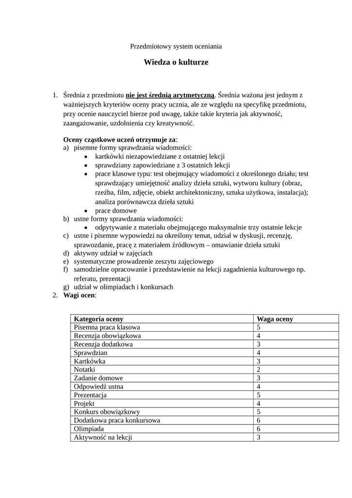 Przedmiotowy system oceniania Wiedza o kulturze 1. Średnia z przedmiotu nie jest średnią arytmetyczną. Średnia ważona jest jednym z ważniejszych kryteriów oceny pracy ucznia, ale ze względu na specyfikę przedmiotu, przy ocenie nauczyciel bierze pod uwagę, także takie kryteria jak aktywność, zaangażowanie, uzdolnienia czy kreatywność. Oceny cząstkowe uczeń otrzymuje za: a) pisemne formy sprawdzania wiadomości: kartkówki niezapowiedziane z ostatniej lekcji sprawdziany zapowiedziane z 3 ostatnich lekcji prace klasowe typu: test obejmujący wiadomości z określonego działu; test sprawdzający umiejętność analizy dzieła sztuki, wytworu kultury (obraz, rzeźba, film, zdjęcie, obiekt architektoniczny, sztuka użytkowa, instalacja); analiza porównawcza dzieła sztuki prace domowe b) ustne formy sprawdzania wiadomości: odpytywanie z materiału obejmującego maksymalnie trzy ostatnie lekcje c) ustne i pisemne wypowiedzi na określony temat, udział w dyskusji, recenzję, sprawozdanie, pracę z materiałem źródłowym – omawianie dzieła sztuki d) aktywny udział w zajęciach e) systematyczne prowadzenie zeszytu zajęciowego f) samodzielne opracowanie i przedstawienie na lekcji zagadnienia kulturowego np. referatu, prezentacji g) udział w olimpiadach i konkursach 2. Wagi ocen: Kategoria oceny Pisemna praca klasowa Recenzja obowiązkowa Recenzja dodatkowa Sprawdzian Kartkówka Notatki Zadanie domowe Odpowiedź ustna Prezentacja Projekt Konkurs obowiązkowy Dodatkowa praca konkursowa Olimpiada Aktywność na lekcji Waga oceny 5 4 3 4 3 2 3 4 5 4 5 6 6 3 Przy ocenie ucznia i jego postępów nauczyciel uwzględnia wiadomości (stopień rozumienia i zapamiętania nabytych informacji), umiejętności (udział w dyskusji, wyrażania opinii, wyszukiwania i gromadzenia informacji z różnych źródeł), aktywność i zaangażowanie przejawiane w trakcie zajęć, wkład pracy i rzetelność w wykonaniu wszelkich prac. 3. Oceny końcowe nie zawierają znaku „plus” i „minus”. Natomiast używając tych znaków w trakcie semestru nauczyciel zaznacza aktywność lub jej brak w trakcie zajęć lub zasygnalizowania poprawności/niepoprawności wykonania zadania domowego. (Trzy znaki „plus” są podstawą do wystawienia oceny cząstkowej bardzo dobry, trzy znaki „minus” oceny cząstkowej niedostateczny). 4. Liczba ocen w semestrze wynosi minimum trzy. 5. Wskaźnik przeliczenia punktów uzyskanych przez ucznia na oceny: Od 0% do 44% - niedostateczny Od 45% do 59% - dopuszczający Od 60% do 74% - dostateczny Od 75% do 89% - dobry Od 90% do 100% - bardzo dobry 6. Zasady poprawiania ocen. Uczeń ma prawo do poprawy oceny niedostatecznej. Obydwie oceny są brane pod uwagę przy wystawieniu oceny semestralnej lub rocznej. Poprawa odbywa się podczas konsultacji nauczyciela lub w innym terminie przez niego ustalonym. Zgodnie ze zmianami w WSO z dnia 29 sierpnia 2014 r. § 6. Zasady poprawiania prac klasowych i sprawdzianów sumujących: 1) uczeń, który otrzymał ocenę niedostateczną z pracy pisemnej ma prawo jednokrotnej poprawy w terminie ustalonym przez nauczyciela (nie dotyczy prac klasowych z języka polskiego - szczegóły w PSO), 2) uczeń niesamodzielnie piszący pracę otrzymuje ocenę niedostateczną i traci prawo do poprawy oceny. uczeń nieobecny ma obowiązek ustalić z nauczycielem termin napisania sprawdzianu lub pracy klasowej na pierwszych zajęciach po nieobecności, jeśli w wyznaczonym terminie uczeń nie przystąpi do napisania sprawdzianu bądź pracy klasowej, nauczyciel ma prawo wyegzekwować wiedzę z tego zakresu w dowolnym terminie i formie. 3) 4) 7. Nieprzygotowanie do lekcji. Uczeń ma prawo raz w semestrze zgłosić nieprzygotowanie do lekcji oraz brak pracy domowej z wyjątkiem zapowiedzianych sprawdzianów i prac klasowych. Nieprzygotowanie zaznaczone będzie w dzienniku jako np. 8. Dodatkową ocenę z WOK’u można uzyskać: - pisząc recenzję z aktualnego filmu (nie starszego niż dwa miesiące) - pisząc recenzję z aktualnego przedstawienia teatralnego - pisząc recenzję z aktualnego koncertu lub albumu muzycznego, festiwalu - pisząc recenzję z aktualnej wystawy - pisząc recenzję z wybranej książki po konsultacji tytułu z nauczycielem - dobrowolne uczestnictwo w konkursach plastycznych proponowanych przez nauczyciela Prace dodatkowe nie będą przyjmowane na tydzień przed końcowym wystawieniem ocen. Pracujemy cały rok. 9. Jeśli uczeń posiada szczególne uzdolnienia (muzyczne, plastyczne, teatralne, fotograficzne, zajmuje się grafiką komputerową lub jakąkolwiek dziedziną wykraczającą poza program nauczania), może przygotować prezentację swoich zainteresowań dla klasy, w umówionym z nauczycielem terminie. 10. Ocena celująca jest oceną wykraczającą poza materiał szkolny. Ocenę celującą na koniec roku może uzyskać uczeń, który na semestr miał ocenę bardzo dobrą i wykazał się szczególną aktywnością na polu kultury (olimpiada artystyczna, wygrane konkursy lub inne szczególne osiągnięcia). 11. Wszelkie prace podpisujemy (imię, nazwisko, klasa). Prace, które nie będą podpisane nie zostaną ocenione. 12. Prace plastyczne (o ile nie zostaną wysłane na konkurs lub staną się elementem dekoracji szkoły) są do odbioru pod koniec roku szkolnego. Prace nieodebrane w terminie ulegają likwidacji. 13. Ocena końcowa z WOK’u jest oceną na świadectwie maturalnym. 14. Dostosowanie Przedmiotowego Systemu Oceniania z Wiedzy o kulturze do możliwości uczniów ze specjalnymi potrzebami edukacyjnymi (według opracowania przez p. I. Suberlak) 1. Uczniowie, którzy uzyskali opinię Poradni Psychologiczno-pedagogicznej o specjalnych potrzebach edukacyjnych (Rozporządzenie Ministra Edukacji Narodowej z dnia 30 kwietnia 2013 r.) traktowani są indywidualnie i oceniani z uwzględnieniem zaleceń poradni. 2. Obowiązkiem nauczyciela jest jak najlepsze dostosowanie wymagań edukacyjnych ucznia do jego mo