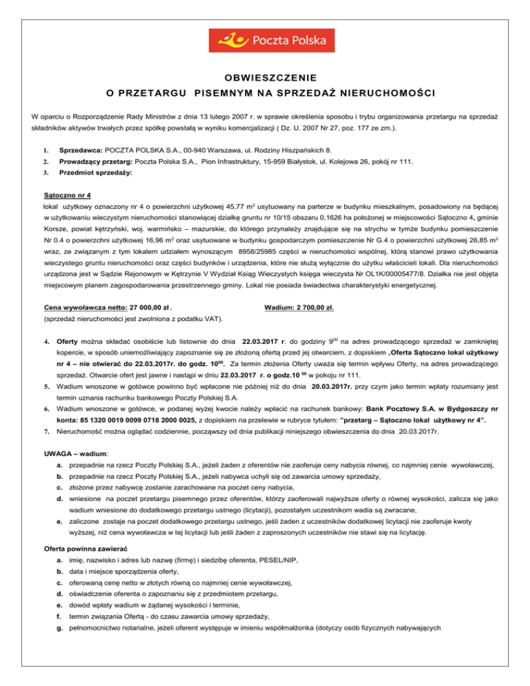 OBWIESZCZENIE O PRZETARG U PISEMNYM N A SPRZEDAŻ NIERUCHOMOŚCI W oparciu o Rozporządzenie Rady Ministrów z dnia 13 lutego 2007 r. w sprawie określenia sposobu i trybu organizowania przetargu na sprzedaż składników aktywów trwałych przez spółkę powstałą w wyniku komercjalizacji ( Dz. U. 2007 Nr 27, poz. 177 ze zm.). 1. Sprzedawca: POCZTA POLSKA S.A., 00-940 Warszawa, ul. Rodziny Hiszpańskich 8. 2. Prowadzący przetarg: Poczta Polska S.A., Pion Infrastruktury, 15-959 Białystok, ul. Kolejowa 26, pokój nr 111. 3. Przedmiot sprzedaży: Sątoczno nr 4 lokal użytkowy oznaczony nr 4 o powierzchni użytkowej 45,77 m2 usytuowany na parterze w budynku mieszkalnym, posadowiony na będącej w użytkowaniu wieczystym nieruchomości stanowiącej działkę gruntu nr 10/15 obszaru 0,1626 ha położonej w miejscowości Sątoczno 4, gminie Korsze, powiat kętrzyński, woj. warmińsko – mazurskie, do którego przynależy znajdujące się na strychu w tymże budynku pomieszczenie Nr 0.4 o powierzchni użytkowej 16,96 m2 oraz usytuowane w budynku gospodarczym pomieszczenie Nr G.4 o powierzchni użytkowej 26,85 m2 wraz, ze związanym z tym lokalem udziałem wynoszącym 8958/25985 części w nieruchomości wspólnej, którą stanowi prawo użytkowania wieczystego gruntu nieruchomości oraz części budynków i urządzenia, które nie służą wyłącznie do użytku właścicieli lokali. Dla nieruchomości urządzona jest w Sądzie Rejonowym w Kętrzynie V Wydział Ksiąg Wieczystych księga wieczysta Nr OL1K/00005477/8. Działka nie jest objęta miejscowym planem zagospodarowania przestrzennego gminy. Lokal nie posiada świadectwa charakterystyki energetycznej. Cena wywoławcza netto: 27 000,00 zł . Wadium: 2 700,00 zł. (sprzedaż nieruchomości jest zwolniona z podatku VAT). 4. Oferty można składać osobiście lub listownie do dnia 22.03.2017 r. do godziny 900 na adres prowadzącego sprzedaż w zamkniętej kopercie, w sposób uniemożliwiający zapoznanie się ze złożoną ofertą przed jej otwarciem, z dopiskiem „Oferta Sątoczno lokal użytkowy nr 4 – nie otwierać do 22.03.2017r. do godz. 1000. Za termin złożenia Oferty uważa się termin wpływu Oferty, na adres prowadzącego sprzedaż. Otwarcie ofert jest jawne i nastąpi w dniu 22.03.2017 r. o godz.10 00 w pokoju nr 111. 5. Wadium wnoszone w gotówce powinno być wpłacone nie później niż do dnia 20.03.2017r. przy czym jako termin wpłaty rozumiany jest termin uznania rachunku bankowego Poczty Polskiej S.A. 6. Wadium wnoszone w gotówce, w podanej wyżej kwocie należy wpłacić na rachunek bankowy: Bank Pocztowy S.A. w Bydgoszczy nr konta: 85 1320 0019 0099 0718 2000 0025, z dopiskiem na przelewie w rubryce tytułem: ”przetarg – Sątoczno lokal użytkowy nr 4”. 7. Nieruchomość można oglądać codziennie, począwszy od dnia publikacji niniejszego obwieszczenia do dnia 20.03.2017r. UWAGA – wadium: a. przepadnie na rzecz Poczty Polskiej S.A., jeżeli żaden z oferentów nie zaoferuje ceny nabycia równej, co najmniej cenie wywoławczej, b. przepadnie na rzecz Poczty Polskiej S.A., jeżeli nabywca uchyli się od zawarcia umowy sprzedaży, c. złożone przez nabywcę zostanie zarachowane na poczet ceny nabycia, d. wniesione na poczet przetargu pisemnego przez oferentów, którzy zaoferowali najwyższe oferty o równej wysokości, zalicza się jako wadium wniesione do dodatkowego przetargu ustnego (licytacji), pozostałym uczestnikom wadia są zwracane, e. zaliczone zostaje na poczet dodatkowego przetargu ustnego, jeśli żaden z uczestników dodatkowej licytacji nie zaoferuje kwoty wyższej, niż cena wywoławcza w tej licytacji lub jeśli żaden z zaproszonych uczestników nie stawi się na licytację. Oferta powinna zawierać a. imię, nazwisko i adres lub nazwę (firmę) i siedzibę oferenta, PESEL/NIP, b. data i miejsce sporządzenia oferty, c. oferowaną cenę netto w złotych równą co najmniej cenie wywoławczej, d. oświadczenie oferenta o zapoznaniu się z przedmiotem przetargu, e. dowód wpłaty wadium w żądanej wysokości i terminie, f. termin związania Ofertą - do czasu zawarcia umowy sprzedaży, g. pełnomocnictwo notarialne, jeżeli oferent występuje w imieniu współmałżonka (dotyczy osób fizycznych nabywających nieruchomość w ramach małżeńskiej wspólności majątkowej) lub oświadczenia o nabyciu nieruchomości przez jednego ze współmałżonków ze środków pochodzących z majątku odrębnego (jeśli dotyczy), h. w przypadku podmiotu gospodarczego aktualnego (nie starszego niż 3 m-ce) odpisu Krajowego Rejestru Sądowego lub wydruk z Centralnej Ewidencji i Informacji o Działalności Gospodarczej, kompletu dokumentów upoważniających do reprezentowania podmiotu w przetargu pisemnym, i. odpisu decyzji Urzędu Skarbowego o nadaniu numeru identyfikacyjnego NIP lub oświadczenie o nadanym numerze NIP – z wyłączeniem osób fizycznych nieprowadzących działalności gospodarczej. j. w przypadku spółek odpis Umowy/Aktu założycielskiego Spółki i uchwałę właściwego kompetencyjnie organu o zgodzie na nabycie nieruchomości, k. w przypadku osób prawnych mających siedzibę za granicą lub jednostek organizacyjnych, którym ustawa przyznaje zdolność prawną z siedzibą za granicą, dokumentów potwierdzających status prawny i rejestrację. Dokumenty sporządzone w języku innym niż polski powinny być przedłożone wraz z tłumaczeniem przysięgłym na język polski. Zagraniczne dokumenty urzędowe powinny być poświadczone przez właściwy konsulat/ambasadę RP. l. oświadczenie o numerze rachunku bankowego, na który należy dokonać zwrotu wadium w przypadku nie wygrania przez uczestnika przetargu oraz adres do korespondencji, m. wniosek o udział w przetargu pisemnym (wzór stanowi załącznik nr 2A Regulaminu Postępowań na sprzedaż nieruchomości Poczty Polskiej S.A.) 8. Do wyboru oferty wystarczy jedna ważnie złożona oferta. 9. W przypadku ustalenia, że ki