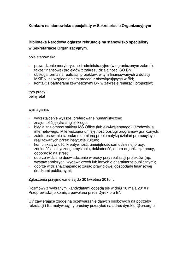Konkurs na stanowisko specjalisty w Sekretariacie Organizacyjnym Biblioteka Narodowa ogłasza rekrutację na stanowisko specjalisty w Sekretariacie Organizacyjnym. opis stanowiska: prowadzenie merytoryczne i administracyjne (w ograniczonym zakresie także finansowe) projektów z zakresu działalności SO BN; obsługa formalna realizacji projektów, w tym finansowanych z dotacji MKiDN, z uwzględnieniem procedur obowiązujących w BN; kontakt z partnerami zewnętrznymi BN w zakresie realizacji projektów; tryb pracy: pełny etat wymagania: wykształcenie wyższe, preferowane humanistyczne; znajomość języka angielskiego; biegła znajomość pakietu MS Office (lub ekwiwalentnego) i środowiska internetowego. Mile widziana umiejętność obsługi programów graficznych; zainteresowanie szeroko rozumianą problematyką działań promocyjnych realizowanych przez instytucje kultury; komunikatywność, kreatywność, umiejętność samodzielnej pracy, zdolność analitycznego myślenia, dokładność, dobra organizacja pracy, odporność na stres; dobrze widziane doświadczenie w pracy przy realizacji projektów (np. wystawienniczych, wydawniczych lub innych o charakterze publicznym); dobrze widziana znajomość zasad prawidłowej gospodarki finansowej środkami publicznymi; Zgłoszenia przyjmowane są do 30 kwietnia 2010 r. Rozmowy z wybranymi kandydatami odbędą się w dniu 10 maja 2010 r. Przeprowadzi je komisja powołana przez Dyrektora BN. CV zawierające zgodę na przetwarzanie danych osobowych na potrzeby rekrutacji i list motywacyjny prosimy przesyłać na adres [email protected]
