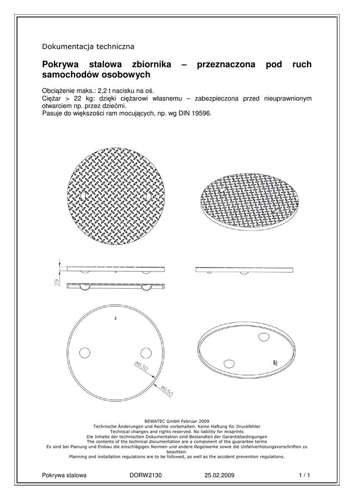 Dokumentacja techniczna Pokrywa stalowa zbiornika samochodów osobowych – przeznaczona pod ruch Obciążenie maks.: 2,2 t nacisku na oś. Ciężar > 22 kg: dzięki ciężarowi własnemu – zabezpieczona przed nieuprawnionym otwarciem np. przez dziećmi. Pasuje do większości ram mocujących, np. wg DIN 19596. REWATEC GmbH Februar 2009 Technische Änderungen und Rechte vorbehalten. Keine Haftung für Druckfehler Technical changes and rights reserved. No liability for misprints Die Inhalte der technischen Dokumentation sind Bestandteil der Garantiebedingungen The contents of the technical documentation are a component of the guarantee terms Es sind bei Planung und Einbau die einschlägigen Normen und andere Regelwerke sowie die Unfallverhütungsvorschriften zu beachten. Planning and installation regulations are to be followed, as well as the accident prevention regulations. Pokrywa stalowa DORW2130 25.02.2009 1/1