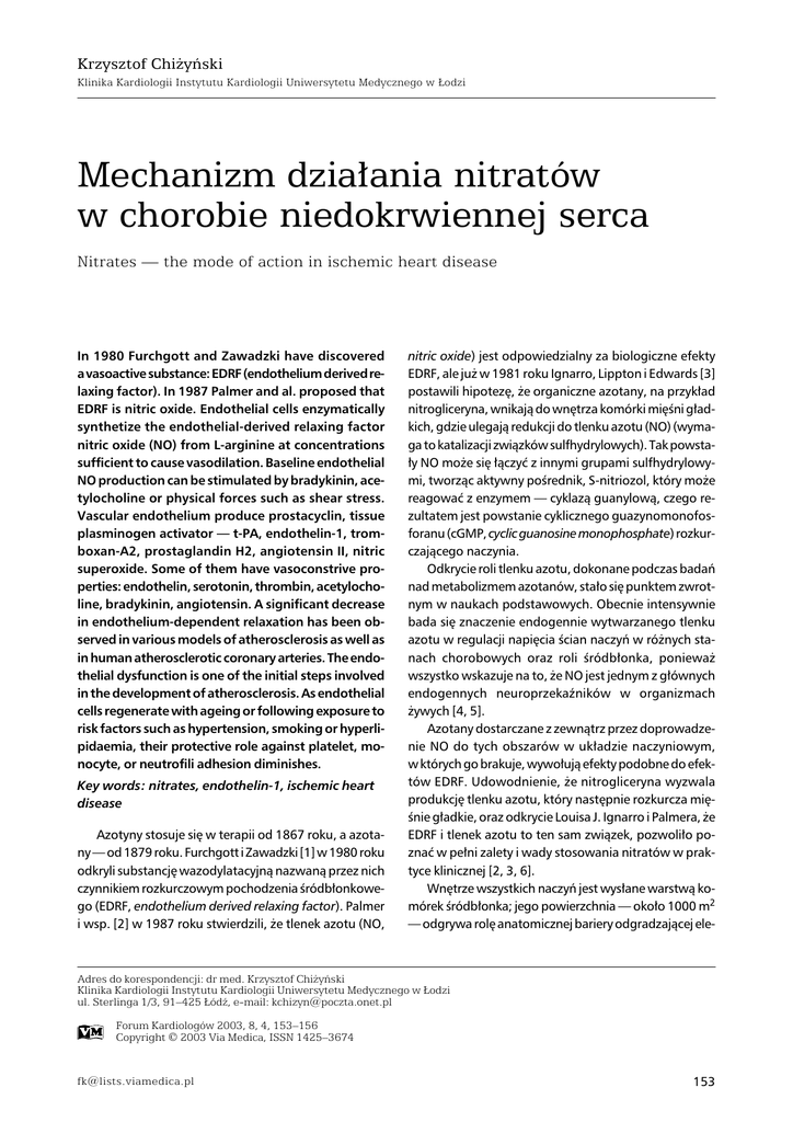 Krzysztof Chiżyński Klinika Kardiologii Instytutu Kardiologii Uniwersytetu Medycznego w Łodzi Mechanizm działania nitratów w chorobie niedokrwiennej serca Nitrates — the mode of action in ischemic heart disease In 1980 Furchgott and Zawadzki have discovered a vasoactive substance: EDRF (endothelium derived relaxing factor). In 1987 Palmer and al. proposed that EDRF is nitric oxide. Endothelial cells enzymatically synthetize the endothelial-derived relaxing factor nitric oxide (NO) from L-arginine at concentrations sufficient to cause vasodilation. Baseline endothelial NO production can be stimulated by bradykinin, acetylocholine or physical forces such as shear stress. Vascular endothelium produce prostacyclin, tissue plasminogen activator — t-PA, endothelin-1, tromboxan-A2, prostaglandin H2, angiotensin II, nitric superoxide. Some of them have vasoconstrive properties: endothelin, serotonin, thrombin, acetylocholine, bradykinin, angiotensin. A significant decrease in endothelium-dependent relaxation has been observed in various models of atherosclerosis as well as in human atherosclerotic coronary arteries. The endothelial dysfunction is one of the initial steps involved in the development of atherosclerosis. As endothelial cells regenerate with ageing or following exposure to risk factors such as hypertension, smoking or hyperlipidaemia, their protective role against platelet, monocyte, or neutrofili adhesion diminishes. Key words: nitrates, endothelin-1, ischemic heart disease Azotyny stosuje się w terapii od 1867 roku, a azotany — od 1879 roku. Furchgott i Zawadzki [1] w 1980 roku odkryli substancję wazodylatacyjną nazwaną przez nich czynnikiem rozkurczowym pochodzenia śródbłonkowego (EDRF, endothelium derived relaxing factor). Palmer i wsp. [2] w 1987 roku stwierdzili, że tlenek azotu (NO, nitric oxide) jest odpowiedzialny za biologiczne efekty EDRF, ale już w 1981 roku Ignarro, Lippton i Edwards [3] postawili hipotezę, że organiczne azotany, na przykład nitrogliceryna, wnikają do wnętrza komórki mięśni gładkich, gdzie ulegają redukcji do tlenku azotu (NO) (wymaga to katalizacji związków sulfhydrylowych). Tak powstały NO może się łączyć z innymi grupami sulfhydrylowymi, tworząc aktywny pośrednik, S-nitriozol, który może reagować z enzymem — cyklazą guanylową, czego rezultatem jest powstanie cyklicznego guazynomonofosforanu (cGMP, cyclic guanosine monophosphate) rozkurczającego naczynia. Odkrycie roli tlenku azotu, dokonane podczas badań nad metabolizmem azotanów, stało się punktem zwrotnym w naukach podstawowych. Obecnie intensywnie bada się znaczenie endogennie wytwarzanego tlenku azotu w regulacji napięcia ścian naczyń w różnych stanach chorobowych oraz roli śródbłonka, ponieważ wszystko wskazuje na to, że NO jest jednym z głównych endogennych neuroprzekaźników w organizmach żywych [4, 5]. Azotany dostarczane z zewnątrz przez doprowadzenie NO do tych obszarów w układzie naczyniowym, w których go brakuje, wywołują efekty podobne do efektów EDRF. Udowodnienie, że nitrogliceryna wyzwala produkcję tlenku azotu, który następnie rozkurcza mięśnie gładkie, oraz odkrycie Louisa J. Ignarro i Palmera, że EDRF i tlenek azotu to ten sam związek, pozwoliło poznać w pełni zalety i wady stosowania nitratów w praktyce klinicznej [2, 3, 6]. Wnętrze wszystkich naczyń jest wysłane warstwą komórek śródbłonka; jego powierzchnia — około 1000 m2 — odgrywa rolę anatomicznej bariery odgradzającej ele- Adres do korespondencji: dr med. Krzysztof Chiżyński Klinika Kardiologii Instytutu Kardiologii Uniwersytetu Medycznego w Łodzi ul. Sterlinga 1/3, 91–425 Łódź, e-mail: [email protected] Forum Kardiologów 2003, 8, 4, 153–156 Copyright © 2003 Via Medica, ISSN 1425–3674 [email protected] 153 Forum Kardiologów 2003, tom 8, nr 4 menty morfotyczne krwi od tkanki łącznej i mięśniówki gładkiej ściany naczyniowej. Całkowity ciężar śródbłonka dorosłego człowieka wynosi w przybliżeniu około 3 kg. Komórki śródbłonka produkują wiele substancji czynnych, które są wydzielane zarówno do mięśniówki gładkiej ściany naczyniowej, jak i do światła naczynia. Są to: tlenek azotu, prostacyklina, śródbłonkowy czynnik hiperpolaryzujący (EDHF, endothelium derived hyperpolarizing factor), tkankowy aktywator plazminogenu (t-PA, tissue plasminogen activator), endotelina-1, tromboksan A2, prostaglandyna H2, angiotensyna II i anionorodnik ponadtlenkowy. W warunkach fizjologicznych w świetle naczyń krążą substancje działające naczynioskurczowo, wśród których największą rolę odgrywa endotelina, a ponadto: serotonina, acetylocholina, trombina, bradykinina, angiotensyna II, cytokiny i inne. Podobnie trombocyty pobudzone do agregacji uwalniają substancje o silnych właściwościach naczyniozwężających; są to: tromboksan A2, adenozynodifosforan (ADP, adenosine diphosphate), serotonina i czynniki aktywujące płytki [7]. Endogenny tlenek azotu jest syntetyzowany przez syntazę NO (NOS, nitric oxide synthetase) w procesie transformacji aminokwasu L-argininy do L-cytruliny [8, 9]. Znane są izoformy konstytutywne — śródbłonkowa (eNOS, endothelial nitric oxide synthetase), obecna także w płytkach krwi, i neuronalna (nNOS, neuronal nitric oxide synthetase) oraz jedna izoforma indukowana (iNOS, inducible macrophage-type nitric oxide synthetase) tego enzymu. Izoformy konstytutywne są stale obecne w komórkach śródbłonka, a ich produkcję NO reguluje wiele czynników środowiska zewnętrznego. Tlenek azotu może być uwalniany przez śródbłonek pod wpływem dużej liczby czynników nerwowo-humoralnych działających na odpowiednie receptory śródbłonkowe, jednak zasadniczym stymulatorem śródbłonkowej produkcji NO jest tak zwana siła ścinająca (shear stress). Jest to siła, z jaką strumień lepkiej krwi „ociera się” o powierzchnię śródbłonka. Syntaza śr