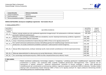 Uniwersytet Śląski w Katowicach Wydział Biologii i Ochrony Środowiska str. 1 Program kształcenia, załącznik nr 2 1. 2. 3. nazwa kierunku poziom kształcenia profil kształcenia forma prowadzenia studiów Ochrona środowiska pierwszy ogólnoakademicki stacjonarne MODUŁ KSZTAŁCENIA: Genetyczne modyfikacje organizmów Kod modułu 1OS_32 1. Liczba punktów ECTS: 3 kod efektu kształcenia modułu opis efektu kształcenia kod efektu kształcenia kierunku 1OS_W24 stopień realizacji (skala 1-5) Wylicza i opisuje metody oraz cele uzyskiwania organizmów transgenicznych i ich zastosowania w rolnictwie, medycynie, przemyśle i badaniach podstawowych. Opisuje korzyści wynikające z produkcji GMO oraz uświadamia, rozumie i dyskutuje kontrowersje, problemy i zagrożenia 1OS_32_2 związane z uwalnianiem GMO do środowiska. 1OS_W06 1OS_W24 5 5 1OS_32_3 Cytuje i interpretuje prawodawstwo krajowe dotyczące GMO w Polsce na tle regulacji prawnych UE. 1OS_W23 5 1OS_U09 4 1OS_32_6 Wykazuje odpowiedzialność za własną pracę oraz sprzęt laboratoryjny, z którym pracuje. 1OS_U18 1OS_U19 1OS_K06 1OS_K07 1OS_K08 5 5 5 5 5 1OS_32_7 Zna i przestrzega zasad bezpiecznej pracy z GMO oraz dba o bezpieczeństwo pracy własnej i innych. 1OS_W23 5 1OS_32_1 1OS_32_4 Zna i potrafi zastosować podstawowe procedury identyfikacji genetycznie modyfikowanego materiału oraz rozumie konieczność i zna zasady oznakowania produktów uzyskanych z wykorzystaniem metod transgenezy. 1OS_32_5 Opisuje efekty eksperymentu, analizuje i dyskutuje wyniki, stawia wnioski i przedstawia je w formie raportu/prezentacji. 3. Opis modułu Opis 5 Moduł przedstawia podstawową terminologię związaną z transgenezą i produkcją genetycznie modyfikowanych organizmów (GMO); przedstawiane są metody i cele uzyskiwania GMO, przykłady modyfikacji genetycznych mikroorganizmów, roślin i zwierząt oraz ich zastosowanie w hodowli, medycynie i badaniach podstawowych. Omawiane są korzyści wynikające z uprawy roślin genetycznie zmodyfikowanych jak i przedstawiane są kontrowersje, problemy i zagrożenia związane z uwalnianiem GMO do środowiska. Tematyka modułu obejmuje także prawodawstwo krajowe dotyczące GMO w Polsce na tle regulacji prawnych UE. Zajęcia praktyczne demonstrują techniki identyfikacji genetycznie modyfikowanego materiału. Uniwersytet Śląski w Katowicach Wydział Biologii i Ochrony Środowiska str. 2 Program kształcenia, załącznik nr 2 Wymagania wstępne modułu Znajomość biochemii, biologii komórki i genetyki na poziomie licencjatu 4. Sposoby weryfikacji efektów kształcenia modułu kod nazwa (typ) sposobu opis szczegółowy weryfikacji Pisemna praca sprawdzająca stopień zrozumienia, opanowania wiadomości i 1OS_32_w_1 Kolokwium zaliczeniowe umiejętności nabytych w czasie laboratoriów oraz zagadnienia omawiane w trakcie wykładów. ocena przestrzegania zasad pracy w specjalistycznym laboratorium, w tym Ocena ciągła umiejętności 1OS_32_w_2 zachowania aseptyczności warunków pracy; ocena umiejętności praktycznych przeprowadzenia eksperymentu oraz obserwacji i wyciągania wniosków Student przygotowuje raport opisujący sposób, efekty i wnioski z 1OS_32_w_3 Raport z pracy laboratoryjnej przeprowadzonego doświadczenia efekt(-y) kształcenia modułu 1OS_32_4; 1OS_32_5; 1OS_32_1; 1OS_32_2; 1OS_32_3; 1OS_32_6; 1OS_32_7 1OS_32_5 5. Formy prowadzenia zajęć forma prowadzenia zajęć opis (z uwzględnieniem metod dydaktycznych) 1OS_32_fs_1 wykład Wykład ilustrowany przykładami z badań własnych i najnowszej literatury, z wykorzystaniem środków audiowizualnych -prezentacje komputerowe w programie Power Point ilustrujące omawiane procesy. 1OS_32_fs_2 laboratorium Praca w laboratorium pod nadzorem prowadzącego - wykonywanie doświadczeń na podstawie instrukcji, analiza uzyskanych wyników konsultacje Indywidualna praca ze studentem nad przygotowywaniem raportu z pracy laboratoryjnej suma godzin: nazwa liczba godzin 10 20 30 praca własna studenta Opis przyswojenie wiedzy z wykładów; praca z podręcznikiem oraz z lekturą uzupełniającą w tym informacje specjalistyczne ze źródeł internetowych związanych z omawianymi zagadnieniami Przygotowanie do zadań laboratoryjnych na podstawie instrukcji i zalecanej przez prowadzącego literatury przedmiotu suma godzin: liczba godzin 10 20 30 sposób weryfikacji efektów kształcenia punkty ECTS 1OS_32_w_1 1 1OS_32_w_1 1OS_32_w_2 1OS_32_w_3 2 suma punktów: 3