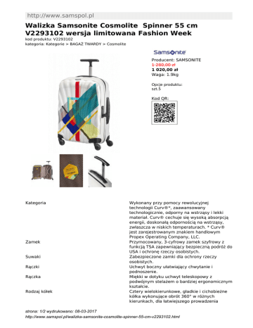 http://www.samspol.pl Walizka Samsonite Cosmolite Spinner 55 cm V2293102 wersja limitowana Fashion Week kod produktu: V2293102 kategoria: Kategorie > BAGAŻ TWARDY > Cosmolite Producent: SAMSONITE 1 280,00 zł 1 020,00 zł Waga: 1.9kg Opcje produktu: szt.5 Kod QR: Kategoria Zamek Suwaki Rączki Rączka Rodzaj kółek Wykonany przy pomocy rewolucyjnej technologii Curv®*, zaawansowany technologicznie, odporny na wstrząsy i lekki materiał. Curv® cechuje się wysoką absorpcją energii, doskonałą odpornością na wstrząsy, zwłaszcza w niskich temperaturach. * Curv® jest zarejestrowanym znakiem handlowym Propex Operating Company, LLC. Przymocowany, 3-cyfrowy zamek szyfrowy z funkcją TSA zapewniający bezpieczną podróż do USA i ochronę rzeczy osobistych. Zabezpieczone zamki dla ochrony rzeczy osobistych. Uchwyt boczny ułatwiający chwytanie i podnoszenie. Miękki w dotyku uchwyt teleskopowy z podwójnym stelażem o bardziej ergonomicznym kształcie. Cztery wielokierunkowe, gładkie i cichobieżne kółka wykonujące obrót 360° w różnych kierunkach, dla łatwiejszego prowadzenia strona: 1/2 wydrukowano: 08-03-2017 http://www.samspol.pl/walizka-samsonite-cosmolite-spinner-55-cm-v2293102.html Kółka Bagaż podręczny Adresówka walizki. 4 kółka Bagaż podręczny dostosowany do zaleceń IATA może zostać zabrany na pokład samolotu. Zalecamy sprawdzenie wymogów poszczególnych linii lotniczych przed podróżą Zdejmowana przywieszka bagażowa na uchwycie walizki. Prosty przycisk otwierania/zamykania plakietki identyfikacyjnej zapewnia prywatność danych. strona: 2/2 wydrukowano: 08-03-2017 http://www.samspol.pl/walizka-samsonite-cosmolite-spinner-55-cm-v2293102.html