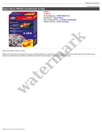 Informacje o produkcie Utworzono 08-03-2017 Aqua Nova Wkład ceramiczny 0,5kg Cena : 7,50 zł Aqua Nova Wkład ceramiczny 0,5kg er m ar k Nr katalogowy : NOVA/NCR-0.5 Producent : Aqua Nova Stan magazynowy : poniżej średniego Średnia ocena : brak recenzji w at Wkład ceramiczny Aqua Nova przeznaczony jest do filtracji biologicznej. Dzięki mocno rozwiniętej strukturze porów jego powierzchnia biologiczna jest bardzo duża. Dzięki temu jest idealnym siedliskiem dla bakterii oczyszczających wodę ze związków azotowych. Wygenerowano w programie www.oscGold.com