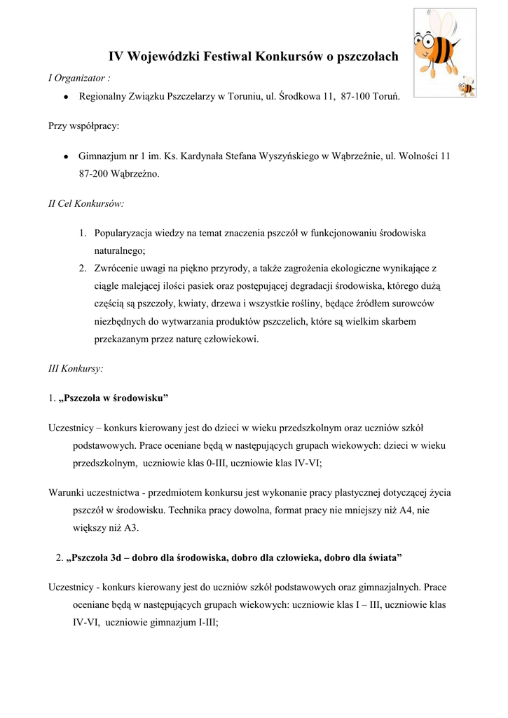 IV Wojewódzki Festiwal Konkursów o pszczołach I Organizator : Regionalny Związku Pszczelarzy w Toruniu, ul. Środkowa 11, 87-100 Toruń. Przy współpracy: Gimnazjum nr 1 im. Ks. Kardynała Stefana Wyszyńskiego w Wąbrzeźnie, ul. Wolności 11 87-200 Wąbrzeźno. II Cel Konkursów: 1. Popularyzacja wiedzy na temat znaczenia pszczół w funkcjonowaniu środowiska naturalnego; 2. Zwrócenie uwagi na piękno przyrody, a także zagrożenia ekologiczne wynikające z ciągle malejącej ilości pasiek oraz postępującej degradacji środowiska, którego dużą częścią są pszczoły, kwiaty, drzewa i wszystkie rośliny, będące źródłem surowców niezbędnych do wytwarzania produktów pszczelich, które są wielkim skarbem przekazanym przez naturę człowiekowi. III Konkursy: 1. „Pszczoła w środowisku” Uczestnicy – konkurs kierowany jest do dzieci w wieku przedszkolnym oraz uczniów szkół podstawowych. Prace oceniane będą w następujących grupach wiekowych: dzieci w wieku przedszkolnym, uczniowie klas 0-III, uczniowie klas IV-VI; Warunki uczestnictwa - przedmiotem konkursu jest wykonanie pracy plastycznej dotyczącej życia pszczół w środowisku. Technika pracy dowolna, format pracy nie mniejszy niż A4, nie większy niż A3. 2. „Pszczoła 3d – dobro dla środowiska, dobro dla człowieka, dobro dla świata” Uczestnicy - konkurs kierowany jest do uczniów szkół podstawowych oraz gimnazjalnych. Prace oceniane będą w następujących grupach wiekowych: uczniowie klas I – III, uczniowie klas IV-VI, uczniowie gimnazjum I-III; Warunki uczestnictwa - przedmiotem konkursu jest wykonanie przestrzennej pracy plastycznej przedstawiającej pszczołę. Technika pracy dowolna, rozmiar dowolny. 3. Konkurs fotograficzny „Pszczoła w obiektywie” Uczestnicy – konkurs kierowany jest do uczniów gimnazjum; Warunki uczestnictwa – każdy uczestnik konkursu może nadesłać do 3 fotografii, minimalny format 20x30 cm i większe, uczestnicy mogą zgłaszać do konkursu wyłącznie fotografie wykonane samodzielnie, do których posiadają wszelkie prawa autorskie. Do zdjęć należy dołączyć oświadczenie o posiadaniu pełnych praw autorskich do zdjęć. Należy dołączyć do zdjęć płytę CD lub DVD z cyfrowym zapisem nadesłanych prac (JPG lub TIFF) w pełnej rozdzielczości. Nadesłane fotografie przechodzą na własność Organizatora. 4. Konkurs literacki „W imieniu pszczół” 1. Zadanie konkursowe polega na przedstawieniu życia pszczół oraz jej roli w środowisku w formie przemówienia, listu, wiersza. Uczestnik konkursu ma za zadanie wcielić się w rolę pszczoły i napisać przemówienie, list, wiersz, w którym przekona odbiorców jak pożytecznym jest owadem. 2. Konkurs skierowany jest do uczniów szkoły podstawowej (IV – VI) oraz uczniów gimnazjów. IV Informacje dodatkowe: 1. Prace należy opatrzyć metryczką umieszczoną na odwrocie pracy, zawierającą: imię i nazwisko autora, wiek i adres domowy, nazwę placówki do której uczęszcza osoba biorąca udział w konkursie oraz numer telefonu; 2. Dodatkowo należy dołączyć do pracy niepełnoletniego uczestnika konkursu zgodę rodziców lub opiekunów prawnych oraz zgodę na przetwarzanie danych osobowych; 3. Prace niezgodne z regulaminem lub oddane po terminie nie będą oceniane; 4. Prace należy nadesłać lub dostarczyć osobiście do 25.05.2015r. do Gimnazjum nr 1 im. Ks. Kardynała Stefana Wyszyńskiego ul. Wolności 11, 87-200 Wąbrzeźno. V. Nagrody: Jury powołane przez Organizatora dokona kwalifikacji prac na wystawę pokonkursową oraz przyzna I, II, III nagrodę w każdej kategorii. Jury zastrzega sobie prawo do nie wyłonienia zwycięzców oraz przyznania miejsc ex aequo. Otwarcie wystawy i wręczenie nagród laureatom nastąpi 12.06.2015 r. podczas szkolnego Pikniku Rodzinnego w Gimnazjum nr 1 w Wąbrzeźnie. VI. Prawa organizatorów: 1. Wszystkie prace biorące udział w konkursie pozostają własnością organizatora; 2. Organizator konkursu zastrzega sobie prawo do opublikowania imienia, nazwiska i informacji o laureatach konkursu oraz umieszczenia tych informacji w mat. reklamowych organizatora oraz w mediach i Internecie; 3. W przypadku dużej ilości prac organizator zastrzega sobie możliwość dokonania wyboru prac przeznaczonych na wystawę pokonkursową; 4. W przypadku małej liczby zgłoszonych prac organizator zastrzega sobie możliwość do odwołania konkursu; 5. Nadesłanie prac na konkurs jest równoznaczne z uznaniem niniejszego regulaminu. ……………………………………………. miejscowość, data ZGODA RODZICA LUB OPIEKUNA Wyrażam zgodę na udział mojej córki/mojego syna ………………………………………… w konkursie organizowanym przez Regionalny Związku Pszczelarzy w Toruniu oraz Gimnazjum nr 1 im. Ks. Kardynała Stefana Wyszyńskiego w Wąbrzeźnie. …………………………………………….. (czytelny podpis rodzica lub opiekuna) DANE OSOBOWE OŚWIADCZENIE Wyrażam zgodę na przetwarzanie moich danych osobowych zawartych w zgłoszeniu do konkursu organizowanego przez Regionalny Związek Pszczelarzy w Toruniu oraz Gimnazjum Nr 1 w Wąbrzeźnie na potrzeby konkursu oraz w celach marketingowych Organizatora, zgodnie z „Ustawą o ochronie danych osobowych”, z dnia 29.08.1997 r. (Dz. U. z 2002 r., nr 101, poz. 926 z pózn. zm.). ………………………………………………………. podpis osoby składającej oświadczenie ………………………………………………………. miejsce i data złożenia oświadczenia PRAWA AUTORSKIE OŚWIADCZENIE Niniejszym oświadczam, że zdjęcia przesłane przeze mnie na Konkurs Fotograficzny „Pszczoła w obiektywie”, organizowany przez Regionalny Związku Pszczelarzy w Toruniu, przy współpracy Wąbrzeskiego Domu Kultury oraz Gimnazjum nr 1 im. Ks. Kardynała Stefana Wyszyńskiego w Wąbrzeźnie są mojego wyłącznego autorstwa, co oznacza, że posiadam pr