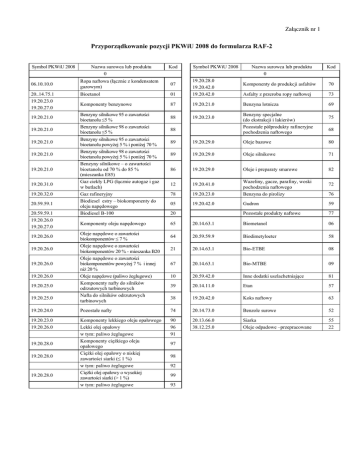Załącznik nr 1 Przyporządkowanie pozycji PKWiU 2008 do formularza RAF-2 Symbol PKWiU 2008 06.10.10.0 20..14.75.1 19.20.23.0 19.20.27.0 19.20.21.0 19.20.21.0 19.20.21.0 19.20.21.0 19.20.21.0 19.20.31.0 19.20.32.0 20.59.59.1 20.59.59.1 19.20.26.0 19.20.27.0 19.20.26.0 19.20.26.0 19.20.26.0 19.20.26.0 19.20.25.0 19.20.25.0 Nazwa surowca lub produktu 0 Kod Ropa naftowa (łącznie z kondensatem gazowym) 07 Bioetanol Komponenty benzynowe Benzyny silnikowe 95 o zawartości bioetanolu ≤5 % Benzyny silnikowe 98 o zawartości bioetanolu ≤5 % Benzyny silnikowe 95 o zawartości bioetanolu powyżej 5 % i poniżej 70 % Benzyny silnikowe 98 o zawartości bioetanolu powyżej 5 % i poniżej 70 % Benzyny silnikowe – o zawartości bioetanolu od 70 % do 85 % (mieszanka E85) Gaz ciekły LPG (łącznie autogaz i gaz w butlach) Gaz rafineryjny Biodiesel estry – biokomponenty do oleju napędowego Biodiesel B-100 Komponenty oleju napędowego Oleje napędowe o zawartości biokomponentów ≤ 7 % Oleje napędowe o zawartości biokomponentów 20 % - mieszanka B20 Oleje napędowe o zawartości biokomponentów powyżej 7 % i innej niż 20 % Oleje napędowe (paliwo żeglugowe) Komponenty nafty do silników odrzutowych turbinowych Nafta do silników odrzutowych turbinowych Symbol PKWiU 2008 Nazwa surowca lub produktu 0 Kod Komponenty do produkcji asfaltów 70 01 19.20.28.0 19.20.42.0 19.20.42.0 Asfalty z przerobu ropy naftowej 73 87 19.20.21.0 Benzyna lotnicza 69 88 19.20.23.0 88 Benzyny specjalne (do ekstrakcji i lakierów) Pozostałe półprodukty rafineryjne pochodzenia naftowego 75 68 89 19.20.29.0 Oleje bazowe 80 89 19.20.29.0 Oleje silnikowe 71 86 19.20.29.0 Oleje i preparaty smarowe 82 12 19.20.41.0 78 19.20.23.0 Wazeliny, gacze, parafiny, woski pochodzenia naftowego Benzyna do pirolizy 05 19.20.42.0 Gudron 59 Pozostałe produkty naftowe 77 20 72 76 65 20.14.63.1 Biometanol 06 64 20.59.59.9 Biodimetyloeter 58 21 20.14.63.1 Bio-ETBE 08 67 20.14.63.1 Bio-MTBE 09 10 20.59.42.0 Inne dodatki uszlachetniające 81 39 20.14.11.0 Etan 57 38 19.20.42.0 Koks naftowy 63 19.20.24.0 Pozostałe nafty 74 20.14.73.0 Benzole surowe 52 19.20.23.0 19.20.26.0 Komponenty lekkiego oleju opałowego Lekki olej opałowy w tym: paliwo żeglugowe Komponenty ciężkiego oleju opałowego Ciężki olej opałowy o niskiej zawartości siarki (≤ 1 %) w tym: paliwo żeglugowe Ciężki olej opałowy o wysokiej zawartości siarki (> 1 %) w tym: paliwo żeglugowe 90 96 91 20.13.66.0 38.12.25.0 Siarka Oleje odpadowe –przepracowane 55 22 19.20.28.0 19.20.28.0 19.20.28.0 97 98 92 99 93