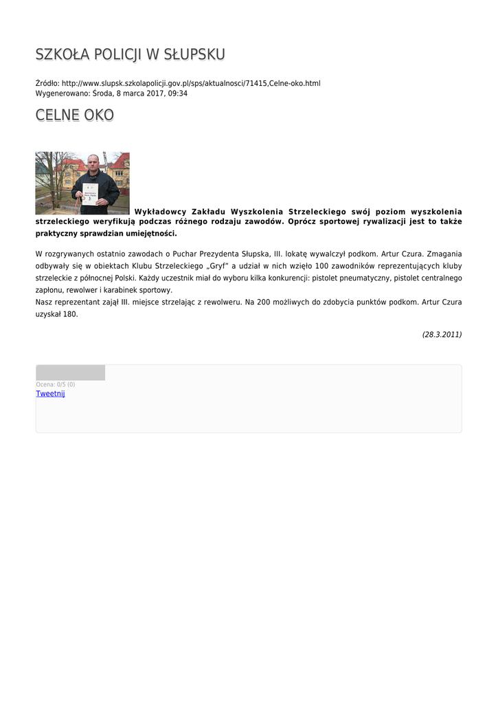 SZKOŁA POLICJI W SŁUPSKU Źródło: http://www.slupsk.szkolapolicji.gov.pl/sps/aktualnosci/71415,Celne-oko.html Wygenerowano: Środa, 8 marca 2017, 09:34 CELNE OKO Wykładowcy Zakładu Wyszkolenia Strzeleckiego swój poziom wyszkolenia strzeleckiego weryfikują podczas różnego rodzaju zawodów. Oprócz sportowej rywalizacji jest to także praktyczny sprawdzian umiejętności. W rozgrywanych ostatnio zawodach o Puchar Prezydenta Słupska, III. lokatę wywalczył podkom. Artur Czura. Zmagania odbywały się w obiektach Klubu Strzeleckiego „Gryf” a udział w nich wzięło 100 zawodników reprezentujących kluby strzeleckie z północnej Polski. Każdy uczestnik miał do wyboru kilka konkurencji: pistolet pneumatyczny, pistolet centralnego zapłonu, rewolwer i karabinek sportowy. Nasz reprezentant zajął III. miejsce strzelając z rewolweru. Na 200 możliwych do zdobycia punktów podkom. Artur Czura uzyskał 180. (28.3.2011) Ocena: 0/5 (0) Tweetnij