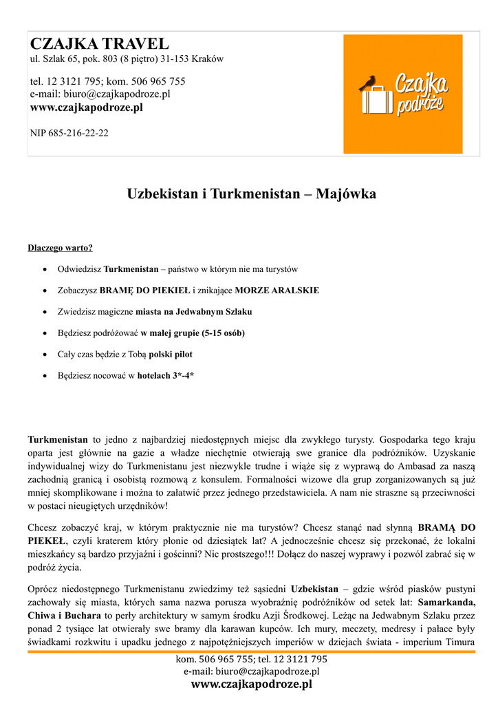 CZAJKA TRAVEL ul. Szlak 65, pok. 803 (8 piętro) 31-153 Kraków tel. 12 3121 795; kom. 506 965 755 e-mail: [email protected] www.czajkapodroze.pl NIP 685-216-22-22 Uzbekistan i Turkmenistan – Majówka Dlaczego warto? Odwiedzisz Turkmenistan – państwo w którym nie ma turystów Zobaczysz BRAMĘ DO PIEKIEŁ i znikające MORZE ARALSKIE Zwiedzisz magiczne miasta na Jedwabnym Szlaku Będziesz podróżować w małej grupie (5-15 osób) Cały czas będzie z Tobą polski pilot Będziesz nocować w hotelach 3*-4* Turkmenistan to jedno z najbardziej niedostępnych miejsc dla zwykłego turysty. Gospodarka tego kraju oparta jest głównie na gazie a władze niechętnie otwierają swe granice dla podróżników. Uzyskanie indywidualnej wizy do Turkmenistanu jest niezwykle trudne i wiąże się z wyprawą do Ambasad za naszą zachodnią granicą i osobistą rozmową z konsulem. Formalności wizowe dla grup zorganizowanych są już mniej skomplikowane i można to załatwić przez jednego przedstawiciela. A nam nie straszne są przeciwności w postaci nieugiętych urzędników! Chcesz zobaczyć kraj, w którym praktycznie nie ma turystów? Chcesz stanąć nad słynną BRAMĄ DO PIEKEŁ, czyli kraterem który płonie od dziesiątek lat? A jednocześnie chcesz się przekonać, że lokalni mieszkańcy są bardzo przyjaźni i gościnni? Nic prostszego!!! Dołącz do naszej wyprawy i pozwól zabrać się w podróż życia. Oprócz niedostępnego Turkmenistanu zwiedzimy też sąsiedni Uzbekistan – gdzie wśród piasków pustyni zachowały się miasta, których sama nazwa porusza wyobraźnię podróżników od setek lat: Samarkanda, Chiwa i Buchara to perły architektury w samym środku Azji Środkowej. Leżąc na Jedwabnym Szlaku przez ponad 2 tysiące lat otwierały swe bramy dla karawan kupców. Ich mury, meczety, medresy i pałace były świadkami rozkwitu i upadku jednego z najpotężniejszych imperiów w dziejach świata - imperium Timura kom. 506 965 755; tel. 12 3121 795 e-mail: [email protected] www.czajkapodroze.pl Chromego zwanego również Tamerlanem. Współczesność też odbiła piętno na Uzbekistanie - nad umierającym Morzem Aralskim- zobaczymy jak szybko człowiek może zniszczyć to, co natura budowała tysiące lat. Zapraszamy do dwóch krajów Jedwabnego Szlaku: Uzbekistanu i Turkmenistanu. Daj się porwać do innego świata, gdzie życie toczy się wolniej, gdzie czeka na Ciebie bogata historia zaklęta w każdym ziarenku piasku i gdzie przed Tobą było niewielu turystów. PROGRAM 1 dzień: Wylot z Warszawy (przesiadka w Moskwie, Stambule lub innym porcie lotniczym) do Taszkientu. 2 dzień: TASZKIENT - NUKUS Przylot do Taszkientu w godzinach wczesnoporannych. Transfer do hotelu na nocleg. Zwiedzanie Taszkientu – stolicy Uzbekistanu, która odbudowana po trzęsieniu ziemi w latach 60-tych ubiegłego stulecia, różni się od innych uzbeckich miast. Przespacerujemy się labiryntem wąskich uliczek starego miasta, zobaczymy meczety i medresy oszczędzone przez sowieckich architektów: medresa Barak Chana z XVI w., Meczet Piątkowy, Mauzoleum Kaffal Szaszi - poety i filozofa z XVI w. Zatrzymamy się na bazarze Charsu – gdzie oprócz zakupów będzie można zobaczyć handlowców w tradycyjnych strojach. Na koniec spojrzymy też na nowoczesną część miasta: Plac Niepodległości, pomnik Timura i otaczające go ogrody. Po obiedzie – krajowy lot do Nukus (1godz. 45 min). Nocleg w Nukus. 3 dzień: NUKUS – MOJNAK - NUKUS Po wczesnym śniadaniu przejazd do dawnej osady rybackiej – Mojnak, która kiedyś leżała nad Morzem Aralskim a obecnie znajduje się ponad 100 km od linii brzegowej. Zobaczymy tam „cmentarzysko statków” czyli opuszczone wraki niszczejące w piasku. Następnie udamy się do Muzeum Historii Morza Aralskiego. Po powrocie do Nukus zobaczymy Państwowe Muzeum Sztuki Republiki Karakałpackiej, gdzie zgromadzono największą kolekcję rosyjskiej sztuki awangardowej. Nocleg w Nukus. 4 dzień: NUKUS - CHIWA Po śniadaniu przejazd do Chiwy - miasta skansenu położonego nad rzeką Amu-Daria, która swe niegdysiejsze bogactwo zawdzięczała położeniu na Jedwabnym Szlaku. Po drodze zobaczymy starożytne fortece: Toprak Kala z I w., Ayaz Kala – kompleks 3 fortów datowanych na VI i VII w., które były kiedyś częścią fortyfikacji na skraju pustyni Kyzył Kum. Na koniec dotrzemy do twierdzy Djanbas Kala. Nocleg w Chiwie. 5 dzień: CHIWA Zwiedzanie Chiwy, zobaczymy m.in.: mury Iczan Kala, czyli starego miasta, fortecę Kunja Ark, Meczet Piątkowy, który słynie z ponad 200 drewnianych kolumn podtrzymujących strop; mauzoleum Pahlawona Mahmuda – patrona Chiwy, Pałac Letni oraz minaret Kalta Minor. Nocleg w Chiwie. kom. 506 965 755; tel. 12 3121 795 e-mail: [email protected] www.czajkapodroze.pl 6 dzień: CHIWA – DASZOGUZ – WROTA DO PIEKIEŁ Przejazd na granicę między Uzbekistanem a Turkmenistanem. Po załatwieniu formalności wjazdowych na obydwu granicach jedziemy do miasta Daszoguz, skąd dalej do Kunia-Urgencz wpisanego w całości na listę światowego dziedzictwa UNESCO. Zwiedzanie miasta, m.in.: mauzoleum sułtana Tekesz, mauzoleum Turabek-Khanum, niesamowity minaret Kutlug-Timur o wysokości 60 metrów. Następnie udamy się w okolice Derwaza aby zobaczyć „Wrota do piekeł”. W latach 50-tych XX wieku podczas odwiertów w tym rejonie nastąpił wybuch gazu a w jego wyniku zapadł się spory kawałek ziemi, pozostawiając otwór o średnicy 70 metrów. Aby uniknąć katastrofy spowodowanej ulatniającym się gazem, naukowcy postanowili podpalić krater. Założono, że gaz spali się w ciągu kilku dni, a tymczasem płonie do dziś. Nocleg niedaleko Derwaza. 7 dzień: DERWAZA - ASZCHABAD Przejazd do stolicy Turkmenistanu – Aszchabad. Zwiedzanie miasta, które jako stosunkowo młode jest przykładem połączenia niedalekiej pustyni z działalnością człowieka. Stolica dość szybko się rozwija oferując swoim gościom liczne muzea, teat