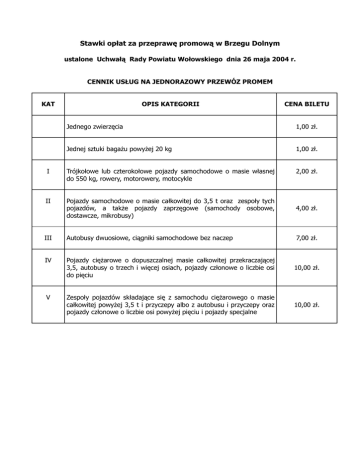 Stawki opłat za przeprawę promową w Brzegu Dolnym ustalone Uchwałą Rady Powiatu Wołowskiego dnia 26 maja 2004 r. CENNIK USŁUG NA JEDNORAZOWY PRZEWÓZ PROMEM KAT OPIS KATEGORII CENA BILETU Jednego zwierzęcia 1,00 zł. Jednej sztuki bagażu powyżej 20 kg 1,00 zł. I Trójkołowe lub czterokołowe pojazdy samochodowe o masie własnej do 550 kg, rowery, motorowery, motocykle 2,00 zł. II Pojazdy samochodowe o masie całkowitej do 3,5 t oraz zespoły tych pojazdów, a także pojazdy zaprzęgowe (samochody osobowe, dostawcze, mikrobusy) 4,00 zł. III Autobusy dwuosiowe, ciągniki samochodowe bez naczep 7,00 zł. IV Pojazdy ciężarowe o dopuszczalnej masie całkowitej przekraczającej 3,5, autobusy o trzech i więcej osiach, pojazdy członowe o liczbie osi do pięciu 10,00 zł. Zespoły pojazdów składające się z samochodu ciężarowego o masie całkowitej powyżej 3,5 t i przyczepy albo z autobusu i przyczepy oraz pojazdy członowe o liczbie osi powyżej pięciu i pojazdy specjalne 10,00 zł. V OPŁATY MIESIĘCZNE – ABONAMENT dla mieszkańców wsi Głoska oraz przysiółków Gąsiorów i Głogi w Gminie Miękinia oraz miasta Brzeg Dolny KAT I 30,00 zł. (rowery, motorowery, motocykle, pojazdy do 550 kg) KAT II 60,00 zł. (samochody osobowe, dostawcze, mikrobusy) KAT III 105,00 zł. KAT IV 150,00 zł. (samochody ciężarowe powyżej 3,5 t, autobusy wieloosiowe, (autobusy dwuosiowe, ciągniki samochodowe bez naczep) pojazdy członowe o liczbie osi do pięciu) KAT V 150,00 zł. (pojazdy ciężarowe o masie całkowitej powyżej 3,5 t z przyczepami, autobus z przyczepą, pojazdy o liczbie osi powyżej pięciu i pojazdy specjalne) OPŁATY MIESIĘCZNE – ABONAMENT dla pozostałych użytkowników przeprawy promowej KAT I 60,00 zł. (rowery, motorowery, motocykle, pojazdy do 550 kg) KAT II 120,00 zł. (samochody osobowe, dostawcze, mikrobusy) KAT III 210,00 zł. (autobusy dwuosiowe, ciągniki samochodowe bez naczep) KAT IV 300,00 zł. (samochody ciężarowe powyżej 3,5 t, autobusy wieloosiowe, pojazdy członowe o liczbie osi do pięciu) KAT V 300,00 zł. (pojazdy ciężarowe o masie całkowitej powyżej 3,5 t z przyczepami, autobus z przyczepą, pojazdy o liczbie osi powyżej pięciu i pojazdy specjalne) Przy ustalaniu opłat za przewóz promem miały zastosowanie przepisy Ustawy z dnia 21 marca 1985 r. o drogach publicznych (Dz. U. nr 204, poz. 2086 z 2004 r. tekst jednolity z póź. zm.)