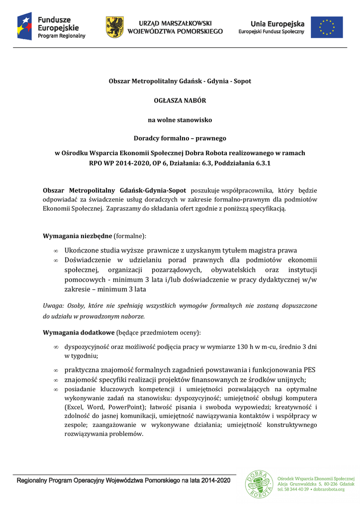 Obszar Metropolitalny Gdańsk - Gdynia - Sopot OGŁASZA NABÓR na wolne stanowisko Doradcy formalno – prawnego w Ośrodku Wsparcia Ekonomii Społecznej Dobra Robota realizowanego w ramach RPO WP 2014-2020, OP 6, Działania: 6.3, Poddziałania 6.3.1 Obszar Metropolitalny Gdańsk-Gdynia-Sopot poszukuje współpracownika, który będzie odpowiadać za świadczenie usług doradczych w zakresie formalno-prawnym dla podmiotów Ekonomii Społecznej. Zapraszamy do składania ofert zgodnie z poniższą specyfikacją. Wymagania niezbędne (formalne): • • Ukończone studia wyższe prawnicze z uzyskanym tytułem magistra prawa Doświadczenie w udzielaniu porad prawnych dla podmiotów ekonomii społecznej, organizacji pozarządowych, obywatelskich oraz instytucji pomocowych - minimum 3 lata i/lub doświadczenie w pracy dydaktycznej w/w zakresie – minimum 3 lata Uwaga: Osoby, które nie spełniają wszystkich wymogów formalnych nie zostaną dopuszczone do udziału w prowadzonym naborze. Wymagania dodatkowe (będące przedmiotem oceny): • dyspozycyjność oraz możliwość podjęcia pracy w wymiarze 130 h w m-cu, średnio 3 dni w tygodniu; • praktyczna znajomość formalnych zagadnień powstawania i funkcjonowania PES znajomość specyfiki realizacji projektów finansowanych ze środków unijnych; • • posiadanie kluczowych kompetencji i umiejętności pozwalających na optymalne wykonywanie zadań na stanowisku: dyspozycyjność; umiejętność obsługi komputera (Excel, Word, PowerPoint); łatwość pisania i swoboda wypowiedzi; kreatywność i zdolność do jasnej komunikacji, umiejętność nawiązywania kontaktów i współpracy w zespole; zaangażowanie w wykonywane działania; umiejętność konstruktywnego rozwiązywania problemów. Inne: • • • • • • • • • samodzielność i dynamizm w działaniu; wysokie umiejętności organizacyjne; umiejętność pracy w zespole i angażowania innych w aktywną współpracę; dobra znajomość j. angielskiego w mowie i piśmie; operatywność i inicjatywa; umiejętność skutecznego działania pod presją czasu; poczucie estetyki i dokładności; umiejętność planowania czasu pracy i elastyczność w działaniu, odpowiedzialność; wysoka kultura osobista. Uwaga: Po analizie dokumentów sprawdzających stopień spełnienia powyższych wymagań zastrzega się prawo zaproszenia na rozmowy kwalifikacyjne jedynie wybranych osób. Zakres wykonywanych zadań na stanowisku: Doradztwo formalno-prawne dotyczące zakładania i funkcjonowania podmiotów Ekonomii Społecznej i przedsiębiorstw społecznych, w tym spółdzielni socjalnych, organizacji pozarządowych, spółek non profit, podmiotów reintegracyjnych, m.in. zakładanie i rejestracja NGO i PES, tworzenie statutu, obowiązki formalno-prawne NGO i PES, inne wynikające z potrzeb zgłaszanych przez klientów OWES. Do obowiązków doradcy formalno – prawnego będzie również należało wypełnianie kart doradczych oraz dokumentacji niezbędnej na tym stanowisku. Warunki pracy: • umowa cywilno-prawna, śr. 130 w m-cu Wymagane dokumenty: • oferta cenowa; • CV i list motywacyjny; • dokumenty poświadczające wykształcenie, dodatkowe uprawnienia, kwalifikacje (dyplomy, certyfikaty, itp.); dokumenty potwierdzające doświadczenie zawodowe: np. referencje. • Zasady naboru: CV wraz z listem motywacyjnym i ofertą cenową za 1 h doradztwa oraz z dokumentami potwierdzającymi kompetencje należy składać drogą elektroniczną (w przypadku załączników mile widziane będą skany dokumentów scalone w jeden plik pdf) na adres: [email protected] w terminie do dnia 20.11.2015. Złożone w późniejszym terminie nie będą rozpatrywane. Kryteria oceny: 60% - cena 40% - doświadczenie Wybrani kandydaci zostaną powiadomieni o terminie rozmowy kwalifikacyjnej drogą elektroniczną na podany adres e-mailowy lub telefonicznie. Oryginały wymaganych dokumentów należy przedstawić w trakcie rozmowy kwalifikacyjnej. Złożone przez kandydatów dokumenty nie będą zwracane. Zastrzega się możliwość zakończenia postępowania rekrutacyjnego w każdym czasie bez podania przyczyn i bez wyłaniania kandydatów. Prosimy o dopisanie na swoich dokumentach następującej klauzuli: „Wyrażam zgodę na przetwarzanie moich danych osobowych zawartych w ofercie pracy dla potrzeb procesu rekrutacji zgodnie z ustawą z dnia 29.08.1997 r. Dz.U. z 2002 r Nr 101, poz. 926.”