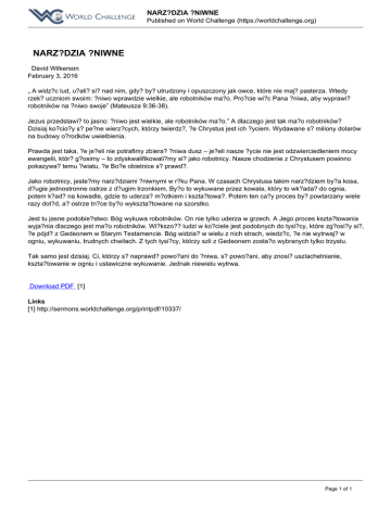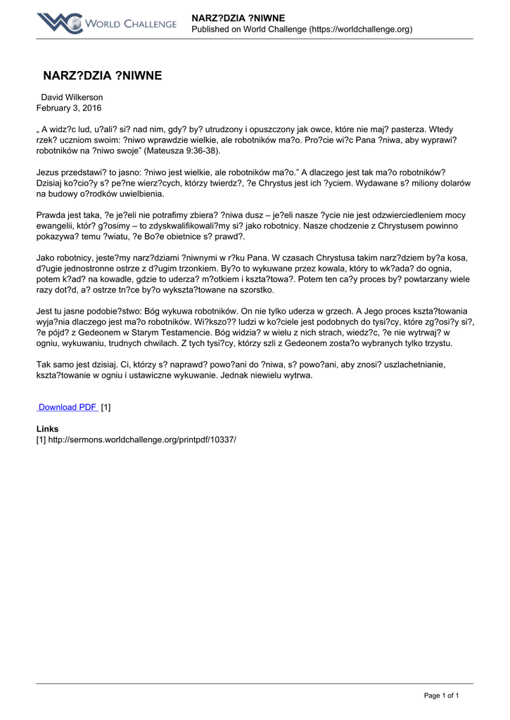 NARZ?DZIA ?NIWNE Published on World Challenge (https://worldchallenge.org) NARZ?DZIA ?NIWNE David Wilkerson February 3, 2016 „ A widz?c lud, u?ali? si? nad nim, gdy? by? utrudzony i opuszczony jak owce, które nie maj? pasterza. Wtedy rzek? uczniom swoim: ?niwo wprawdzie wielkie, ale robotników ma?o. Pro?cie wi?c Pana ?niwa, aby wyprawi? robotników na ?niwo swoje” (Mateusza 9:36-38). Jezus przedstawi? to jasno: ?niwo jest wielkie, ale robotników ma?o.” A dlaczego jest tak ma?o robotników? Dzisiaj ko?cio?y s? pe?ne wierz?cych, którzy twierdz?, ?e Chrystus jest ich ?yciem. Wydawane s? miliony dolarów na budowy o?rodków uwielbienia. Prawda jest taka, ?e je?eli nie potrafimy zbiera? ?niwa dusz – je?eli nasze ?ycie nie jest odzwierciedleniem mocy ewangelii, któr? g?osimy – to zdyskwalifikowali?my si? jako robotnicy. Nasze chodzenie z Chrystusem powinno pokazywa? temu ?wiatu, ?e Bo?e obietnice s? prawd?. Jako robotnicy, jeste?my narz?dziami ?niwnymi w r?ku Pana. W czasach Chrystusa takim narz?dziem by?a kosa, d?ugie jednostronne ostrze z d?ugim trzonkiem. By?o to wykuwane przez kowala, który to wk?ada? do ognia, potem k?ad? na kowadle, gdzie to uderza? m?otkiem i kszta?towa?. Potem ten ca?y proces by? powtarzany wiele razy dot?d, a? ostrze tn?ce by?o wykszta?towane na szorstko. Jest tu jasne podobie?stwo: Bóg wykuwa robotników. On nie tylko uderza w grzech. A Jego proces kszta?towania wyja?nia dlaczego jest ma?o robotników. Wi?kszo?? ludzi w ko?ciele jest podobnych do tysi?cy, które zg?osi?y si?, ?e pójd? z Gedeonem w Starym Testamencie. Bóg widzia? w wielu z nich strach, wiedz?c, ?e nie wytrwaj? w ogniu, wykuwaniu, trudnych chwilach. Z tych tysi?cy, którzy szli z Gedeonem zosta?o wybranych tylko trzystu. Tak samo jest dzisiaj. Ci, którzy s? naprawd? powo?ani do ?niwa, s? powo?ani, aby znosi? uszlachetnianie, kszta?towanie w ogniu i ustawiczne wykuwanie. Jednak niewielu wytrwa. Download PDF [1] Links [1] http://sermons.worldchallenge.org/printpdf/10337/ Page 1 of 1