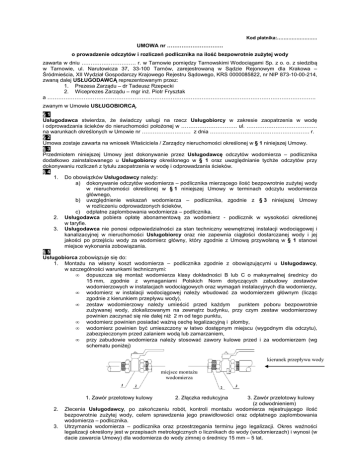 Kod płatnika:……………………. UMOWA nr …………………………. o prowadzenie odczytów i rozliczeń podlicznika na ilość bezpowrotnie zużytej wody zawarta w dniu ………………………… r. w Tarnowie pomiędzy Tarnowskimi Wodociągami Sp. z o. o. z siedzibą w Tarnowie, ul. Narutowicza 37, 33-100 Tarnów, zarejestrowaną w Sądzie Rejonowym dla Krakowa – Śródmieścia, XII Wydział Gospodarczy Krajowego Rejestru Sądowego, KRS 0000085822, nr NIP 873-10-00-214, zwaną dalej USŁUGODAWCĄ reprezentowanym przez: 1. Prezesa Zarządu – dr Tadeusz Rzepecki 2. Wiceprezes Zarządu – mgr inż. Piotr Frysztak a …………………………………………………………………………………………………………………………………. zwanym w Umowie USŁUGOBIORCĄ. §1 Usługodawca stwierdza, że świadczy usługi na rzecz Usługobiorcy w zakresie zaopatrzenia w wodę i odprowadzania ścieków do nieruchomości położonej w …………………………. ul. ………………………………… na warunkach określonych w Umowie nr ……………………… z dnia ………………………………………………. r. §2 Umowa zostaje zawarta na wniosek Właściciela / Zarządcy nieruchomości określonej w § 1 niniejszej Umowy. §3 Przedmiotem niniejszej Umowy jest dokonywanie przez Usługodawcę odczytów wodomierza – podlicznika dodatkowo zainstalowanego u Usługobiorcy określonego w § 1 oraz uwzględnianie tychże odczytów przy dokonywaniu rozliczeń z tytułu zaopatrzenia w wodę i odprowadzania ścieków. §4 1. Do obowiązków Usługodawcy należy: a) dokonywanie odczytów wodomierza – podlicznika mierzącego ilość bezpowrotnie zużytej wody w nieruchomości określonej w § 1 niniejszej Umowy w terminach odczytu wodomierza głównego, b) uwzględnienie wskazań wodomierza – podlicznika, zgodnie z § 3 niniejszej Umowy w rozliczeniu odprowadzonych ścieków, c) odpłatne zaplombowania wodomierza – podlicznika. 2. Usługodawca pobiera opłatę abonamentową za wodomierz - podlicznik w wysokości określonej w taryfie. 3. Usługodawca nie ponosi odpowiedzialności za stan techniczny wewnętrznej instalacji wodociągowej i kanalizacyjnej w nieruchomości Usługobiorcy oraz nie zapewnia ciągłości dostarczanej wody i jej jakości po przejściu wody za wodomierz główny, który zgodnie z Umową przywołaną w § 1 stanowi miejsce wykonania zobowiązania. §5 Usługobiorca zobowiązuje się do: 1. Montażu na własny koszt wodomierza – podlicznika zgodnie z obowiązującymi u Usługodawcy, w szczególności warunkami technicznymi: • dopuszcza się montaż wodomierza klasy dokładności B lub C o maksymalnej średnicy do 15 mm, zgodnie z wymaganiami Polskich Norm dotyczących zabudowy zestawów wodomierzowych w instalacjach wodociągowych oraz wymagań instalacyjnych dla wodomierzy, • wodomierz w instalacji wodociągowej należy wbudować za wodomierzem głównym (licząc zgodnie z kierunkiem przepływu wody), • zestaw wodomierzowy należy umieścić przed każdym punktem poboru bezpowrotnie zużywanej wody, zlokalizowanym na zewnątrz budynku, przy czym zestaw wodomierzowy powinien zaczynać się nie dalej niż 2 m od tego punktu, • wodomierz powinien posiadać ważną cechę legalizacyjną i plomby, • wodomierz powinien być umieszczony w łatwo dostępnym miejscu (wygodnym dla odczytu), zabezpieczonym przed zalaniem wodą lub zamarzaniem, • przy zabudowie wodomierza należy stosować zawory kulowe przed i za wodomierzem (wg schematu poniżej) kierunek przepływu wody miejsce montażu wodomierza 1. Zawór przelotowy kulowy 2. 3. 2. Złączka redukcyjna 3. Zawór przelotowy kulowy (z odwodnieniem) Zlecenia Usługodawcy, po zakończeniu robót, kontroli montażu wodomierza rejestrującego ilość bezpowrotnie zużytej wody, celem sprawdzenia jego prawidłowości oraz odpłatnego zaplombowania wodomierza – podlicznika. Utrzymania wodomierza – podlicznika oraz przestrzegania terminu jego legalizacji. Okres ważności legalizacji określony jest w przepisach metrologicznych o licznikach do wody (wodomierzach) i wynosi (w dacie zawarcia Umowy) dla wodomierza do wody zimnej o średnicy 15 mm – 5 lat. 4. 5. 6. Zabezpieczenia przed możliwością przedostania się wody, która przeszła przez wodomierz – podlicznik do kanalizacji Usługodawcy. Umożliwienia uprawnionym pracownikom Usługodawcy wstępu do lokalu w celu dokonania odczytu wskazań wodomierza – podlicznika bądź sprawdzenia instalacji za wodomierzem – podlicznikiem. Terminowego regulowania należności z tytułu świadczonych przez Usługodawcę usług. §6 1. 2. 3. 4. 5. 6. Podstawę do rozliczeń za zbiorowe zaopatrzenie w wodę i w zbiorowe odprowadzanie ścieków stanowi taryfa zatwierdzona w trybie określonym ustawą z dnia 7 czerwca 2001 roku – o zbiorowym zaopatrzeniu w wodę i zbiorowym odprowadzaniu ścieków (Dz.U. z 2015 r. poz.139) w okresach rozliczeniowych od 1 do 2 miesięcy. Zmiana sposobu ustalania ilości odprowadzanych ścieków nastąpi po pozytywnym wyniku kontroli zgodności wykonanych robót z warunkami technicznymi określonymi w niniejszej Umowie oraz zaplombowaniu wodomierza – podlicznika z zastrzeżeniem § 7 pkt. 2 niniejszej Umowy. Wskazania wodomierza – podlicznika będą uwzględniane do rozliczeń z tytułu odprowadzania ścieków jedynie w okresie kwiecień - październik. Usługobiorca ma prawo zgłaszania reklamacji dotyczących ilości i jakości świadczonych usług oraz wysokości faktury. Reklamacje winne być wnoszone na piśmie, osobiście przez Usługobiorcę w siedzibie Usługodawcy, listem poleconym lub za pomocą poczty elektronicznej. Usługodawca zobowiązany jest do powiadomienia Usługobiorcy o sposobie załatwiania reklamacji w terminie do 30 dni od daty jej wpływu. Nie będą uwzględniane wskazania wodomierza – podlicznika w przypadku stwierdzenia: a) uszkodzenia wodo