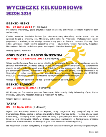 BESKID NISKI 01 - 04 maja 2014 (4-dniowa) Po sielskie krajobrazy, gdzie przyroda budzi się ze snu zimowego, a widoki mijanych dolin zachwycają. Chatka malucha, bacówka Bartne (po niepowtarzalną atmosferę, może znowu uda się spotkać kogoś z orkiestry św. Mikołaja), schronisko na Przełęczy Małastowskiej (znów pogadamy z kuchnią przez windę), romantyczny park w Siarach, rezerwat Kornuty. Tam gdzie Łemkowie wiedli kiedyś szczęśliwe życie - odwiedzimy wioski Radocyna, Regetow, Nieznajowa, Zdynia, do Folusza przez wodospad i diabelski kamień Własny śpiwór, karimata GÓRY ZŁOTE + MASYW ŚNIEŻNIKA 30 maja - 01 czerwca 2014 (3-dniowa) Wjazd na Borówkową Górę po ładne widoki, do schroniska Papresk po uzupełnienie cukrów (buchty mmmmniam, już teraz żałuję, że nie jestem wypalony kalorycznie), po uzupełnienie płynów do schroniska Na Versi, wjazd na Śnieżnik (i znów pozdrowimy słoniątko, pobiegamy po schronisku poetów, wdrapiemy się na cokół), zjazd na polską stronę schroniska na Śnieżniku (i znów zawiśniemy na stopniu), przez przełęcz Płoszczyna do ŚNIEZNEJ PUSZCZY, powrót przez góry Rychlebskie słynnymi ścieżkami rowerowymi. Wersja z własnym śpiworem lub bez - przed wyjazdem zdecydujemy. BESKID SĄDECKI 19 - 22 czerwca 2014 (4-dniowa) Od Krynicy po Szczawnice poprzez Jaworzynę, Wierchomlę, Halę Łabowską, Cyrle, Rytro, Prehybę, Czerwony Klasztor. Noclegi z widokiem na Tatry. Własny śpiwór, karimata TATRY 05 - 06 lipca 2014 (2-dniowa) Wjazd pod Kasprowy Wierch i za Krywań, mały podjeździk aby przejrzeć się w toni Popradskiego Plesa, nocleg w schronisku Zielone Pleso (miejsce bajka - Morskie oko w wersji kameralnej). Następny dzień spojrzenie na Tatry z perspektywy 1950 metrów - wjazd na Kralovą Holę (Królewska Góra), w drodze powrotnej zahaczymy o Tomaszkową przepaść (ostrożnie z hamowaniem, na krawędzi grozi 150 metrami swobodnego lotu) Na wszystkich trasach korzystamy z oficjalnych ścieżek rowerowych dobrze przygotowanych. Strona 1 z 2 BIESZCZADY 31 lipca - 03 sierpnia 2014 (4-dniowa) Tam przyroda żyje jeszcze własnym rytmem, tam też przypomnisz sobie, że cisza potrafi być piękna. Bazy studenckie Rabe Łopienka (herbaty z maciejki, kąpiele w górskim potoku, ogniska z zapachem drewna bukowego,rąbanie drewna) Koliba. szczyty Okraglik (zjazd do Roztok bajeczka),Krzemieniec, Wielka Rawka(żeby tylko słońce dopisało dobrą scenografię),magiczne miejsce Krywe, Chatka Puchatka, Połonina caryńska .Noclegi z widokiem na Tarnice Bukowe Berdo, Krzemieniec –nocleg na platformie widokowej długo pozostaje w pamięci Własny śpiwór, karimata GÓRY OPAWSKIE 15 - 17 sierpnia 2014 (3-dniowa) Wjazd na Biskupią Kopę, po zawrót głowy na wieży, przez góry Złote na przełęcz Rejviz (sprawdzimy, czy przybyły nowe twarze na oparciach), wjazd na Serak. Po trochę zmęczenia na Pradziada, przez schronisko Szwajcarka (torciki pychotka) na romantycznie położony zamek RABSZTEJN (i znów wdrapiemy się na zamek jak i na bardzo wysoooką ławę). Powrót przez nową wieże widokową w Albrechticach. ALPY (chyba że zorganizujemy transport – Dolomity) 30 sierpnia - 07 września 2014 (9-dniowa) Okolice doliny Dachstein. GÓRY IZERSKIE 11 - 14 września 2014 (4-dniowa) Przejazd singletrackami Smreka (ścieżki o szerokości ok. 30 cm, opona ok. 6cm –czyli 500% zapasu, poprowadzone po zboczu góry o dobrej nawierzchni), Jizera najwyżej położona wioska w Czechach, wieża widokowa Czerna Studnice, klasztor Hejnice (na kolację do pizzerii prowadzonej przez Włocha z wyśmienitym winem). Jednodniowy wypad do CZESKIEGO RAJU - Pantheon najdłuższy zamek skalny w Czechach, zakończony cyplem skalnym, skąd spojrzymy daleko w dół. Super zjazd do zamku Frydsztejn - oczywiście nie pominiemy wieży widokowej, skąd mamy całą panoramę Czeskiego Raju. ZE WZGLĘDÓW LOGISTYCZNYCH TERMINY ZWIEDZANYCH MIEJSC, MOŻE ULEC ZMIANIE WYJAZDÓW, JAK I KOLEJNOŚĆ Opracował: Krzysztof Banasz Strona 2 z 2