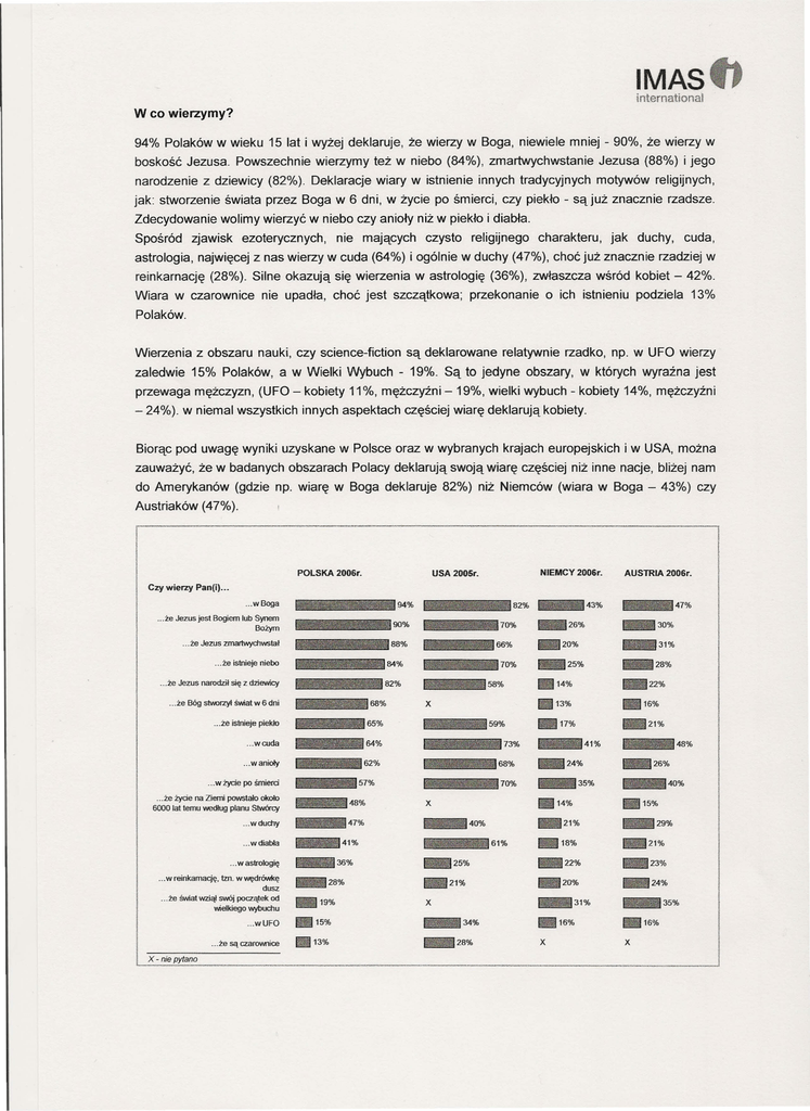 IMAS internationał w co wierzymy? 94% Polaków w wieku 15 lat i wyżej deklaruje, że wierzy w Boga, niewiele mniej - 90%, że wierzy w boskość Jezusa. Powszechnie wierzymy też w niebo (84%), zmartwychwstanie Jezusa (88%) i jego narodzenie z dziewicy (82%). Deklaracje wiary w istnienie innych tradycyjnych motywów religijnych, jak: stworzenie świata przez Boga w 6 dni, w życie po śmierci, czy piekło - są już znacznie rzadsze. Zdecydowanie wolimy wierzyć w niebo czy anioły niż w piekło i diabła. Spośród zjawisk ezoterycznych, nie mających czysto religijnego charakteru, jak duchy, cuda, astrologia, najwięcej z nas wierzy w cuda (64%) i ogólnie w duchy (47%), choć już znacznie rzadziej w reinkarnację (28%). Silne okazują się wierzenia w astrologię (36%), zwłaszcza wśród kobiet - 42%. Wiara w czarownice nie upadła, choć jest szczątkowa; przekonanie o ich istnieniu podziela 13% Polaków. Wierzenia z obszaru nauki, czy science-fiction są deklarowane relatywnie rzadko, np. w UFO wierzy zaledwie 15% Polaków, a w Wielki Wybuch - 19%. Są to jedyne obszary, w których wyraźna jest przewaga mężczyzn, (UFO - kobiety 11%, mężczyźni - 19%, wielki wybuch - kobiety 14%, mężczyźni - 24%). w niemal wszystkich innych aspektach częściej wiarę deklarują kobiety. Biorąc pod uwagę wyniki uzyskane w Polsce oraz w wybranych krajach europejskich i w USA, można zauważyć, że w badanych obszarach Polacy deklarują swoją wiarę częściej niż inne nacje, bliżej nam do Amerykanów (gdzie np. wiarę w Boga deklaruje 82%) niż Niemców (wiara w Boga - 43%) czy Austriaków (47%). POLSKA 2006r. Czy wierzy Pan(i) ... wBoga ... że Jezus jest Bogiem ... że istnieje niebo ... że Jezus narodził 11I._.11II•• AUSTRIA 2006r. ••• •• ... wanioły ... w życie po śmierci ... że życie na Ziemi powstało ok% 6000 lal temu według planu Stw6n::y ... wduchy ... wdiabla 1162% •••• 57% •• ••• 61148% 1147% dusz ... że świat wziął swój początek od wielkiego wybuchu ...wUFO ... że są czarownice 21% 73% 41% 24% 68% 13% _26% 40% 14% X 25% 15% 21% 40% 28% 48% 35% 70% 36% 15% 16% 59% 29% 18% 61% 19% 22% 13% ._.41% ... w astrologię tzn. w wędrówkę 28% 14% X 64% •••• ~31% 25% 58% 111111I65% ... WCOM 47% _30% 20% 70% 82% 68% _26% 66% 64% się z dziewicy ... że istnieje piekło 70% 11.1111 88% •••••• 43% 82% 90% ... że Bóg stv.<lrzyl świat w 6 dni x - nie pytano 94% lub Synem Bożym ... że Jezus zmartwychwstał ... w reinkarnację, NIEMCY 2006r. USA2005r. ... 21% IBl22% 23% 20% 24% 21% 31% X 34% 28% 35% 16% X 16% X