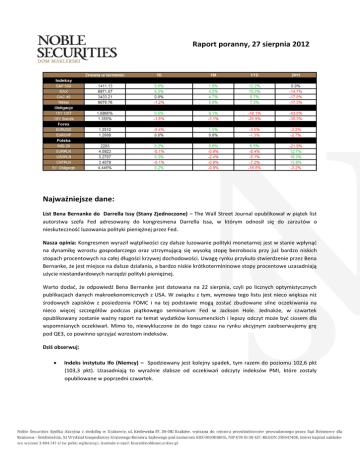 Raport poranny, 27 sierpnia 2012 Najważniejsze dane: List Bena Bernanke do Darrella Issy (Stany Zjednoczone) – The Wall Street Journal opublikował w piątek list autorstwa szefa Fed adresowany do kongresmena Darrella Issa, w którym odnosił się do zarzutów o nieskuteczność luzowania polityki pieniężnej przez Fed. Nasza opinia: Kongresmen wyraził wątpliwości czy dalsze luzowanie polityki monetarnej jest w stanie wpłynąć na dynamikę wzrostu gospodarczego oraz utrzymującą się wysoką stopę bezrobocia przy już bardzo niskich stopach procentowych na całej długości krzywej dochodowości. Uwagę rynku przykuło stwierdzenie przez Bena Bernanke, że jest miejsce na dalsze działania, a bardzo niskie krótkotermininowe stopy procentowe uzasadniają użycie niestandardowych narzędzi polityki pieniężnej. Warto dodać, że odpowiedź Bena Bernanke jest datowana na 22 sierpnia, czyli po licznych optymistycznych publikacjach danych makroekonomicznych z USA. W związku z tym, wymowa tego listu jest nieco większa niż środowych zapisków z posiedzenia FOMC i na tej podstawie mogą zostać zbudowane silne oczekiwania na nieco więcej szczegółów podczas piątkowego seminarium Fed w Jackson Hole. Jednakże, w czwartek opublikowany zostanie ważny raport na temat wydatków konsumenckich i lepszy odczyt może być ciosem dla wspomnianych oczekiwań. Mimo to, niewykluczone że do tego czasu na rynku akcyjnym zaobserwujemy grę pod QE3, co powinno sprzyjać wzrostom indeksów. Dziś obserwuj: Indeks instytutu Ifo (Niemcy) – Spodziewany jest kolejny spadek, tym razem do poziomu 102,6 pkt (103,3 pkt). Uzasadniają to wyraźnie słabsze od oczekiwań odczyty indeksów PMI, które zostały opubliowane w poprzedni czwartek. Analiza techniczna: Waluty EUR/USD Eurodolar dotarł do ciekawego miejsca oporu wynikającego z: - 38,2% ostatniego impulsu spadkowego - górnego ograniczenia kanału cenowego - górnych okolic wstęg Bollingera Dodatkowo na wykresie wyrysowała się formacja przypominająca objęcie bessy, a wskaźnik Stochastic wygenerował już techniczny sygnał sprzedaży. Tym samym jest szansa na kontynuację ruchu spadkowego, o którym wspominaliśmy w poprzedniej analizie, a najbliższym punktem wsparcia może okazać się poziom 1,2442, przy którym wypadają szczyty z 6 i 7 sierpnia. Jeśli udałoby się je przebić kurs mógłby przetestować dolne ograniczenie kanału cenowego, a ewentualne dalsze spadki mogłyby dopełnić formację flagi. Opór natomiast przebiega w okolicach wyżej wspomnianego zniesienia 38,2% na poziomie 1,2592. CHF/PLN Frank szwajcarski podjął w piątek pierwszą próbę wybicia się z kanału cenowego, jednak ostatecznie strona podażowa zatrzymała kupujących i kurs zamknął się tuż poniżej górnego ograniczenia kanału, a na wykresie wyrysowała się formacja szpulki, świadcząca raczej o niepewności na rynku. Korpus świecy zamknął się tuż poniżej ważnego poziomu oporu w okolicach zniesienia 38,2% ostatnich spadków. Warto więc obserwować zachowanie kursu w najbliższych dniach gdyż ewentualne trwałe wybicie powyższego oporu oraz kanału cenowego otworzyłoby drogę w kierunku kolejnych zniesień na poziomie: 3,4279 (50% ostatniego ruchu spadkowego) oraz 3,4476 (61,8%). Jeśli jednak doszłoby kolejny raz do odbicia od górnej linii kanału, kurs miałby szansę zakończyć obecną korektę i przetestować ponownie poziom 3,3662, stanowiący najbliższy istotny punkt wsparcia, od którego kurs odbił się ostatnio dwukrotnie. Analiza techniczna: WIG20 H1 Analiza techniczna: WIG20 Ostatnia korekta indeksu WIG20 na wykresie godzinowym przybrała postać klina zniżkującego, który został wybity w piątek w godzinach popołudniowych. Tym samym można oczekiwać, że w najbliższym czasie może dojść do ponownego testu poziomu 2295, stanowiącego koniec luki bessy z 22 sierpnia. W przypadku wybicia tego poziomu kolejny punkt oporu wyznacza przebita linia trendu wzrostowego, która wypada także w okolicach poziomu 2313 stanowiącego lokalny szczyt z 21 sierpnia, a także początek luki bessy z 17 sierpnia. Jeśli jednak do głosu doszłaby strona podażowa najbliższe punkty obrony wyznaczają ostatnie dołki w okolicach 2264, a w przypadku ich przebicia potencjalnym punktem wsparcia mógłby okazać się poziom 2251, stanowiący zniesienie 38,2% ostatniego impulsu wzrostowego. Departament Analiz Rynkowych Noble Securities S.A. Najważniejsze wydarzenia: Sebastian Trojanowski, Doradca Inwestycyjny [email protected] Tel: +48 785 933 681 Analiza techniczna – GPW: Dominik Łebek, Departament Rynków Zagranicznych [email protected] Tel: +48 22 212 54 35 Analiza techniczna – waluty: Dominik Łebek, Departament Rynków Zagranicznych [email protected] Tel: +48 22 212 54 35 Jeżeli nie życzą sobie Państwo otrzymywać codziennego Przeglądu Rynków Noble Securities S.A., prosimy o odesłanie pustego maila z tematem "Wypisz_mnie". Niniejsze opracowanie jest jedynie materiałem informacyjnym do użytku odbiorcy. Materiał został przygotowany z należytą starannością i rzetelnością, na podstawie ogólnodostępnych informacji, ale ani autor, ani Noble Securities S.A. nie gwarantują jego kompletności i dokładności. Wszystkie opinie i prognozy przedstawione w tym opracowaniu są jedynie wyrazem opinii autora (autorów) w dniu publikacji i i nie są to opinie czy prognozy Noble Securities S.A., a opinie te lub prognozy mogą ulec zmianie bez zapowiedzi. Materiał nie został sporządzony zgodnie z wymogami określonymi w Rozporządzeniu Ministra Finansów z dnia 19 października 2005r. w sprawie informacji stanowiących rekomendacje dotyczące instrumentów finansowych, ich emitentów lub wystawców (Dz.U. Nr 206, poz. 1715). Nie stanowi rekomendacji w rozumieniu tego Rozporządzenia, nie powinien być też rozumiany jako materiał o charakterze doradczym lub jako podstawa do podejmowania działań lub decyzji inwesty