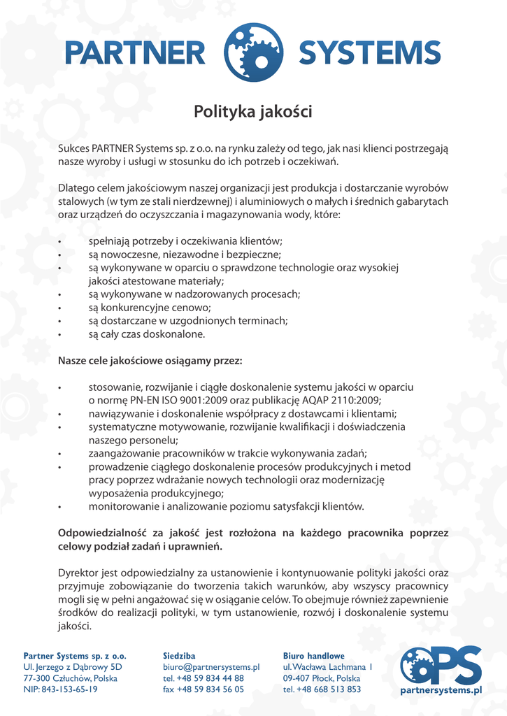 Polityka jakości Sukces PARTNER Systems sp. z o.o. na rynku zależy od tego, jak nasi klienci postrzegają nasze wyroby i usługi w stosunku do ich potrzeb i oczekiwań. Dlatego celem jakościowym naszej organizacji jest produkcja i dostarczanie wyrobów stalowych (w tym ze stali nierdzewnej) i aluminiowych o małych i średnich gabarytach oraz urządzeń do oczyszczania i magazynowania wody, które: • • • • • • • spełniają potrzeby i oczekiwania klientów; są nowoczesne, niezawodne i bezpieczne; są wykonywane w oparciu o sprawdzone technologie oraz wysokiej jakości atestowane materiały; są wykonywane w nadzorowanych procesach; są konkurencyjne cenowo; są dostarczane w uzgodnionych terminach; są cały czas doskonalone. Nasze cele jakościowe osiągamy przez: • • • • • • stosowanie, rozwijanie i ciągłe doskonalenie systemu jakości w oparciu o normę PN-EN ISO 9001:2009 oraz publikację AQAP 2110:2009; nawiązywanie i doskonalenie współpracy z dostawcami i klientami; systematyczne motywowanie, rozwijanie kwalifikacji i doświadczenia naszego personelu; zaangażowanie pracowników w trakcie wykonywania zadań; prowadzenie ciągłego doskonalenie procesów produkcyjnych i metod pracy poprzez wdrażanie nowych technologii oraz modernizację wyposażenia produkcyjnego; monitorowanie i analizowanie poziomu satysfakcji klientów. Odpowiedzialność za jakość jest rozłożona na każdego pracownika poprzez celowy podział zadań i uprawnień. Dyrektor jest odpowiedzialny za ustanowienie i kontynuowanie polityki jakości oraz przyjmuje zobowiązanie do tworzenia takich warunków, aby wszyscy pracownicy mogli się w pełni angażować się w osiąganie celów. To obejmuje również zapewnienie środków do realizacji polityki, w tym ustanowienie, rozwój i doskonalenie systemu jakości. Partner Systems sp. z o.o. Ul. Jerzego z Dąbrowy 5D 77-300 Człuchów, Polska NIP: 843-153-65-19 Siedziba [email protected] tel. +48 59 834 44 88 fax +48 59 834 56 05 Biuro handlowe ul. Wacława Lachmana 1 09-407 Płock, Polska tel. +48 668 513 853 partnersystems.pl