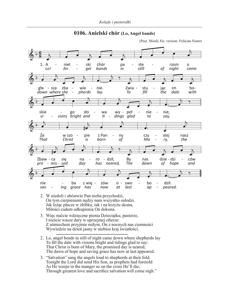 Kolędy i pastorałki 0106. Anielski chór (Lo, Angel bands) (Past. Miod), En. version: Felician Sisters 1. A Lo! niel An - gła - sza zba down where she - skie vi - Że That w szo Christ - chór bands pa in wie - nie. pherds lay. go sło sions bright and Zbaw - ca się pro - mis - sed nie sav ski gel ste still Zwia To z Pan born - ny of ro - dził, has neared, ba z wię ing grace has zów now - stu fill wa wy - peł ti - dings glad pie is na day - nie to czy Ma By The o - swo at last of - bo ap o came im dale bowith jąc the - nie, say, - stej ry, nas dawn - rzom night nasz the dzie - dzi of hope - 2. W niedoli i ubóstwie Pan nieba przychodzi, On tym cierpieniem nędzy nam wszystko osłodzi. Jak leżąc płacze w żłóbku, tak i na krzyżu skona, Miłości cudem odkupienia On dokona. 3. Więc nućcie wdzięczne pienia Dzieciątku, pasterze, I nieście wasze dary w uprzejmej ofierze: Z uśmiechem przyjmie miłym. On z nocnych nas ciemności Wywiedzie na dzień jasny w niebios kraj światłości. 2. Lo, angel bends in still of night came down where shepherds lay To fill the dale with visions bright and tidings glad to say: That Christ is born of Mary, the promised day is neared, The dawn of hope and saving grace has now at last appeared. 3. “Salvation” sang the angels loud to shepherds at their fold. Tonight the Lord did send His Son, as prophets had foretold As He weeps in the manger so on the cross He’ll die; Through greatest love and sacrifice salvation will come nigh.” dził. peared. ców and
