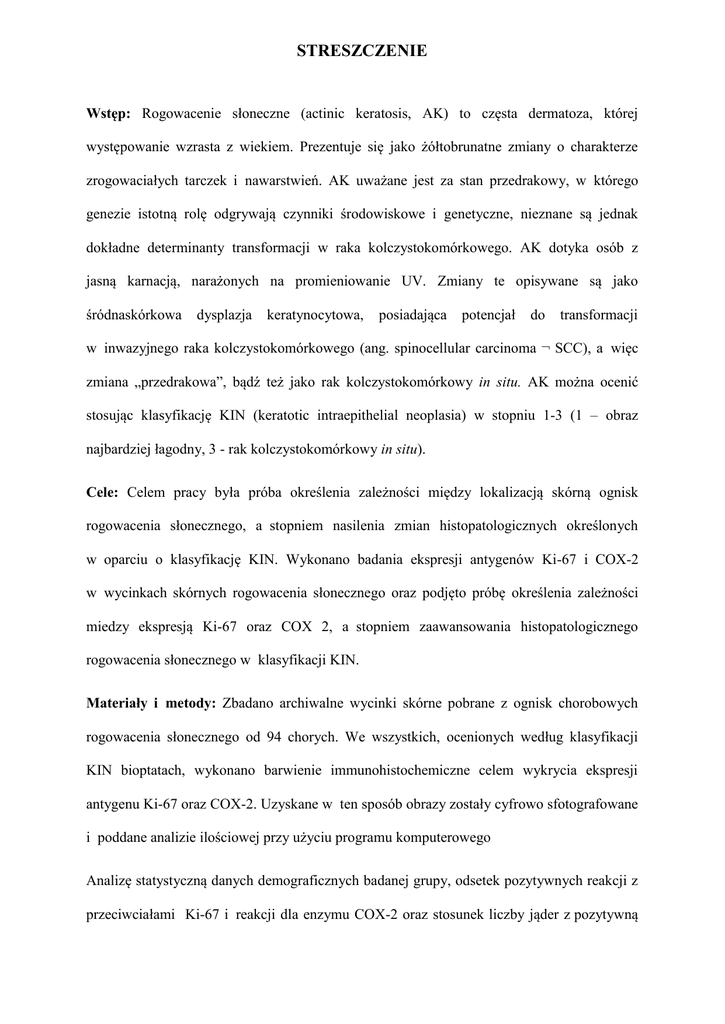 STRESZCZENIE Wstęp: Rogowacenie słoneczne (actinic keratosis, AK) to częsta dermatoza, której występowanie wzrasta z wiekiem. Prezentuje się jako żółtobrunatne zmiany o charakterze zrogowaciałych tarczek i nawarstwień. AK uważane jest za stan przedrakowy, w którego genezie istotną rolę odgrywają czynniki środowiskowe i genetyczne, nieznane są jednak dokładne determinanty transformacji w raka kolczystokomórkowego. AK dotyka osób z jasną karnacją, narażonych na promieniowanie UV. Zmiany te opisywane są jako śródnaskórkowa dysplazja keratynocytowa, posiadająca potencjał do transformacji w inwazyjnego raka kolczystokomórkowego (ang. spinocellular carcinoma ¬ SCC), a więc zmiana „przedrakowa”, bądź też jako rak kolczystokomórkowy in situ. AK można ocenić stosując klasyfikację KIN (keratotic intraepithelial neoplasia) w stopniu 1-3 (1 – obraz najbardziej łagodny, 3 - rak kolczystokomórkowy in situ). Cele: Celem pracy była próba określenia zależności między lokalizacją skórną ognisk rogowacenia słonecznego, a stopniem nasilenia zmian histopatologicznych określonych w oparciu o klasyfikację KIN. Wykonano badania ekspresji antygenów Ki-67 i COX-2 w wycinkach skórnych rogowacenia słonecznego oraz podjęto próbę określenia zależności miedzy ekspresją Ki-67 oraz COX 2, a stopniem zaawansowania histopatologicznego rogowacenia słonecznego w klasyfikacji KIN. Materiały i metody: Zbadano archiwalne wycinki skórne pobrane z ognisk chorobowych rogowacenia słonecznego od 94 chorych. We wszystkich, ocenionych według klasyfikacji KIN bioptatach, wykonano barwienie immunohistochemiczne celem wykrycia ekspresji antygenu Ki-67 oraz COX-2. Uzyskane w ten sposób obrazy zostały cyfrowo sfotografowane i poddane analizie ilościowej przy użyciu programu komputerowego Analizę statystyczną danych demograficznych badanej grupy, odsetek pozytywnych reakcji z przeciwciałami Ki-67 i reakcji dla enzymu COX-2 oraz stosunek liczby jąder z pozytywną reakcją do liczby jąder z negatywną reakcją w podgrupach ze względu na płeć, KIN a także fototyp, przedstawiono za pomocą liczebności, wartości średniej, mediany, wartości minimalnej i maksymalnej oraz odchylenia standardowego. Za pomocą liczebności i odsetka przedstawiono dane dotyczące lokalizacji zmian, klasyfikacji rogowacenia słonecznego oraz fototypu. Wyniki: Przebadano 94 osoby (58 kobiet i 36 mężczyzn) w średnim wieku 76 lat, z czego u 32 chorych stwierdzono AK w stopniu KIN1, 53 w stopniu KIN2 i 10 w stopniu KIN3. Wszyscy chorzy prezentowali fototyp 2 lub 3. u 50 (54%) badanych osób występował fototyp 2, u 44 pacjentów (46%) fototyp 3. Te same proporcje można zauważyć w grupie kobiet i mężczyzn: u 31 (53%) kobiet i 20 (56%) mężczyzn stwierdzono fototyp 2, a 28 (47%) kobiet i 16 (44%) mężczyzn fototyp 3. w grupie kobiet KIN1 rozpoznano u 36%, KIN2 u 53% a KIN3 u 12%, natomiast u mężczyzn odpowiednio u 31%, 61%, 8%. Nie wykazano zależności pomiędzy lokalizacją zmian a stopniem nasilenia rogowacenia słonecznego w klasyfikacji KIN, jak również nie wykazano różnic w ekspresji Ki-67, ani COX-2 w zależności od wieku, płci czy fototypu. w przypadku reakcji antygenu Ki-67 wykazano istotną statystycznie korelację ze stanem zaawansowania AK w klasyfikacji KIN, czego nie potwierdzono dla cyklooksygenazy-2. Wnioski: Nie wykazano zależności pomiędzy lokalizacją ognisk rogowacenia słonecznego, a zaawansowaniem zmian obserwowanym w badaniu histopatologicznym, jak również między ekspresją antygenów Ki-67 i COX-2 w wycinkach skórnych rogowacenia słonecznego a wiekiem, płcią i fototypem skóry chorych. Wykazano jednak istotną korelację między nasileniem reakcji immunohistochemicznej z przeciwciałem przeciw antygenem Ki67 a stopniem zaawansowania histopatologicznego zmian rogowacenia słonecznego według klasyfikacji KIN, a nie stwierdzono takiej korelacji dla reakcji z przeciwciałem anty-COX.