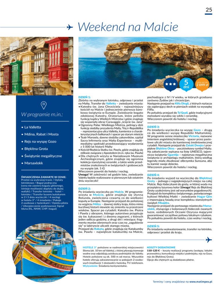 25 Weekend na Malcie 5 dni W programie m.in.: •La Valletta •Mdina, Rabat i Mosta •Rejs na wyspę Gozo •Błękitna Grota •Świątynie megalityczne •Marsaxlokk ŚWIADCZENIA ZAWARTE W CENIE: Przelot na wybranej trasie / Opłaty lotniskowe / Bagaż podręczny (cena nie zawiera bagażu głównego, istnieje możliwość dopłaty do dużej walizki) / Transfer lotnisko – hotel – lotnisko / Transfer busem/autokarem w 2 i 3 dniu wycieczki / 4 noclegi w hotelu 3* / 4 śniadania / Pokoje 2-osobowe z łazienkami / Opieka pilota / Ubezpieczenie podstawowe Signal Iduna (KL, NNW, CHP i bagaż) DZIEŃ 1: Zbiórka na wybranym lotnisku, odprawa i przelot na Maltę. Transfer do Valletty – zwiedzanie miasta: •Katedra św. Jana Chrzciciela – najważniejszy kościół na Malcie i jednocześnie pierwsza barokowa świątynia w Europie. Zwiedzanie bogato zdobionej Katedry, Oratorium, które pełniło funkcję kaplicy Wielkich Mistrzów i gdzie znajduje się wspaniały obraz Caravaggio „ścięcie św. Jana” •Ogromny Pałac Wielkiego Mistrza, pełniący dziś funkcję siedziby prezydenta Malty, Triq ir-Repubblika – reprezentacyjna ulica Valletty, kamienice o charakterystycznych balkonach i spacer po starym mieście •Teatr Manoela, dawne siedziby zakonników, szpital Sacra Infirmeria oraz Malta Experience – multimedialny spektakl przedstawiający wydarzenia z 5 000 lat historii Malty •Kościół Rozbicia Statku św. Pawła, gdzie znajdują się relikwie związane z Apostołem (m.in. ręka św. Pawła) •Dla chętnych wizyta w Narodowym Muzeum Archeologicznym, gdzie znajduje się ogromna kolekcja starożytnej ceramiki, a także wiele przedmiotów znalezionych w świątyniach i grobowcach na wyspie (ok. 5 €) Wieczorem powrót do hotelu i nocleg. Uwaga! W zależności od godzin lotu, zwiedzanie Valetty będzie realizowane w pierwszym lub ostatnim dniu wycieczki! DZIEŃ 2: Po śniadaniu wycieczka po Malcie. W programie: wizyta w Moście, gdzie znajduje się słynna Rotunda, zwieńczona czwartą co do wielkości kopułą w Europie. Następnie przejazd do położonej na wzgórzu Mdiny – dawnej stolicy kraju, która mimo burzliwej historii niewiele się zmieniła na przestrzeni wieków. Spacer po cytadeli; Katedra św. Piotra i Pawła z obrazem, którego autorstwo przypisuje się św. Łukaszowi i z dwoma zegarami, z których jeden odlicza godziny, a drugi dni i miesiące; fragmenty murów obronnych oraz czas na „zagubienie się” w labiryncie uliczek starego miasta. Przejazd do Rabatu, gdzie znajdują się Katakumby św. Pawła – największe katakumby na Malcie, HOTELE 3* położone w nadmorskiej miejscowości Sliema (ok. 10 km od Valetty), z której pływają tramwaje wodne oraz odjeżdżają autobusy podmiejskie do Valetty. Hotele położone są ok. 500 m od morza. Wszystkie hotele oferują zakwaterowanie w pokojach 2-osobowych (możliwość 1 dostawki) z łazienką, TV i telefonem. Wyżywienie: Śniadania kontynentalne. CENY JUŻ OD 2 099 zł pochodzące z IV i V wieku, w których grzebano zarówno Żydów jak i chrześcijan. Następnie przejazd na Klify Dingli, z których roztacza się zapierający dech w piersiach widok na wysepkę Filfla. Po południu przejazd do Ta’Quali, gdzie tradycyjnymi metodami wyrabia się szkło i ceramikę. Wieczorem powrót do hotelu i nocleg. DZIEŃ 3: Po śniadaniu wycieczka na wyspę Gozo – drugą co do wielkości wyspę Republiki Maltańskiej. W programie senne miasteczko Victoria, nazwane imieniem angielskiej królowej – spacer przez pastelowe uliczki miasta do kamiennej średniowiecznej cytadeli. Następnie przejazd do Zatoki Dwejra i przepiękne Błękitne Okno – pocztówkowy symbol Malty. Na zakończenie wpisana na listę UNESCO, tajemnicza świątynia Ggantija – najstarsza megalityczna świątynia w archipelagu maltańskim, którą według legendy miała zbudować olbrzymka Sunsuna, aby tu karmić swoje dziecko. Wieczorem powrót do hotelu i nocleg. DZIEŃ 4: Po śniadaniu wyjazd na wycieczkę do Błękitnej Groty – jednego z najpiękniejszych miejsc na całej Malcie. Rejs łódeczkami do groty, w której woda ma przepiękny lazurowy kolor (Uwaga! Rejs do Błękitnej Groty uzależniony jest od warunków pogodowych). Przejazd do kompleksu świątynnego, poświęconego kultowi Wielkiej Matki – zwiedzanie Hagar Qim z imponującą fasadą oraz kompleksu starożytnych świątyń Mnajdra. Następnie przejazd do portowego miasteczka Marsaxlokk, słynącego z kolorowych łódeczek zwanych luzze, ozdobionych Oczami Ozyrysa mającymi gwarantować szczęśliwe połowy lokalnym rybakom. Po południu powrót do hotelu, czas wolny i nocleg. DZIEŃ 5: Po śniadaniu wykwaterowanie, transfer na lotnisko, odprawa i przelot do kraju. KOSZTY DODATKOWE 110-120 € – koszty realizacji programu (wstępy, lokalni przewodnicy, komunikacja miejska i podmiejska, rejs na Gozo, rejs do Błękitnej Groty). Opcje dla chętnych są dodatkowo płatne. Terminy i ceny znajdziesz na www.matimpex.pl