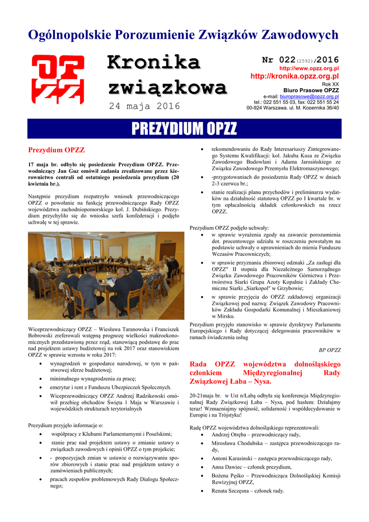 Ogólnopolskie Porozumienie Związków Zawodowych Kronika związkowa 24 maja 2016 Nr 022(2592)/2016 http://www.opzz.org.pl http://kronika.opzz.org.pl Rok XX Biuro Prasowe OPZZ e-mail: [email protected] tel.: 022 551 55 03, fax: 022 551 55 24 00-924 Warszawa, ul. M. Kopernika 36/40 PREZYDIUM OPZZ Prezydium OPZZ 17 maja br. odbyło się posiedzenie Prezydium OPZZ. Przewodniczący Jan Guz omówił zadania zrealizowane przez kierownictwo centrali od ostatniego posiedzenia prezydium (20 kwietnia br.). rekomendowaniu do Rady Interesariuszy Zintegrowanego Systemu Kwalifikacji: kol. Jakuba Kusa ze Związku Zawodowego Budowlani i Adama Jarosińskiego ze Związku Zawodowego Przemysłu Elektromaszynowego; -przygotowaniach do posiedzenia Rady OPZZ w dniach 2-3 czerwca br.; stanie realizacji planu przychodów i preliminarza wydatków na działalność statutową OPZZ po I kwartale br. w tym opłacalnością składek członkowskich na rzecz OPZZ. Następnie prezydium rozpatrzyło wniosek przewodniczącego OPZZ o powołanie na funkcję przewodniczącego Rady OPZZ województwa zachodniopomorskiego kol. J. Dubińskiego. Prezydium przychyliło się do wniosku szefa konfederacji i podjęło uchwałę w tej sprawie. Prezydium OPZZ podjęło uchwały: w sprawie wyrażenia zgody na zawarcie porozumienia dot. procentowego udziału w roszczeniu powstałym na podstawie uchwały o uprawnieniach do mienia Funduszu Wczasów Pracowniczych; w sprawie przyznania zbiorowej odznaki „Za zasługi dla OPZZ" II stopnia dla Niezależnego Samorządnego Związku Zawodowego Pracowników Górnictwa i Przetwórstwa Siarki Grupa Azoty Kopalnie i Zakłady Chemiczne Siarki „Siarkopol" w Grzybowie; Wiceprzewodniczący OPZZ – Wiesława Taranowska i Franciszek Bobrowski zreferowali wstępną prognozę wielkości makroekonomicznych przedstawioną przez rząd, stanowiącą podstawę do prac nad projektem ustawy budżetowej na rok 2017 oraz stanowiskiem OPZZ w sprawie wzrostu w roku 2017: wynagrodzeń w gospodarce narodowej, w tym w państwowej sferze budżetowej; minimalnego wynagrodzenia za pracę; emerytur i rent z Funduszu Ubezpieczeń Społecznych. Wiceprzewodniczący OPZZ Andrzej Radzikowski omówił przebieg obchodów Święta 1 Maja w Warszawie i wojewódzkich strukturach terytorialnych Prezydium przyjęło informacje o: w sprawie przyjęcia do OPZZ zakładowej organizacji Związkowej pod nazwą: Związek Zawodowy Pracowników Zakładu Gospodarki Komunalnej i Mieszkaniowej w Mirsku. Prezydium przyjęło stanowisko w sprawie dyrektywy Parlamentu Europejskiego i Rady dotyczącej delegowania pracowników w ramach świadczenia usług BP OPZZ Rada OPZZ województwa dolnośląskiego członkiem Międzyregionalnej Rady Związkowej Łaba – Nysa. 20-21maja br. w Ust n/Łabą odbyła się konferencja Międzyregionalnej Rady Związkowej Łaba – Nysa, pod hasłem: Działajmy teraz! Wzmacniajmy spójność, solidarność i współdecydowanie w Europie i na Trójstyku! Radę OPZZ województwa dolnośląskiego reprezentowali: Andrzej Otręba – przewodniczący rady, współpracy z Klubami Parlamentarnymi i Poselskimi; stanie prac nad projektem ustawy o zmianie ustawy o związkach zawodowych i opinii OPZZ o tym projekcie; Mirosława Chodubska – zastępca przewodniczącego rady, - propozycjach zmian w ustawie o rozwiązywaniu sporów zbiorowych i stanie prac nad projektem ustawy o zamówieniach publicznych; Antoni Karasinski – zastępca przewodniczącego rady, Anna Dawiec – członek prezydium, Bożena Pęśko – Przewodnicząca Dolnośląskiej Komisji Rewizyjnej OPZZ, Renata Szczęsna – członek rady. pracach zespołów problemowych Rady Dialogu Społecznego; MRZ to międzyregionalna struktura związkowa działająca na pograniczu Niemiec, Czech i Polski. Należą do niej: CzeskoMorawska Konfederacja Związków Zawodowych, Rada Regionalna Usti i Liberec, Niemiecka Federacja Związków Zawodowych Region Saksonia, Region Jeleniogórski NSZZ Solidarność, a od 21 maja br. Rada OPZZ województwa dolnośląskiego. Rada wspiera dialog związkowy i koordynuje działania organizacji partnerskich. Konferencja przyjęła Raport z działalności MRZ Łaba-Nysa za lata 2013- 2016. Dokonano wyboru władz na kadencje 2016-2018. Przewodniczącym MRZ Łaba – Nysa został Andrzej Otręba – przewodniczący Rady OPZZ województwa dolnośląskiego. Jego wybór wieńczy wieloletnie starania rady wojewódzkiej o przyjęcie jej do składu MRZ Łaba – Nysa. W opinii niemieckich związkowców fakt przyjęcia rady wojewódzkiej do MRZ ma wymiar historyczny, bowiem jednoczy wszystkie organizacje związkowe działające na styku granic trzech państw i stwarza możliwość pełnej współpracy na rzecz wzmacniania spójności, solidarności i współdecydowania w Europie. Uczestnicy konferencji dyskutowali o zagrożeniach wynikających z kryzysów gospodarczych i migracyjnych. Rozmawiano o spadku wiarygodności instytucji Unii Europejskiej, a także o umowie handlowej ze Stanami Zjednoczonymi. Podkreślano znaczenie związków zawodowych w działaniu na rzecz ochrony miejsc pracy, godnej płacy i emerytury zapewniających odpowiedni poziom życia i racjonalnym poziomie minimalnego wynagrodzenia za pracę. Konferencja przyjęła Strategiczny plan działania Międzyregionalnej Rady Związkowej Łaba-Nysa na lata 2016-2018 obejmujący zadania w zakresie polityki strukturalnej, liberalizacji usług publicznych, polityki zatrudnienia, kształcenia młodzieży i możliwości jej rozwoju zawodowego oraz powiązań sektorowych. RW OPZZ WDS Płace i emerytury powinny szybciej rosnąć W środę 18 maja br. trzy centrale związkowe: OPZZ, Forum Związków Zawodowych i NSZZ „Solidarność" przyjęły wspólne stanowisko w sprawie propozycji wzrostu w 2017 roku wynagrodzeń w gospodarce narodowej, w tym w państwowej sferze budżetowej, minimalnego wynagrodzenia za pracę oraz emerytur i rent z Funduszu Ubezpieczeń Społecznych. W naszej ocenie: wzrost wynag
