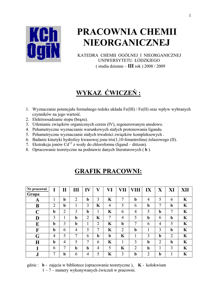 1 PRACOWNIA CHEMII NIEORGANICZNEJ KATEDRA CHEMII OGÓLNEJ I NIEORGANICZNEJ UNIWERSYTETU ŁÓDZKIEGO ( studia dzienne – III rok ) 2008 / 2009 WYKAZ ĆWICZEŃ : 1. Wyznaczanie potencjału formalnego redoks układu Fe(III) / Fe(II) oraz wpływ wybranych czynników na jego wartość. 2. Elektroosadzanie stopu (brązu). 3. Utlenianie związków organicznych cerem (IV), regenerowanym anodowo. 4. Pehametryczne wyznaczanie warunkowych stałych protonowania ligandu. 5. Pehametryczne wyznaczanie stałych trwałości związków kompleksowych . 6. Badanie kinetyki hydrolizy kwasowej jonu tris(1,10-fenantrolina) żelazowego (II). 7. Ekstrakcja jonów Cd+2 z wody do chloroformu (ligand – ditizon). 8. Opracowanie teoretyczne na podstawie danych literaturowych ( b ). GRAFIK PRACOWNI: Nr pracowni Grupa A B C D E F G H I J I II III IV V VI 1 2 b 3 b b 4 b 6 7 b b 2 1 3 6 5 4 7 b 2 1 3 b b 4 7 5 b 6 b 3 b 2 1 5 6 7 b 4 3 K 1 K 2 7 b 6 4 5 K 4 K 7 K K b K 5 K VII VIII 7 5 6 4 b 2 K 1 K 3 b 6 4 5 7 b 1 3 2 b IX X XI XII 4 b 5 b 6 1 3 b b 2 5 7 b 6 4 3 b 2 1 b 6 b 7 b 5 b 2 b 3 1 K K K K K K K K K K gdzie : b - zajęcia w bibliotece (opracowanie teoretyczne ), K - kolokwium 1 – 7 – numery wykonywanych ćwiczeń w pracowni. 2 ZALICZENIE PRACOWNI : Aby zaliczyć pracownię trzeba spełnić koniecznie wszystkie następujące warunki: 1. Zaliczyć dwa kolokwia. 2. Zdobyć minimum 14 pkt (w wypadku nie uzyskania wymaganej ilości punktów trzeba zdać trzecie kolokwium – zaliczenie w terminie poprawkowym). 3. Wykonać minimum 5 ćwiczeń. 4. Oddać opracowanie zagadnienia teoretycznego na podstawie zebranej literatury wraz z notatkami. 5. Oddać paczkę ligniny. 6. Oddać sprawozdania z wszystkich wykonywanych ćwiczeń (wg załączonego wzoru, str 6) 7. Uregulować ewentualne należności za zniszczony sprzęt. PUNKTACJA NA PRACOWNI : - zaliczenie kolokwium w pierwszym terminie - stopień x 2 = + liczba pkt. zaliczenie kolokwium w drugim terminie - stopień x 1 = + liczba pkt. zaliczenie kolokwium w trzecim i dalszych terminach – 0 pkt. poprawnie wykonane sprawozdanie z ćwiczenia - +1 pkt. (z ćwicz. 4 i 5 - + 2 pkt.) drobne błędy w sprawozdaniu (np. błędy rachunkowe, niestarannie wykonane wykresy) – 0 pkt. (z ćwicz. 4 i 5 – 0 lub + 1 pkt.) - poważne błędy w sprawozdaniu - - 1 pkt. - niepełne sprawozdanie – (w zależności od wielkości braku: -1 lub - 2 pkt.) - brak wstępu teoretycznego - - 2 pkt. (dodatkowo brak zgody na wykonywanie ćwiczenia). - niepełny wstęp teoretyczny (w zależności od wielkości braku) - - 1 pkt lub – 2 pkt (przy „– 2 pkt.” brak zgody na wykonywanie ćwiczenia). - nie przygotowanie się do ćwiczeń (nieznajomość zagadnień teoretycznych) lub brak sprawozdania z poprzednio wykonywanego ćwiczenia - - 2 pkt (dodatkowo brak zgody na wykonywanie w danym dniu ćwiczenia, co jest równoważne nieusprawiedliwionej nieobecności). - nieobecność usprawiedliwiona - 0 pkt. - nieobecność nieusprawiedliwiona - - 2 pkt. - pozostawienie nieposprzątanego stanowiska - -1pkt. - preparat teoretyczny - od 0 pkt do +4 pkt. - premia za zdanie obydwu kolokwiów w pierwszym wyznaczonym terminie ( bez korzystania ze zwolnień lekarskich, bez “odsyłek”, bez oceny 3-) - + 2 pkt. UWAGA: ocena 3- jest równoważna 5 pkt w I terminie, 2,5 pkt w II terminie. Otrzymane punkty są podstawą do wystawienia oceny końcowej: od 14 pkt ÷ poniżej 19 pkt od 19 pkt ÷ poniżej 24 pkt od 24 pkt ÷ poniżej 28 pkt od 28 pkt ÷ poniżej 32 pkt od 32 pkt ÷ 35 pkt 3 3+ 4 4+ 5 3 U W A G A: studenci ITS, MSMP wykonują ćwiczenia nr 1, 2, 3, 4, 7 i aby zaliczyć pracownię muszą spełnić koniecznie wszystkie następujące warunki: 1. Zaliczyć jedno kolokwium. 2. Zdobyć minimum 10 pkt. 3. Wykonać minimum 4 ćwiczenia. Inne zasady punktacji jak na str. 2 (bez premii + 2 pkt.) Otrzymane punkty będą podstawą do wystawienia oceny końcowej wg następującej punktacji: od 10 pkt ÷ poniżej 13 pkt od 13 pkt ÷ poniżej 15 pkt od 15 pkt ÷ poniżej 17 pkt od 17 pkt ÷ poniżej 19 pkt od 19 pkt ÷ 20 pkt 3 3+ 4 4+ 5 4 ZAKRESY TEMATYCZNE WSTĘPÓW TEORETYCZNYCH DLA POSZCZEGÓLNYCH ĆWICZEŃ. UWAGA: Przedstawione tematy stanowią wymagane minimum, które należy uwzględnić przy opracowywaniu wstępów. Oczywiście tematykę można dowolnie rozszerzać, tak by stanowiła ona pomoc w przygotowaniu się do kolokwiów. Z drugiej strony należy zadbać, aby wstępy były możliwie zwięzłe i ściśle dotyczyły podanego tematu. Poniższe tematy pokrywają się z zakresami wymagań na kolokwia. ĆWICZENIE 1. Potencjał redoks układu: standardowy, formalny, rzeczywisty. Typy i rodzaje elektrod. Potencjały elektrod. Szereg elektrochemiczny (napięciowy) metali i jego wykorzystanie. Zależność pomiędzy aktywnością pierwiastka a jego położeniem w szeregu elektrochemicznym. Czynniki wpływające na wartość potencjału redoks układu: wpływ elektrolitu podstawowego, odczynu roztworu, kompleksowania i rozpuszczalnika. Teoria Pearsona twardych i miękkich kwasów i zasad i jej zastosowanie. ĆWICZENIE 2. Polaryzacja, nadpotencjał (nadnapięcie) i ich rodzaje. Metody regulowania nadpotencjału. Krzywe polaryzacyjne. Równanie i krzywe Tafela. Wydzielanie metali na elektrodzie rtęciowej i elektrodach stałych. Teoria pasmowa ciała stałego. Stopy. Właściwości fizykochemiczne składników a typ tworzonego stopu. Wykresy fazowe stopów. ĆWICZENIE 3. Podstawy teoretyczne elektrosyntezy. Podstawowe mechanizmy elektrodowych reakcji syntezy. Dobór warunków elektrosyntezy (rozpuszczalnik, elektroda odniesienia, elektrolit podstawowy, materiał elektrodowy). Prawa elektrolizy Faradaya i ich wykorzystanie. Bilansowanie połówkowych równań redoks z udziałem substancji organicznych. ĆWICZENIE 4. Teoria pola krystalicznego. Kompleksy wysoko- i niskospinowe. Energia stabilizacji pola krystalicznego. Trwałość związków kompleksowych i czynniki wpływające na nią. Pehametryczn