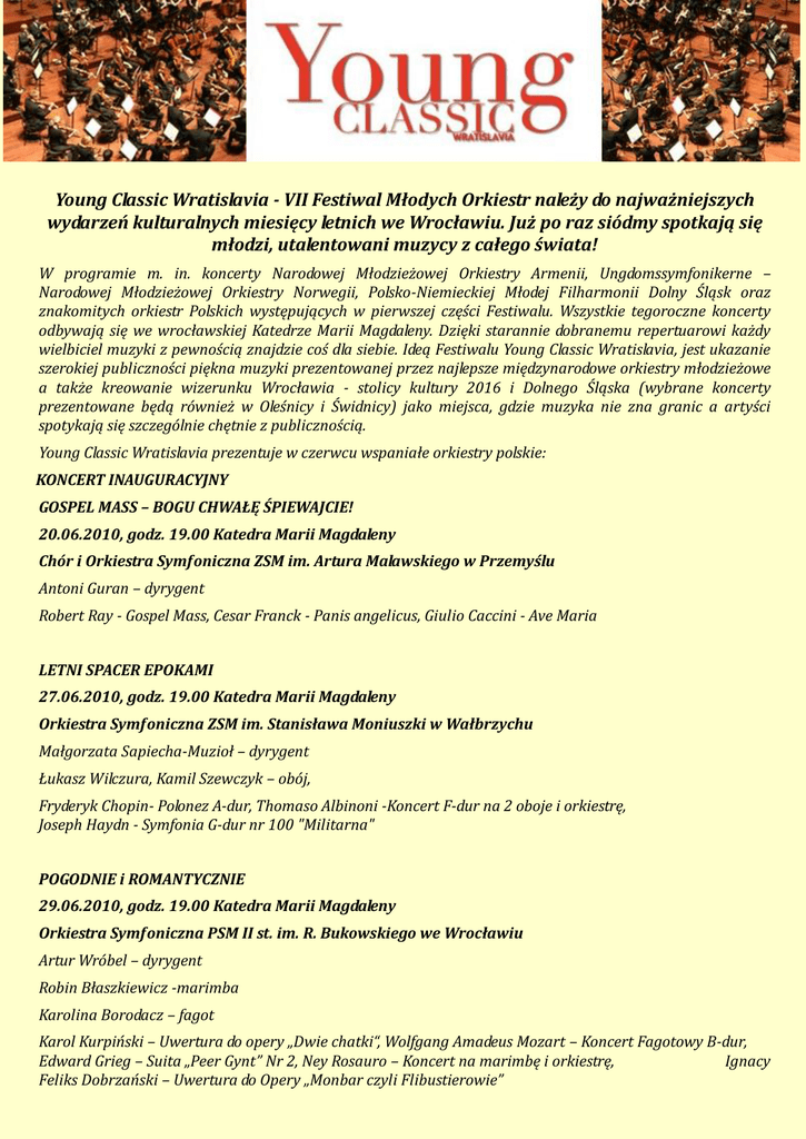 Young Classic Wratislavia - VII Festiwal Młodych Orkiestr należy do najważniejszych wydarzeń kulturalnych miesięcy letnich we Wrocławiu. Już po raz siódmy spotkają się młodzi, utalentowani muzycy z całego świata! W programie m. in. koncerty Narodowej Młodzieżowej Orkiestry Armenii, Ungdomssymfonikerne – Narodowej Młodzieżowej Orkiestry Norwegii, Polsko-Niemieckiej Młodej Filharmonii Dolny Śląsk oraz znakomitych orkiestr Polskich występujących w pierwszej części Festiwalu. Wszystkie tegoroczne koncerty odbywają się we wrocławskiej Katedrze Marii Magdaleny. Dzięki starannie dobranemu repertuarowi każdy wielbiciel muzyki z pewnością znajdzie coś dla siebie. Ideą Festiwalu Young Classic Wratislavia, jest ukazanie szerokiej publiczności piękna muzyki prezentowanej przez najlepsze międzynarodowe orkiestry młodzieżowe a także kreowanie wizerunku Wrocławia - stolicy kultury 2016 i Dolnego Śląska (wybrane koncerty prezentowane będą również w Oleśnicy i Świdnicy) jako miejsca, gdzie muzyka nie zna granic a artyści spotykają się szczególnie chętnie z publicznością. Young Classic Wratislavia prezentuje w czerwcu wspaniałe orkiestry polskie: KONCERT INAUGURACYJNY GOSPEL MASS – BOGU CHWAŁĘ ŚPIEWAJCIE! 20.06.2010, godz. 19.00 Katedra Marii Magdaleny Chór i Orkiestra Symfoniczna ZSM im. Artura Malawskiego w Przemyślu Antoni Guran – dyrygent Robert Ray - Gospel Mass, Cesar Franck - Panis angelicus, Giulio Caccini - Ave Maria LETNI SPACER EPOKAMI 27.06.2010, godz. 19.00 Katedra Marii Magdaleny Orkiestra Symfoniczna ZSM im. Stanisława Moniuszki w Wałbrzychu Małgorzata Sapiecha-Muzioł – dyrygent Łukasz Wilczura, Kamil Szewczyk – obój, Fryderyk Chopin- Polonez A-dur, Thomaso Albinoni -Koncert F-dur na 2 oboje i orkiestrę, Joseph Haydn - Symfonia G-dur nr 100 "Militarna" POGODNIE i ROMANTYCZNIE 29.06.2010, godz. 19.00 Katedra Marii Magdaleny Orkiestra Symfoniczna PSM II st. im. R. Bukowskiego we Wrocławiu Artur Wróbel – dyrygent Robin Błaszkiewicz -marimba Karolina Borodacz – fagot Karol Kurpiński – Uwertura do opery „Dwie chatki“, Wolfgang Amadeus Mozart – Koncert Fagotowy B-dur, Edward Grieg – Suita „Peer Gynt” Nr 2, Ney Rosauro – Koncert na marimbę i orkiestrę, Ignacy Feliks Dobrzański – Uwertura do Opery „Monbar czyli Flibustierowie” PASSIONE AMOROSO 30.06.2010, godz. 19.00 Katedra Marii Magdaleny Polska Młodzieżowa Orkiestra Symfoniczna – OSM II st. im. F. Chopina w Bytomiu Andrzej Affeltowicz – dyrygent Mateusz Mazanek – kontrabas Maria Szymkiewicz - kontrabas Giovanni Bottesini – Passione amoroso na 2 kontrabasy i orkiestrę, Ludwig van Beethoven – III Symfonia Es-dur „Eroica” Miejsce koncertów/ Concert venue/Konzertort Bilety/Tickets/Karten Katedra Marii Magdaleny, ul. Szewska 10, godz. 19.00 30 zł normalne/normal Maria Magdalene Kathedrale, Szewskastr.10, 19.00 Uhr 20 zł seniorzy/senioren St. Mary Magdalene Church, Szewska Street 10, time: 7.00 PM 10 zł młodzież/youth Miejsca sprzedaży biletów/Tickets sales/Kartenverkaufsstellen Dolnośląskie Centrum Informacji Kulturalnej - Ośrodek Kultury i Sztuki /Culture and Art Centre, Kulturinformationszentrum Rynek-Ratusz 24, 50-101 Wrocław tel. (071) 342 22 91 Oraz na miejscu godzinę przed koncertem/and at the ticket desk in the foyer 60 minutes prior to each performance/ oder am Veranstaltungsort eine Stunde vor Konzertbeginn. Rezerwacja biletów/ Tickets booking/Reservierung E-mail : [email protected], [email protected] Dyrektor Festiwalu: Agnieszka Ostapowicz Organizatorzy: Fundacja PRO ARTE PSM II st. im. R. Bukowskiego we Wrocławiu Agencja Artystyczna Art&Business Direction Sponsorzy: Ministerstwo Kultury i Dziedzictwa Narodowego Gmina Wrocław Patronat Medialny: Gazeta Wyborcza TVP Wrocław TVP Kultura Wrocławianin Odra dlastudenta.pl