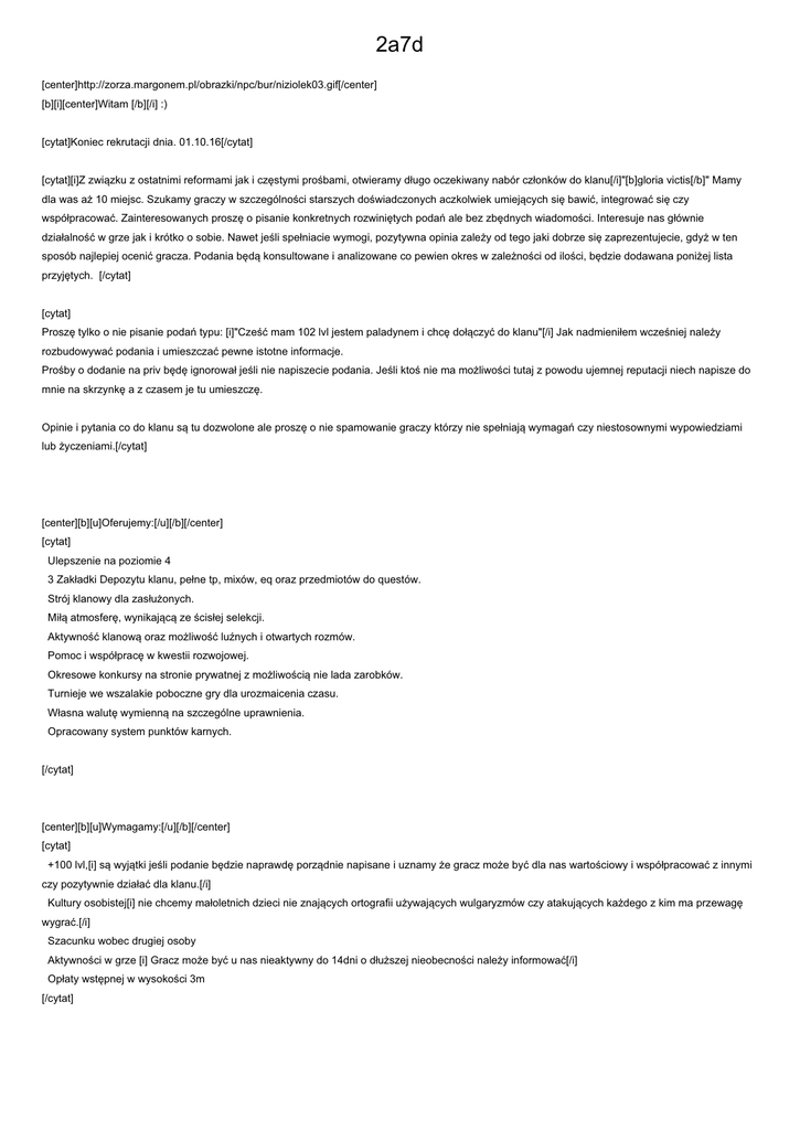 2a7d [center]http://zorza.margonem.pl/obrazki/npc/bur/niziolek03.gif[/center] [b][i][center]Witam [/b][/i] :) [cytat]Koniec rekrutacji dnia. 01.10.16[/cytat] [cytat][i]Z związku z ostatnimi reformami jak i częstymi prośbami, otwieramy długo oczekiwany nabór członków do klanu[/i]"[b]gloria victis[/b]" Mamy dla was aż 10 miejsc. Szukamy graczy w szczególności starszych doświadczonych aczkolwiek umiejących się bawić, integrować się czy współpracować. Zainteresowanych proszę o pisanie konkretnych rozwiniętych podań ale bez zbędnych wiadomości. Interesuje nas głównie działalność w grze jak i krótko o sobie. Nawet jeśli spełniacie wymogi, pozytywna opinia zależy od tego jaki dobrze się zaprezentujecie, gdyż w ten sposób najlepiej ocenić gracza. Podania będą konsultowane i analizowane co pewien okres w zależności od ilości, będzie dodawana poniżej lista przyjętych. [/cytat] [cytat] Proszę tylko o nie pisanie podań typu: [i]"Cześć mam 102 lvl jestem paladynem i chcę dołączyć do klanu"[/i] Jak nadmieniłem wcześniej należy rozbudowywać podania i umieszczać pewne istotne informacje. Prośby o dodanie na priv będę ignorował jeśli nie napiszecie podania. Jeśli ktoś nie ma możliwości tutaj z powodu ujemnej reputacji niech napisze do mnie na skrzynkę a z czasem je tu umieszczę. Opinie i pytania co do klanu są tu dozwolone ale proszę o nie spamowanie graczy którzy nie spełniają wymagań czy niestosownymi wypowiedziami lub życzeniami.[/cytat] [center][b][u]Oferujemy:[/u][/b][/center] [cytat] Ulepszenie na poziomie 4 3 Zakładki Depozytu klanu, pełne tp, mixów, eq oraz przedmiotów do questów. Strój klanowy dla zasłużonych. Miłą atmosferę, wynikającą ze ścisłej selekcji. Aktywność klanową oraz możliwość luźnych i otwartych rozmów. Pomoc i współpracę w kwestii rozwojowej. Okresowe konkursy na stronie prywatnej z możliwością nie lada zarobków. Turnieje we wszalakie poboczne gry dla urozmaicenia czasu. Własna walutę wymienną na szczególne uprawnienia. Opracowany system punktów karnych. [/cytat] [center][b][u]Wymagamy:[/u][/b][/center] [cytat] +100 lvl,[i] są wyjątki jeśli podanie będzie naprawdę porządnie napisane i uznamy że gracz może być dla nas wartościowy i współpracować z innymi czy pozytywnie działać dla klanu.[/i] Kultury osobistej[i] nie chcemy małoletnich dzieci nie znających ortografii używających wulgaryzmów czy atakujących każdego z kim ma przewagę wygrać.[/i] Szacunku wobec drugiej osoby Aktywności w grze [i] Gracz może być u nas nieaktywny do 14dni o dłuższej nieobecności należy informować[/i] Opłaty wstępnej w wysokości 3m [/cytat] ˘ POWODZENIA ˘˘[/center] Zrodlo: http://wklej.se/2a7d