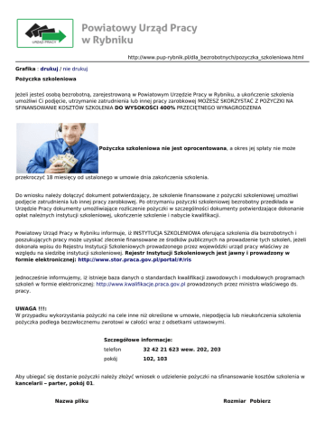 http://www.pup-rybnik.pl/dla_bezrobotnych/pozyczka_szkoleniowa.html Grafika : drukuj / nie drukuj Pożyczka szkoleniowa Jeżeli jesteś osobą bezrobotną, zarejestrowaną w Powiatowym Urzędzie Pracy w Rybniku, a ukończenie szkolenia umożliwi Ci podjęcie, utrzymanie zatrudnienia lub innej pracy zarobkowej MOŻESZ SKORZYSTAĆ Z POŻYCZKI NA SFINANSOWANIE KOSZTÓW SZKOLENIA DO WYSOKOŚCI 400% PRZECIĘTNEGO WYNAGRODZENIA Pożyczka szkoleniowa nie jest oprocentowana, a okres jej spłaty nie może przekroczyć 18 miesięcy od ustalonego w umowie dnia zakończenia szkolenia. Do wniosku należy dołączyć dokument potwierdzający, że szkolenie finansowane z pożyczki szkoleniowej umożliwi podjęcie zatrudnienia lub innej pracy zarobkowej. Po otrzymaniu pożyczki szkoleniowej bezrobotny przedkłada w Urzędzie Pracy dokumenty umożliwiające rozliczenie pożyczki w szczególności dokumenty potwierdzające dokonanie opłat należnych instytucji szkoleniowej, ukończenie szkolenie i nabycie kwalifikacji. Powiatowy Urząd Pracy w Rybniku informuje, iż INSTYTUCJA SZKOLENIOWA oferująca szkolenia dla bezrobotnych i poszukujących pracy może uzyskać zlecenie finansowane ze środków publicznych na prowadzenie tych szkoleń, jeżeli dokonała wpisu do Rejestru Instytucji Szkoleniowych prowadzonego przez wojewódzki urząd pracy właściwy ze względu na siedzibę instytucji szkoleniowej. Rejestr Instytucji Szkoleniowych jest jawny i prowadzony w formie elektronicznej: http://www.stor.praca.gov.pl/portal/#/ris Jednocześnie informujemy, iż istnieje baza danych o standardach kwalifikacji zawodowych i modułowych programach szkoleń w formie elektronicznej: http://www.kwalifikacje.praca.gov.pl prowadzonych przez ministra właściwego ds. pracy. UWAGA !!!: W przypadku wykorzystania pożyczki na cele inne niż określone w umowie, niepodjęcia lub nieukończenia szkolenia pożyczka podlega bezzwłocznemu zwrotowi w całości wraz z odsetkami ustawowymi. Szczegółowe informacje: telefon 32 42 21 623 wew. 202, 203 pokój 102, 103 Aby ubiegać się dostanie pożyczki należy złożyć wniosek o udzielenie pożyczki na sfinansowanie kosztów szkolenia w kancelarii – parter, pokój 01. Nazwa pliku Rozmiar Pobierz Kategoria: Pożyczka szkoleniowa [ 1 ] Wniosek o udzielenie pożyczki na sfinansowanie kosztów szkolenia 92KB pobierz