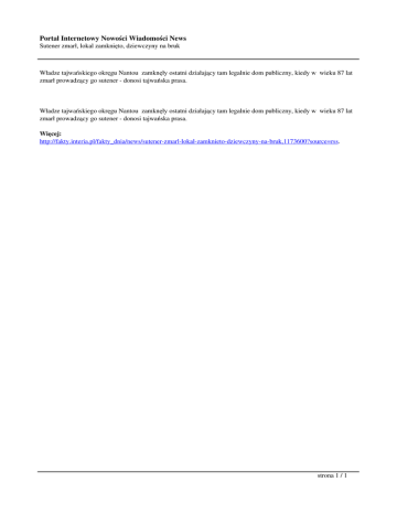 Portal Internetowy Nowości Wiadomości News Sutener zmarł, lokal zamknięto, dziewczyny na bruk Władze tajwańskiego okręgu Nantou zamknęły ostatni działający tam legalnie dom publiczny, kiedy w wieku 87 lat zmarł prowadzący go sutener - donosi tajwańska prasa. Władze tajwańskiego okręgu Nantou zamknęły ostatni działający tam legalnie dom publiczny, kiedy w wieku 87 lat zmarł prowadzący go sutener - donosi tajwańska prasa. Więcej: http://fakty.interia.pl/fakty_dnia/news/sutener-zmarl-lokal-zamknieto-dziewczyny-na-bruk,1173600?source=rss. strona 1 / 1