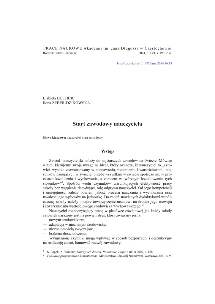PRACE NAUKOWE Akademii i m. Jana Długosza w Częstochowie Rocznik Polsko-Ukraiński 2014, t. XVI, s. 193–206 http://dx.doi.org/10.16926/rpu.2014.16.13 Elżbieta BUCHCIC Ilona ŻEBER-DZIKOWSKA Start zawodowy nauczyciela Słowa kluczowe: nauczyciel, start zawodowy. Wstęp Zawód nauczycielski należy do najstarszych zawodów na świecie. Mówiąc o nim, kierujemy swoją uwagę na ideał, który oznacza, iż nauczyciel to „człowiek wysoko zaawansowany w poznawaniu, rozumieniu i wartościowaniu stosunków panujących w świecie, przede wszystkim w świecie społecznym, w procesach kształcenia i wychowania, a zarazem w twórczym kształtowaniu tych stosunków”1. Spośród wielu czynników warunkujących efektywność pracy szkoły bez wątpienia decydującą rolę odgrywa nauczyciel. Od jego kompetencji i umiejętności zależy bowiem jakość procesu nauczania i wychowania oraz trwałość jego wpływów na jednostkę. Do zadań stawianych dydaktykowi współczesnej szkoły należy „mądre towarzyszenie uczniowi na drodze jego rozwoju i stwarzanie mu wartościowego środowiska wychowawczego”2. Nauczyciel rozpoczynający pracę w placówce oświatowej jak każdy młody człowiek narażony jest na pewien stres, który związany jest z: — nowym środowiskiem, — adaptacją w nieznanym środowisku, — nieznajomością zwyczajów, — brakiem doświadczenia. Wymienione czynniki mogą wpływać w sposób bezpośredni i destrukcyjny na realizację zadań, hamować rozwój zawodowy. 1 2 S. Popek, A. Winiarz, Nauczyciel. Zawód. Powołanie. Pasja, Lublin 2009, s. 158. Podstawa programowa z komentarzami, Ministerstwo Edukacji Narodowej, Warszawa 2001, s. 9. 194 Elżbieta BUCHCIC, Ilona ŻEBER-DZIKOWSKA Przygotowanie zawodowe młodego nauczyciela nie kończy się, gdy opuszcza on mury uczelni. Przeciwnie, pogłębia się ono i trwa nadal w toku wykonywania pracy, i dlatego przed jego zwierzchnikiem staje specyficzne zadanie – studiowanie sytuacji młodych nauczycieli i przemyślane, racjonalne wprowadzenie ich do zawodu. Myśl ta nie jest nowa, coraz wyraźniej podkreśla się bowiem wychowawcze funkcje wszelkich zakładów pracy wobec pracowników. Otóż szkoła musi być także placówką, która podejmie trud dalszego kształtowania i zawodowego wychowywania początkującego pedagoga, a trudność powszechnego przyjęcia tej fazy wynika stąd, że przywykliśmy dostrzegać wychowawcze funkcje szkoły skierowane na młodzież i dzieci, natomiast propozycja wychowywania w szkole samych wychowawców może się wydawać szokująca, co nie zmniejsza jej słuszności. Dlaczego ludzie zostają nauczycielami? Zawód nauczyciela jest sam w sobie zajęciem specyficznym, a zarazem jednym z najpiękniejszych i najbardziej fascynujących. Ludzie wybierają tę profesję z wielu powodów, najczęściej z pobudek wewnętrznych. Niewiele osób robi to dla pieniędzy. Wielu decyduje się uczyć, ponieważ w szkole szło im znakomicie: odnosili sukcesy, a profesorzy w większości ich lubili. Tacy ludzie, zanim jeszcze ukończą szkołę, stwierdzają, że nauczanie jest w sam raz dla nich. Dla niektórych wszak powody są dokładnie odwrotne. Udało im się przetrwać szkołę, ale to nie był miły czas. Uważają, że potrafią wywiązać się z tego zadania lepiej niż dydaktycy, którzy ich uczyli. Czasami w szkole było im tak źle, że w zawodzie nauczycielskim startują z determinacją, by traktować swoich uczniów sprawiedliwie, a w szczególności stawać w obronie skrzywdzonych przez los. Większość początkujących pedagogów jest przepełniona ideałami, chce dokonać zmian na lepsze. Powody decyzji, by rozpocząć pracę w tym zawodzie, znacząco wpływają na to, jak dany nauczyciel będzie postrzegał siebie w nowej roli i co myślał o swoich uczniach, kolegach z pracy i rodzicach. Od tych powodów zależy, czy rozczaruje się i jak bardzo będzie narażony na stres. Jak podaje Sue Roffey, motywacje nauczycieli do uczenia opierają się na: – Oświata to sposób, by świat stał się lepszy. – Uwielbienie swojego przedmiotu. – Nauczanie to zawód, dzięki któremu można zrobić coś dla innych. – Zawsze chciałem(am) być nauczycielem. – Tradycja rodzinna – członkowie mojej rodziny są nauczycielami – znam się na tym. – Ludzie podziwiają i szanują nauczycieli. – Chęć i radość z przebywania z dziećmi. – Sam(a) mam w sobie coś z dziecka. – Komunikatywność. Start zawodowy nauczyciela – – – – – – – 195 Potrzeba pokazania swojej kreatywności. Dobrze zorganizowany(a) i pewny(a) siebie. Będę w tym dobry(a). Uwielbiam wyzwania. Podoba mi się czas pracy i wakacje. Tę pracę mogę pogodzić ze swoim życiem rodzinnym. To stała praca ze stałymi dochodami. Uczyć można wszędzie3. Potencjalnie wszystkie te rodzaje motywacji mają pozytywne i negatywne strony. Ludzie, którzy zostali nauczycielami, bo nie wiedzieli, czym innym się zająć, mogą odkryć, że to rzeczywiście jest ich powołanie. Wobec braku większych oczekiwań także i rozczarowanie może być mniejsze. Pedagodzy, którzy sami po części są dziećmi, mogą mieć doskonały kontakt z uczniami, ale tylko na pewnym poziomie – zaprowadzenie koniecznego porządku w klasie może przychodzić im z trudnością. Ci, którzy decydują się na nauczycielstwo ze względu na długie wakacje, mają być może bardziej wyważony stosunek do życia, ale będą musieli pilnować swego zaangażowania w czasie roku szkolnego, tak żeby dobrze wykonywać swoją pracę. Komunikatywni ludzie mogą być znakomitymi mówcami, ale muszą nauczyć się słuchać innych. Istnieją dwa rodzaje motywacji, które są szczególnie pomocne w klasie. Reakcja uczniów na nauczanie będzie lepsza, jeśli to, co robi nauczyciel, robi z pasją – zwłaszcza jeżeli umiejętnie potrafi okazać swój entuzjazm. Drugi ważny rodzaj motywacji to autentyczne zainteresowanie sprawami uczniów – darz