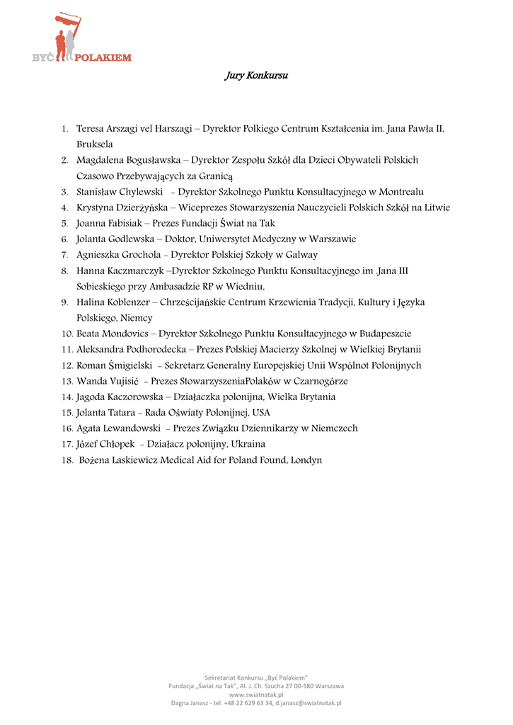 Jury Konkursu 1. Teresa Arszagi vel Harszagi – Dyrektor Polkiego Centrum Kształcenia im. Jana Pawła II, Bruksela 2. Magdalena Bogusławska – Dyrektor Zespołu Szkół dla Dzieci Obywateli Polskich Czasowo Przebywających za Granicą 3. Stanisław Chylewski - Dyrektor Szkolnego Punktu Konsultacyjnego w Montrealu 4. Krystyna Dzierżyńska – Wiceprezes Stowarzyszenia Nauczycieli Polskich Szkół na Litwie 5. Joanna Fabisiak – Prezes Fundacji Świat na Tak 6. Jolanta Godlewska – Doktor, Uniwersytet Medyczny w Warszawie 7. Agnieszka Grochola - Dyrektor Polskiej Szkoły w Galway 8. Hanna Kaczmarczyk –Dyrektor Szkolnego Punktu Konsultacyjnego im .Jana III Sobieskiego przy Ambasadzie RP w Wiedniu, 9. Halina Koblenzer – Chrześcijańskie Centrum Krzewienia Tradycji, Kultury i Języka Polskiego, Niemcy 10. Beata Mondovics – Dyrektor Szkolnego Punktu Konsultacyjnego w Budapeszcie 11. Aleksandra Podhorodecka – Prezes Polskiej Macierzy Szkolnej w Wielkiej Brytanii 12. Roman Śmigielski - Sekretarz Generalny Europejskiej Unii Wspólnot Polonijnych 13. Wanda Vujisić - Prezes StowarzyszeniaPolaków w Czarnogórze 14. Jagoda Kaczorowska – Działaczka polonijna, Wielka Brytania 15. Jolanta Tatara - Rada Oświaty Polonijnej, USA 16. Agata Lewandowski - Prezes Związku Dziennikarzy w Niemczech 17. Józef Chłopek - Działacz polonijny, Ukraina 18. Bożena Laskiewicz Medical Aid for Poland Found, Londyn Sekretariat Konkursu „Być Polakiem” Fundacja „Świat na Tak”, Al. J. Ch. Szucha 27 00-580 Warszawa www.swiatnatak.pl Dagna Janasz - tel. +48 22 629 63 34, [email protected]