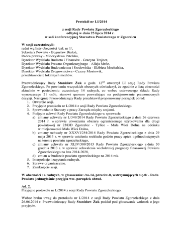 Protokół nr LI/2014 z sesji Rady Powiatu Zgorzeleckiego odbytej w dniu 25 lipca 2014 r. w sali konferencyjnej Starostwa Powiatowego w Zgorzelcu W sesji uczestniczyli: radni wg listy obecności /zał. nr 1/, Sekretarz Powiatu - Bogusław Białoń, Radca prawny - Mieczysława Patelska, Dyrektor Wydziału BudŜetu i Finansów - GraŜyna Trojner, Dyrektor Wydziału Prawno-Organizacyjnego - Alicja Mróz, Dyrektor Wydziału Budownictwa i Środowiska - ElŜbieta Mochalska, Dyrektor Wydziału Drogownictwa - Cezary Mostowik, przedstawiciele lokalnych mediów. Przewodniczący Rady Stanisław śuk o godz. 1210 otworzył LI sesję Rady Powiatu Zgorzeleckiego. Po powitaniu wszystkich obecnych oświadczył, Ŝe zgodnie z listą obecności aktualnie w posiedzeniu uczestniczy 14 radnych, co wobec ustawowego składu Rady wynoszącego 21 osób, stanowi quorum pozwalające na podejmowanie prawomocnych decyzji. Następnie Przewodniczący Rady przedstawił proponowany porządek obrad: 1. Otwarcie sesji. 2. Przyjęcie protokołu nr L/2014 z sesji Rady Powiatu Zgorzeleckiego. 3. Sprawozdanie Starosty z pracy Zarządu między sesjami. 4. Podjęcie uchwał Rady Powiatu Zgorzeleckiego w sprawach: a) zmiany uchwały nr L/349/2014 Rady Powiatu Zgorzeleckiego z dnia 26 czerwca 2014 r. w sprawie utworzenia obszaru ograniczonego uŜytkowania dla drogi powiatowej nr 2383D Zgorzelec - Tylice - Mała Wieś Dolna na odcinku w miejscowości Mała Wieś Dolna, b) zmiany uchwały nr XXXVI/254/2014 Rady Powiatu Zgorzeleckiego z dnia 29 maja 2013 r. w sprawie ustalenia rozkładu godzin pracy aptek ogólnodostępnych na terenie powiatu zgorzeleckiego, c) zmiany uchwały nr XLIV/309/2013 Rady Powiatu Zgorzeleckiego z dnia 30 grudnia 2013 r. w sprawie uchwalenia wieloletniej prognozy finansowej Powiatu Zgorzeleckiego na lata 2014-2028, d) zmian w budŜecie powiatu zgorzeleckiego na 2014 rok. 5. Interpelacje i zapytania radnych. 6. Sprawy organizacyjne. 7. Zamknięcie sesji. W obecności 14 radnych, w głosowaniu: /za-14, przeciw-0, wstrzymujących się-0/ - Rada Powiatu jednogłośnie przyjęła ww. porządek obrad. Ad. 2. Przyjęcie protokołu nr L/2014 z sesji Rady Powiatu Zgorzeleckiego. Wobec braku uwag do protokołu nr L/2014 z sesji Rady Powiatu Zgorzeleckiego z dnia 26.06.2014 r. Przewodniczący Rady Stanisław śuk poddał pod głosowanie wniosek o jego przyjęcie. W obecności 14 radnych, w głosowaniu: /za-14, przeciw-0, wstrzymujących się-0/ - Rada Powiatu jednogłośnie zatwierdziła ww. protokół. Ad. 3. Sprawozdanie Starosty z pracy Zarządu między sesjami. Wiceprzewodniczący Rady Andrzej Tyc poprosił o udzielenie informacji czego dotyczyło spotkanie ze Starostą Berndtem Lange. Starosta Artur Bieliński poinformował, iŜ jednym z tematów poruszanych na spotkaniu, które odbyło się w Görlitz w dniu 21 lipca br. była budowa mostu Pieńsk-Deschka. Starosta Berndt Lange jest zaniepokojony tym, Ŝe realizacja tego zadania jest stale opóźniana przez stronę polską. Starosta Lange zapewnił, Ŝe strona niemiecka, a szczególnie przedstawiciele Saksonii będą zabiegali o to, aby ten most jak najszybciej został wybudowany i do tego czasu nie wyraŜą zgody na budowę jakiegokolwiek obiektu mostowego wzdłuŜ Odry i Nysy. Budowa mostu w Deschce stworzy moŜliwość aktywizacji północnej części powiatu Görlitz. Rozmowy dotyczyły takŜe planowanych remontów dróg przy dofinansowaniu ze środków EWT. Niemcy przyjęli zasadę, Ŝe całość środków, które mają być pozyskane z EWT na przyszły okres programowania będzie przeznaczona na drogi lokalne (gminne i powiatowe). Niestety na Dolnym Śląsku i w Polsce przyjęto odmienną filozofię - głównym załoŜeniem jest remont dróg wojewódzkich. W związku z tym w bardzo ograniczonym zakresie środki te będą mogły trafić do powiatów czy gmin. Z informacji uzyskanych od przedstawicieli Dolnośląskiej SłuŜby Dróg i Kolei we Wrocławiu wynika, iŜ został zaplanowany remont drogi Ruszów - Stary Węgliniec, a następnie odcinek drogi w Jagodzinie w kierunku Pieńska. Rozpatrywana jest równieŜ koncepcja budowy w ogóle nowego odcinka drogi, który miałby omijać śarki n/Nysą, Jędrzychowice i Lasów oraz remont drogi biegnącej z Zatonia w kierunku łącznika autostradowego. Kolejny temat dotyczył połączeń kolejowych. W przyszłym tygodniu rozpoczną się rozmowy polsko-czesko-niemieckie dotyczące linii kolejowej Zittau-Hradek i zawarcia umowy międzynarodowej na temat eksploatacji tej linii kolejowej przez Czechów lub Niemców. Kolejna omawiana kwestia dotyczyła elektryfikacji odcinka linii kolejowej Węgliniec - Zgorzelec. Do końca tego roku strona niemiecka ma teŜ określić dwa elementy: elektryfikację linii kolejowej, która wchodzi w skład korytarza E-30, tj. Görlitz - Drezno oraz elektryfikację odcinka Horka - Cottbus. Jest teŜ planowana modernizacja połączeń w kierunku Jeleniej Góry oraz okolic Lwówka i Lubania. Rozmowy dotyczyły teŜ innych mniej istotnych kwestii, m.in.: rajdu rowerowego oraz wspólnej organizacji triatlonu. Ponadto Starosta poinformował, Ŝe w listopadzie w Marienthalu odbędzie się konferencja poświęcona rocznicy stulecia wybuchu I wojny światowej. Radny Marek Kurzyński poprosił o udzielenie informacji pod jaką inwestycję wmurowano kamień węgielny w Elektrowni Turów. Starosta Artur Bieliński poinformował, iŜ kamień węgielny został wbudowany pod budowę instalacji odsiarczania spalin w Elektrowni Turów. Wobec braku innych uwag dotyczących sprawozdania Starosty z pracy Zarządu między sesjami Przewodniczący Rady Stanisław śuk poddał pod głosowanie wniosek o jego przyjęcie. W obecności 14 radnych, w głosowaniu: /za-14, przeciw-0, wstrzymujących się-0/ - Rada Powiatu jednogłośnie przyjęła ww. sprawozdanie. /Sprawozdanie stanowi załącznik nr 2 do niniejszego protokołu/. 2 Ad. 4a. Podjęcie uchwały Rady Powiatu Zgorzeleckiego w sprawie zmiany uchwały nr 