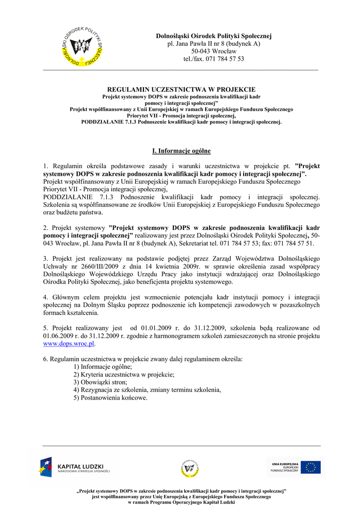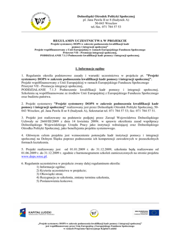 Dolnośląski Ośrodek Polityki Społecznej pl. Jana Pawła II nr 8 (budynek A) 50-043 Wrocław tel./fax. 071 784 57 53 __________________________________________________________________________________ REGULAMIN UCZESTNICTWA W PROJEKCIE Projekt systemowy DOPS w zakresie podnoszenia kwalifikacji kadr pomocy i integracji społecznej” Projekt współfinansowany z Unii Europejskiej w ramach Europejskiego Funduszu Społecznego Priorytet VII - Promocja integracji społecznej, PODDZIAŁANIE 7.1.3 Podnoszenie kwalifikacji kadr pomocy i integracji społecznej. I. Informacje ogólne 1. Regulamin określa podstawowe zasady i warunki uczestnictwa w projekcie pt. ”Projekt systemowy DOPS w zakresie podnoszenia kwalifikacji kadr pomocy i integracji społecznej”. Projekt współfinansowany z Unii Europejskiej w ramach Europejskiego Funduszu Społecznego Priorytet VII - Promocja integracji społecznej, PODDZIAŁANIE 7.1.3 Podnoszenie kwalifikacji kadr pomocy i integracji społecznej. Szkolenia są współfinansowane ze środków Unii Europejskiej z Europejskiego Funduszu Społecznego oraz budŜetu państwa. 2. Projekt systemowy ”Projekt systemowy DOPS w zakresie podnoszenia kwalifikacji kadr pomocy i integracji społecznej” realizowany jest przez Dolnośląski Ośrodek Polityki Społecznej, 50043 Wrocław, pl. Jana Pawła II nr 8 (budynek A), Sekretariat tel. 071 784 57 53; fax: 071 784 57 51. 3. Projekt jest realizowany na podstawie podjętej przez Zarząd Województwa Dolnośląskiego Uchwały nr 2660/III/2009 z dnia 14 kwietnia 2009r. w sprawie określenia zasad współpracy Dolnośląskiego Wojewódzkiego Urzędu Pracy jako instytucji wdraŜającej oraz Dolnośląskiego Ośrodka Polityki Społecznej, jako beneficjenta projektu systemowego. 4. Głównym celem projektu jest wzmocnienie potencjału kadr instytucji pomocy i integracji społecznej na Dolnym Śląsku poprzez podnoszenie ich kompetencji zawodowych w pozaszkolnych formach kształcenia. 5. Projekt realizowany jest od 01.01.2009 r. do 31.12.2009, szkolenia będą realizowane od 01.06.2009 r. do 31.12.2009 r. zgodnie z harmonogramem szkoleń zamieszczonych na stronie projektu www.dops.wroc.pl. 6. Regulamin uczestnictwa w projekcie zwany dalej regulaminem określa: 1) Informacje ogólne; 2) Kryteria uczestnictwa w projekcie; 3) Obowiązki stron; 4) Rezygnacja ze szkolenia, zmiany terminu szkolenia, 5) Postanowienia końcowe. „Projekt systemowy DOPS w zakresie podnoszenia kwalifikacji kadr pomocy i integracji społecznej” jest współfinansowany przez Unię Europejską z Europejskiego Funduszu Społecznego w ramach Programu Operacyjnego Kapitał Ludzki Dolnośląski Ośrodek Polityki Społecznej pl. Jana Pawła II nr 8 (budynek A) 50-043 Wrocław tel./fax. 071 784 57 53 __________________________________________________________________________________ II. Kryteria uczestnictwa w projekcie 1. Uczestnikami szkoleń mogą zostać: -pracownicy i wolontariusze Ośrodków Pomocy Społecznej -pracownicy i wolontariusze Powiatowych Centrów Pomocy Rodzinie -pracownicy i wolontariusze DOPS -pracownicy i wolontariusze ośrodków wsparcia -pracownicy i wolontariusze ośrodków interwencji kryzysowej -pracownicy i wolontariusze CIS i KIS -pracownicy i wolontariusze domów pomocy społecznej -pracownicy i wolontariusze placówek opiekuńczo-wychowawczych -pracownicy i wolontariusze domu dla matek z małoletnimi dziećmi i kobiet w ciąŜy -pracownicy i wolontariusze NGO z Dolnego Śląska działających w obszarze pomocy i integracji społecznej -inne słuŜby społeczne (np. pedagodzy, pielęgniarki środowiskowe, kuratorzy sądowi, psycholodzy, policjanci -pracownicy publicznych słuŜb społecznych 1. Przewiduje się, Ŝe wsparciem w ramach niniejszego projektu zostanie objętych 830 osób 2. Projekt realizowany jest zgodnie z zasadami polityki równych szans – oznacza to, Ŝe w planowanych szkoleniach mogą brać udział osoby bez względu na wiek, płeć, stopień niepełnosprawności oraz miejsce zamieszkania (miasto czy wieś). 3. Dla wyŜej wymienionych grup docelowych zostaną skierowane następujące formy wsparcia: I moduł: Szkolenia językowe, II moduł: Praca z rodziną, III moduł: Praca z osobą niepełnosprawną IV moduł: Praca z osobą starszą V moduł: Warsztaty rozwoju osobistego VI moduł: Budowanie i zarządzanie projektami EFS VII moduł: Instrumenty aktywnej integracji VIII moduł: Ekonomia Społeczna W ramach projektu planowane są równieŜ - seminaria jako fora wymiany doświadczeń, - warsztaty specjalistyczne w instytucjach wdraŜających aktywne formy wsparcia, - szkolenie z zakresu tworzenia i funkcjonowanie zespołów interdyscyplinarnych. Szczegółowy harmonogram szkoleń stanowi załącznik do Regulaminu. 4. Grupę docelową do której skierowany jest niniejszy projekt moŜna podzielić się na pięć kategorii: - kadra kierownicza oraz zespoły projektowe zarządzające projektami dofinansowanymi z EFS, - słuŜba finansowo-księgowa, - pracownicy socjalni, - pozostali pracownicy zatrudnieni w obszarze pomocy i integracji społecznej publicznych słuŜb zatrudnienia, - inne publiczne słuŜby społeczne. „Projekt systemowy DOPS w zakresie podnoszenia kwalifikacji kadr pomocy i integracji społecznej” jest współfinansowany przez Unię Europejską z Europejskiego Funduszu Społecznego w ramach Programu Operacyjnego Kapitał Ludzki Dolnośląski Ośrodek Polityki Społecznej pl. Jana Pawła II nr 8 (budynek A) 50-043 Wrocław tel./fax. 071 784 57 53 __________________________________________________________________________________ 5. Przed zgłoszeniem uczestnictwa w szkoleniu naleŜy dokładnie zapoznać się z niniejszym Regulaminem. 6. Nabór kandydatów do udziału w projekcie zostanie przeprowadzony w sposób otwarty, jawny na podstawie Formularzy Zgłoszeniowych zamieszczonych na stronie WWW i będzie zgodny z ustawą z dn. 29.08.97 roku o Ochronie Danych Osobowych Dz. Ust Nr 133 poz. 883. 7. Pro
